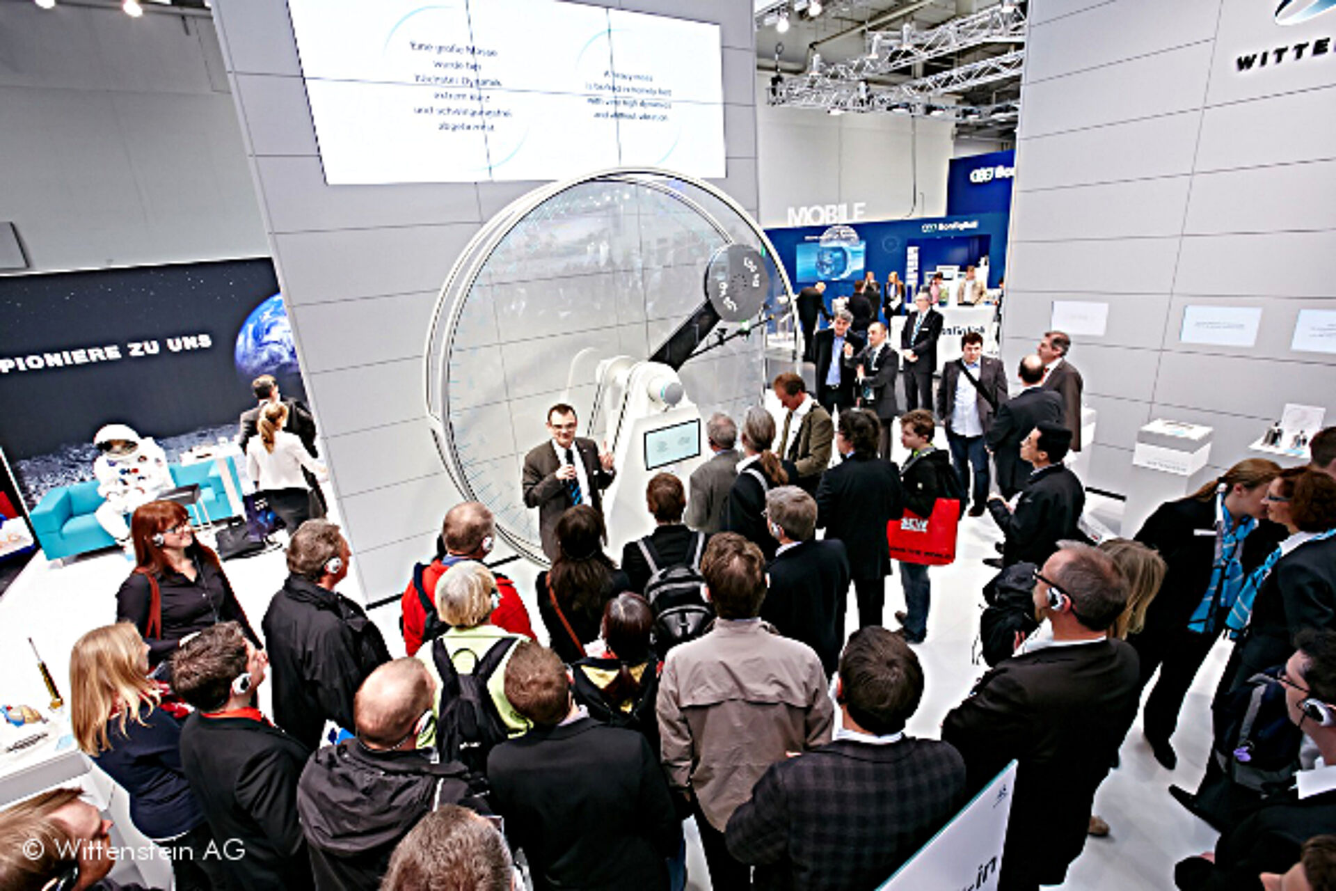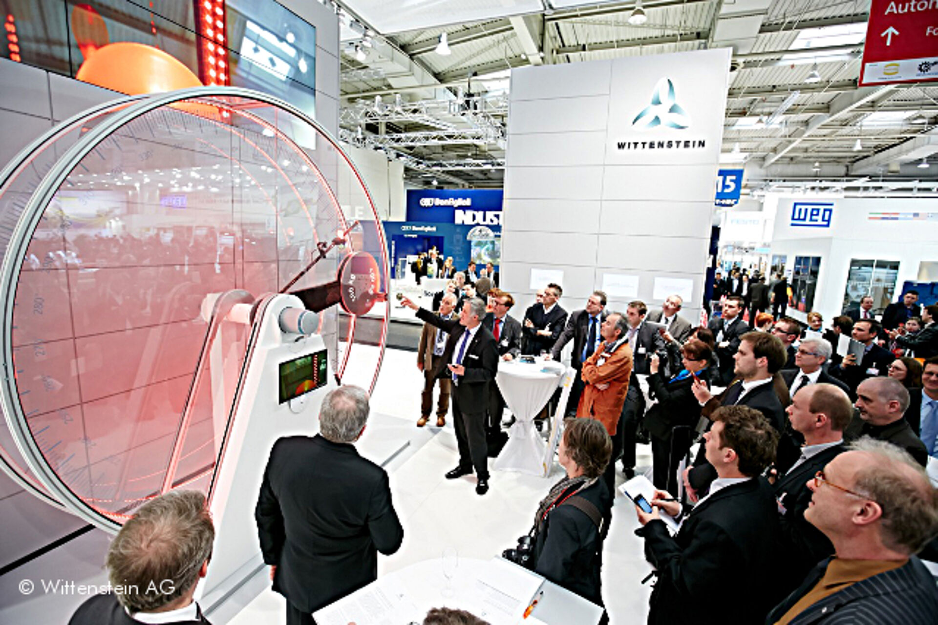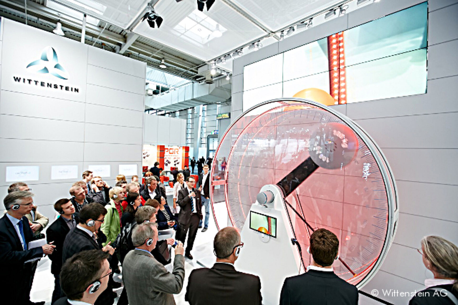 具有通信能力的机电驱动系统- 直 径约3 米的旋转模型,此115 公斤 重的旋转臂可以通过智能手机在高 度动 态中进行极迅速且无减速的制 动- 以展示机电一体化驱动系统安 全设计的各个方面。由此显示了安全性和可控性之 间的 因果关系,以及未来通信功能的电 驱动系统安全数据的重要性。参观 者可以通过智能手机或平板电脑对 智 能驱动系统进行控制。同时博览 会模型将不同位置和状态信息实时 发送到移动设备,并平行发送相应 的电子邮 件。