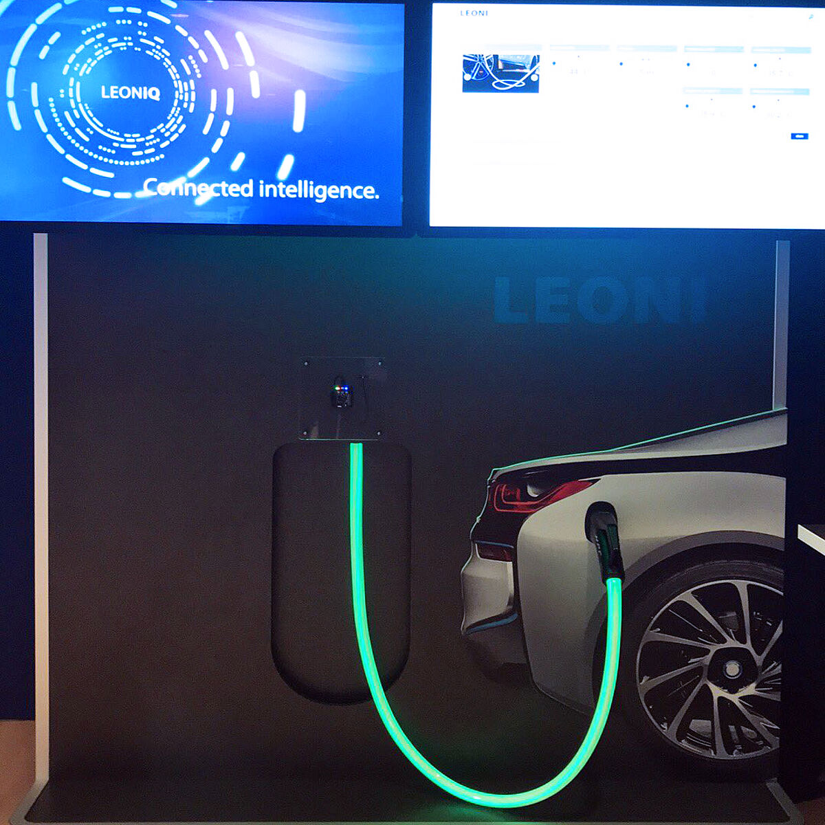 Leoni presented this technology to the public at the Microsoft stand at the Hanover Fair and IFA 2018 in Berlin. At the interactive charging station for e-vehicles, the intelligent cable displays its current status via integrated light lines. Overheating is displayed in red, while green is the normal state. The cable can be filmed with a thermal camera and the condition can be observed. Hüttinger designed, developed and manufactured the LEONiQ electric filling station.