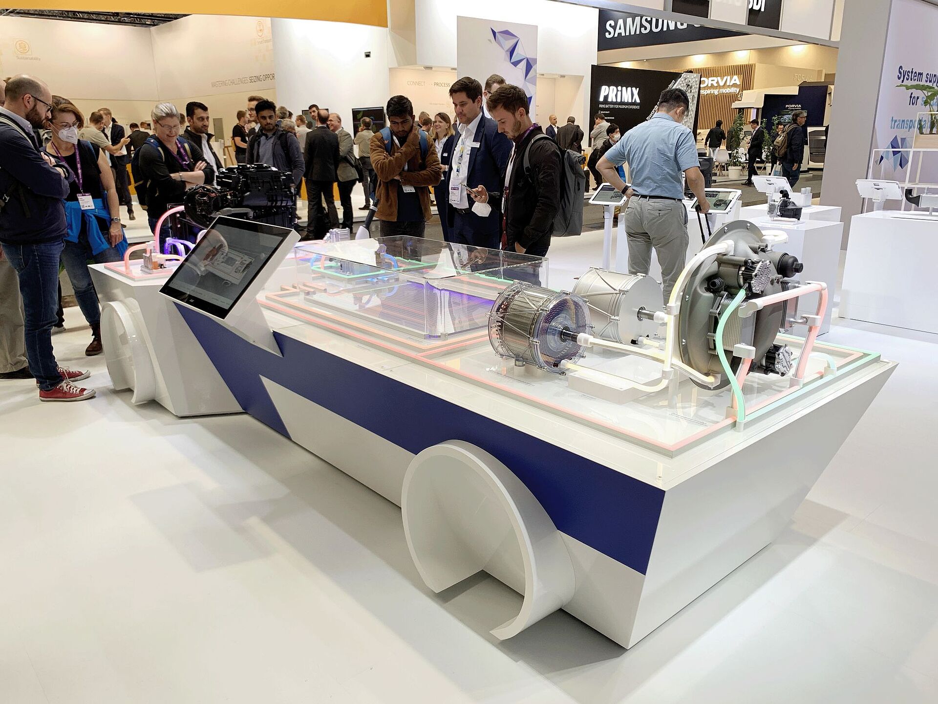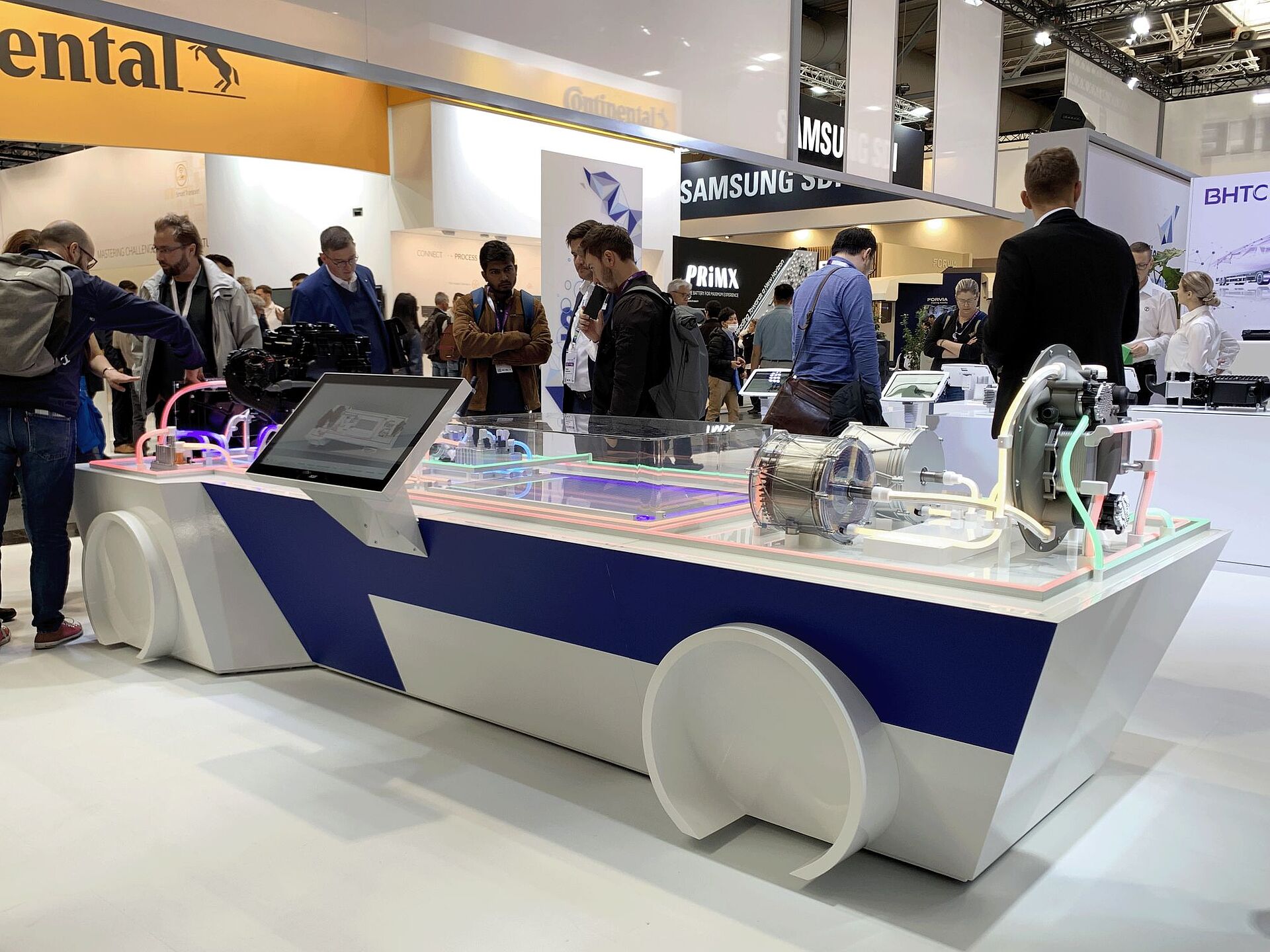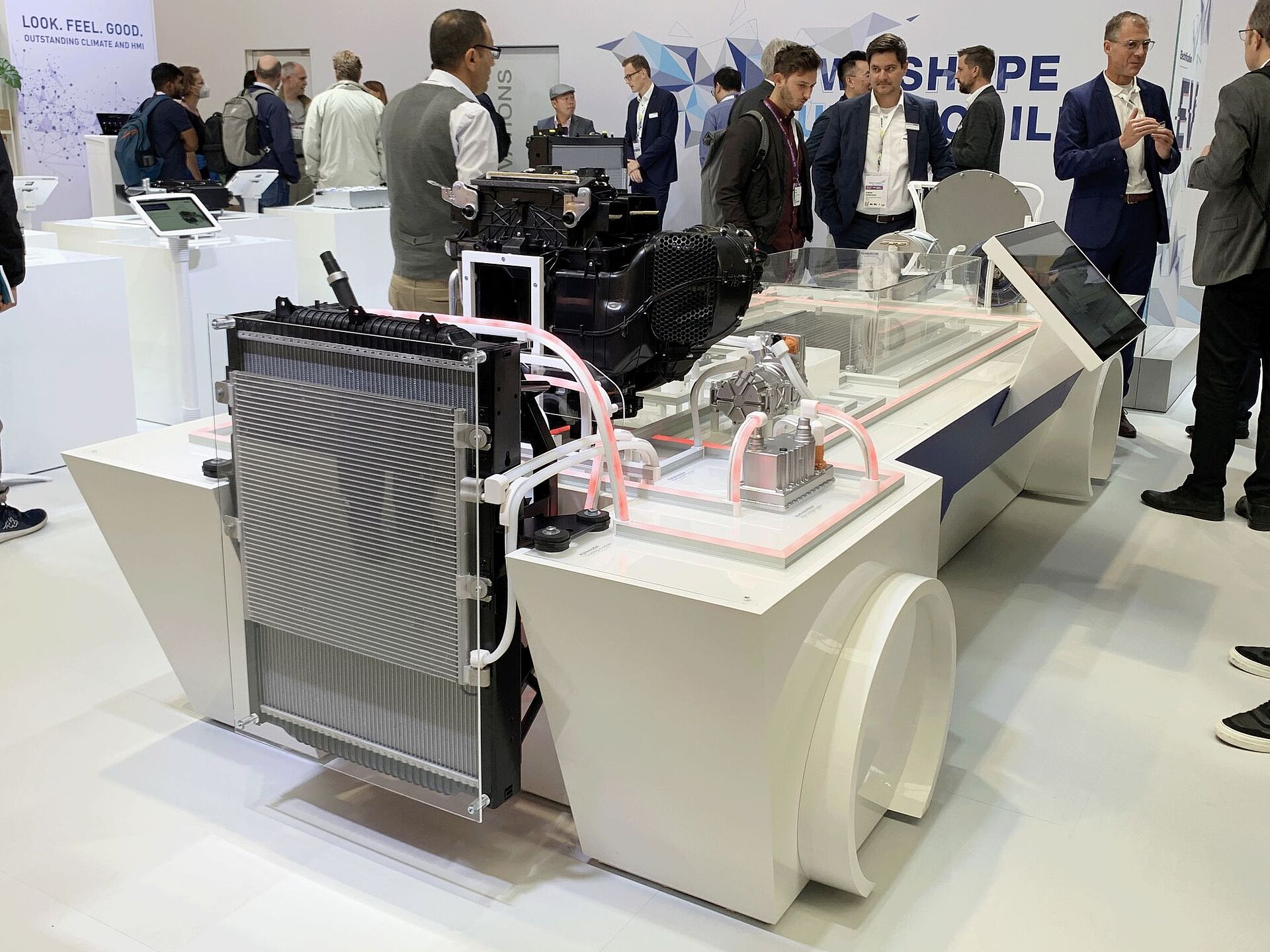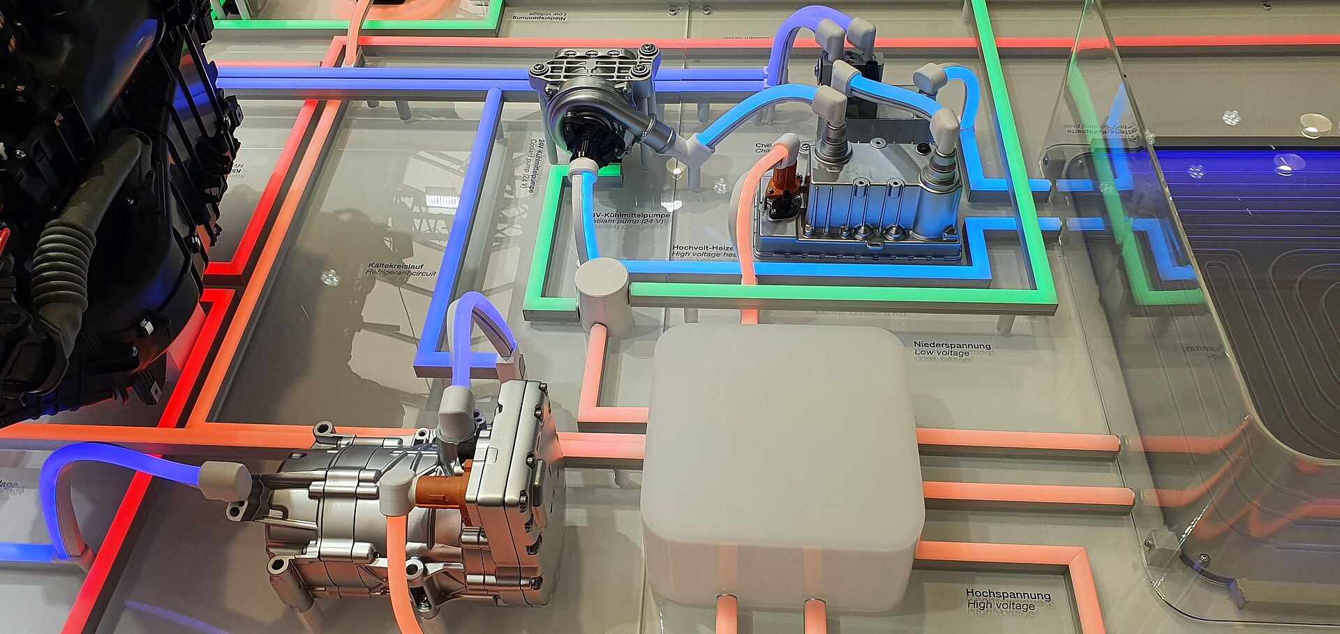 BEV主题岛展示了商用车领域的电池电动车技术的原始组件。LED流动灯被用来说明制冷电路、冷却剂电路、电源电路、油路和电池冷却的情景。