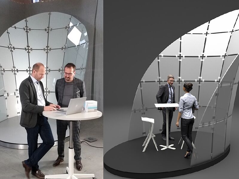 With this piece a glass object was created and produced, which had never existed before. It consists of a total of 38 panes of glass that are completely self-sufficient. This is because 244 high-precision stainless steel fittings were laminated into the 38 composite safety glass so no further steel components are needed for the assembly of the exhibit. The development of the project required six months of highly precise planning and extensive calculations. Altogether, the exhibit reaches a height of 4.5 m, a diameter of 3.5 m and an impressive weight of almost 1,400 kg. The exhibit initially premiered digitally in an Eastman Live Stream Event and according to current plans, the frameless glass construction will be presented at the glasstec trade fair in June 2021.