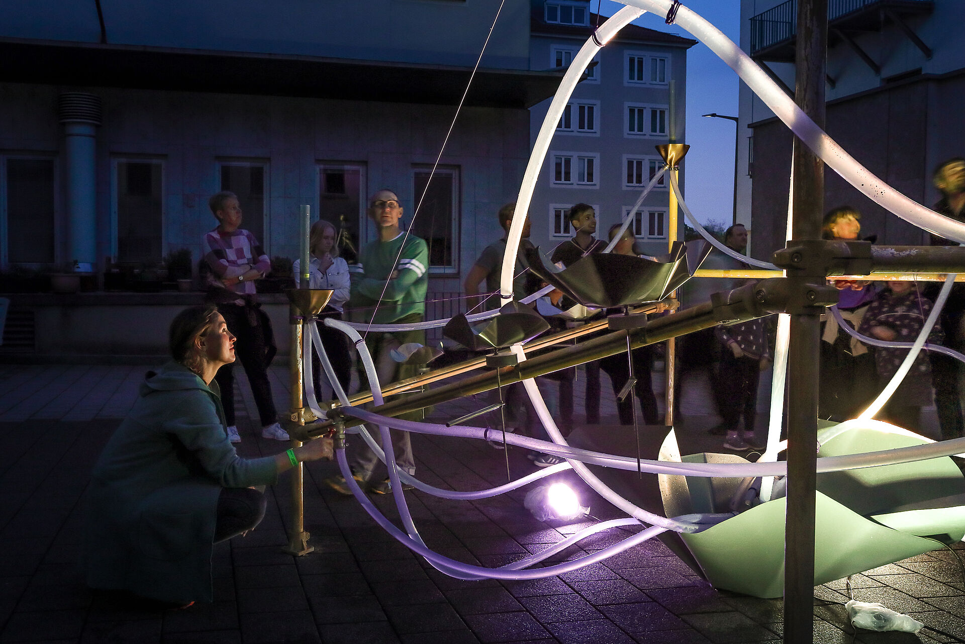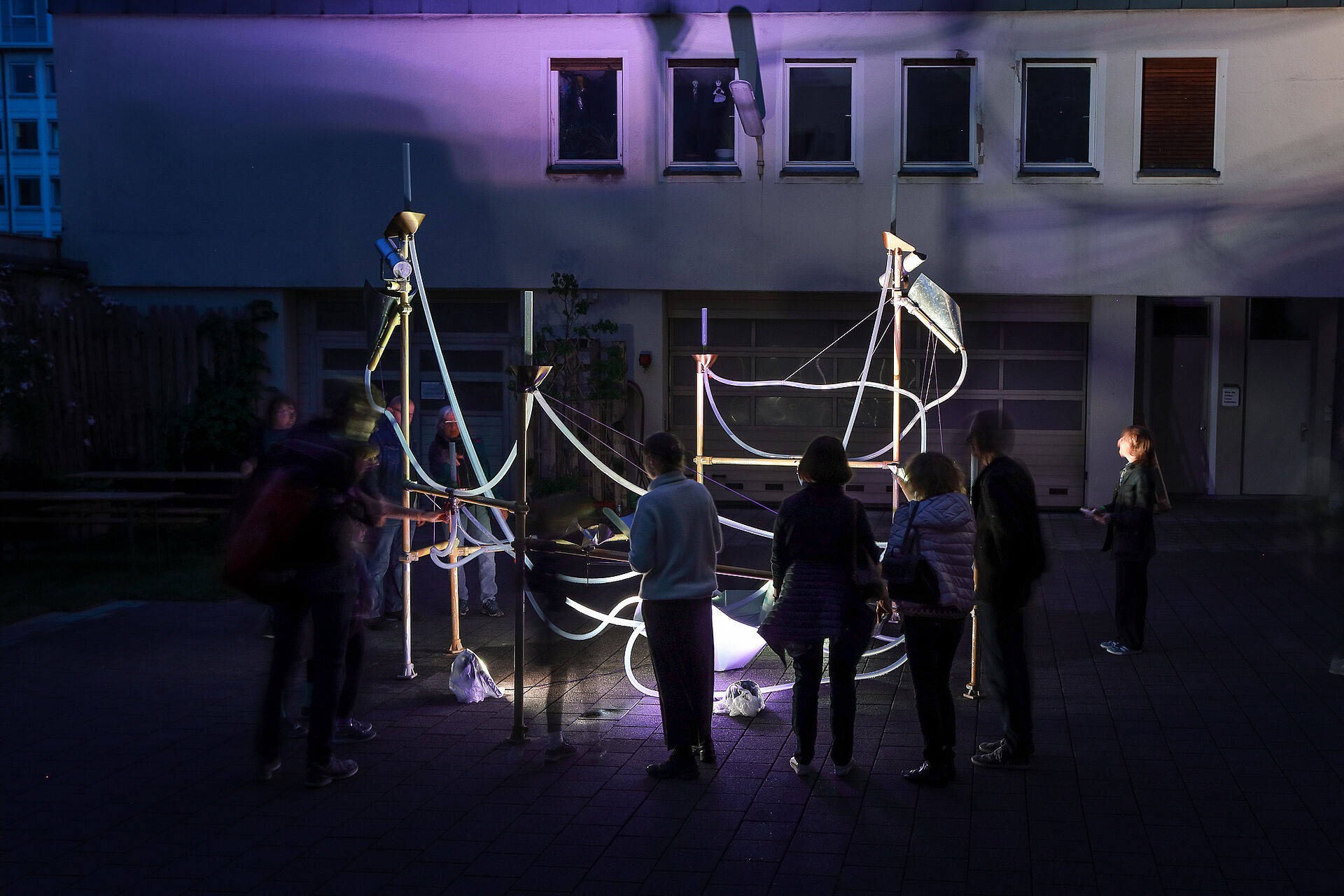 Following our artist-in-residence projects with Yanran Cao and Matthias Deeg, we again announced a scholarship for students of the Academy of Fine Arts in Nuremberg in October 2022. Our next artist-in-residence Theresa Hartmann's artwork 'our wet matters' premiered in the inner courtyard of the Hochbauamt der Stadt Nürnberg as part of the Blaue Nacht (lit. Blue Night of Art and Culture) on May 06, 2023.