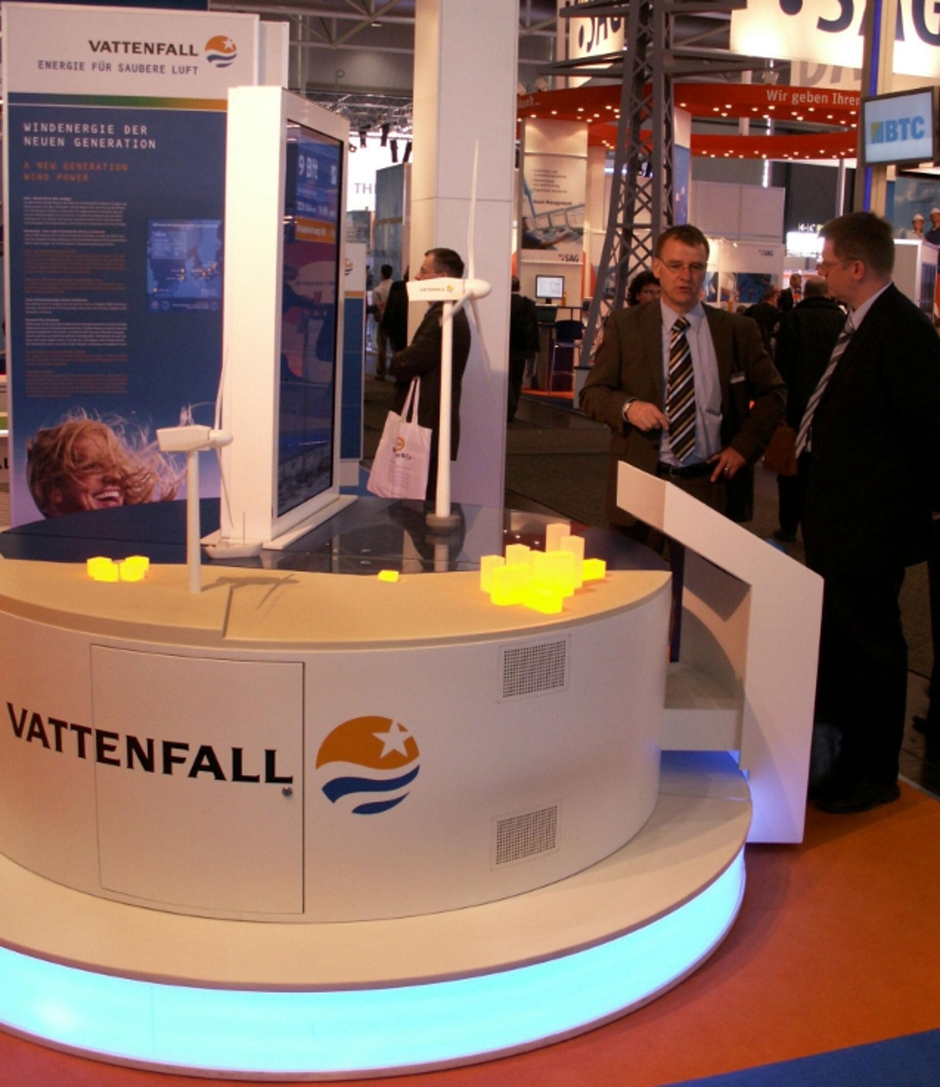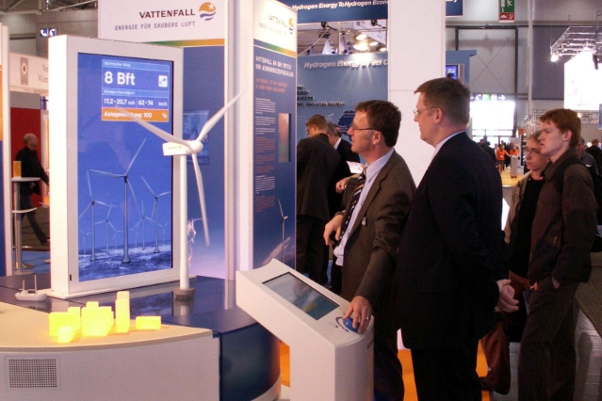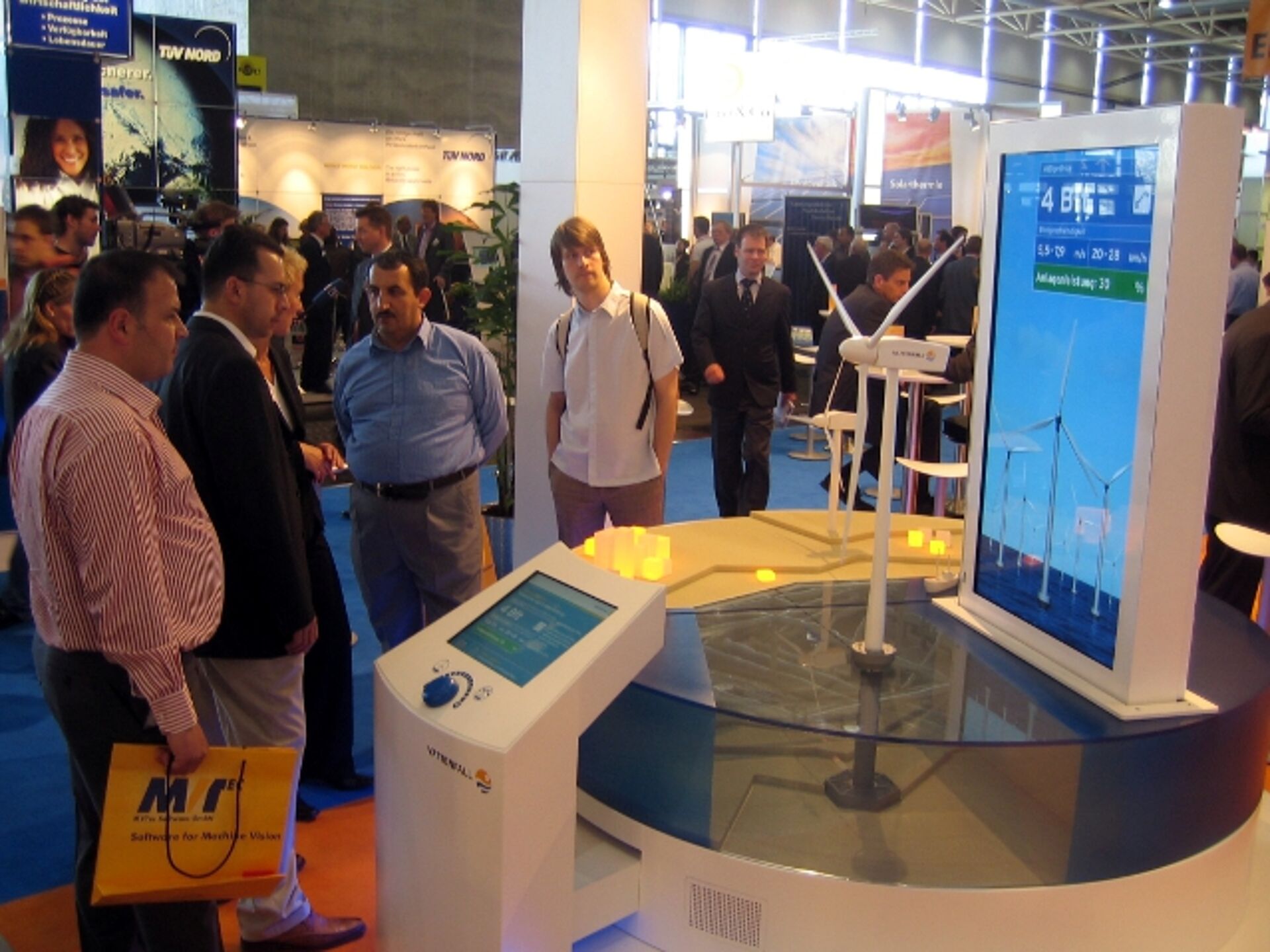 The offshore wind power exhibit premiered at the Hanover Fair in April 2007 and was presented to the trade public and the general public. Its modular design makes it very easy to transport and set up at other trade fairs and events. The exhibit shows how offshore wind power works at different wind speeds, the electrical connection of the turbines to the land, the wind turbine foundations in the sea and it illustrates the number of consumers that can be supplied with electricity at different wind speeds.