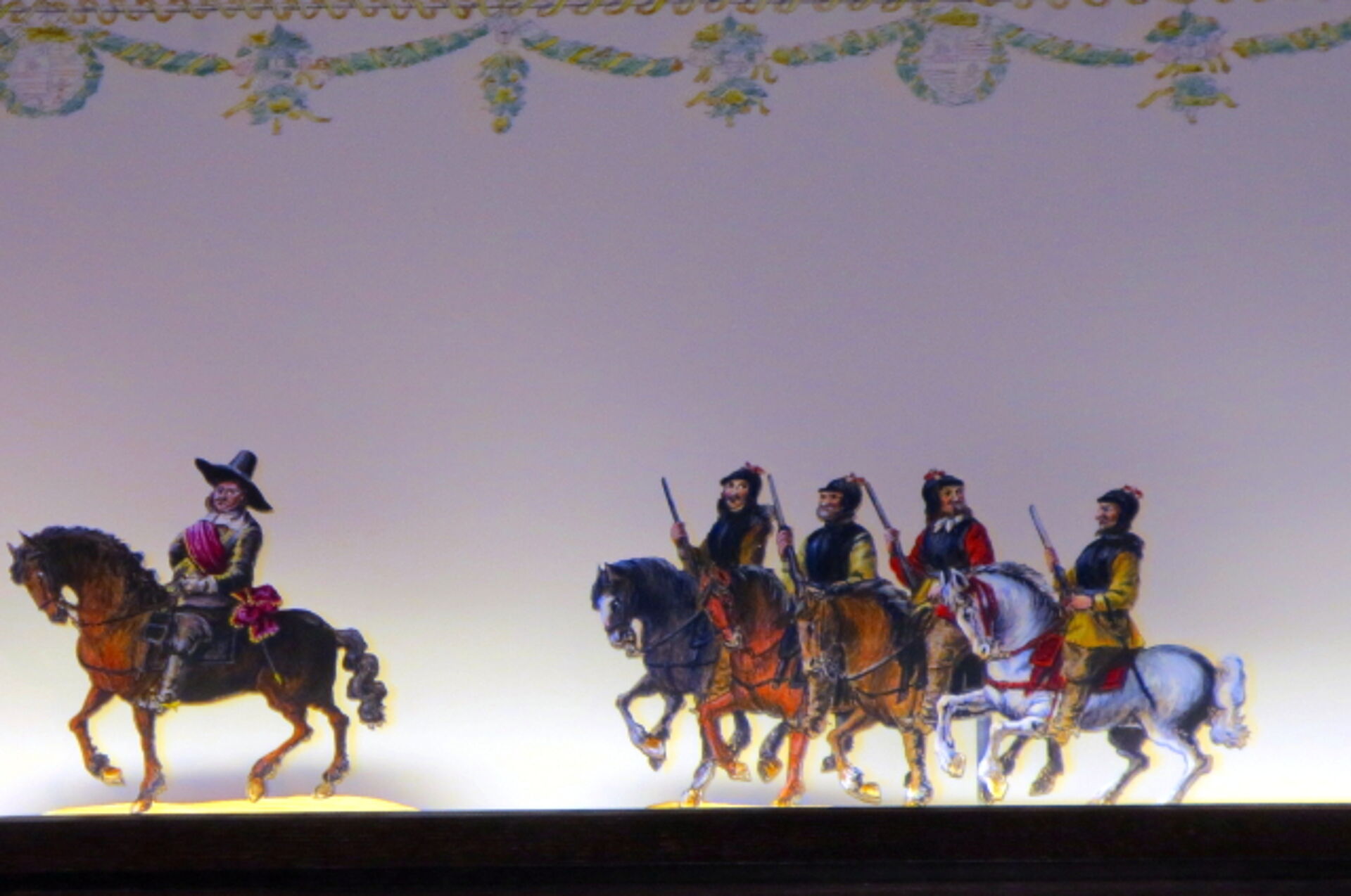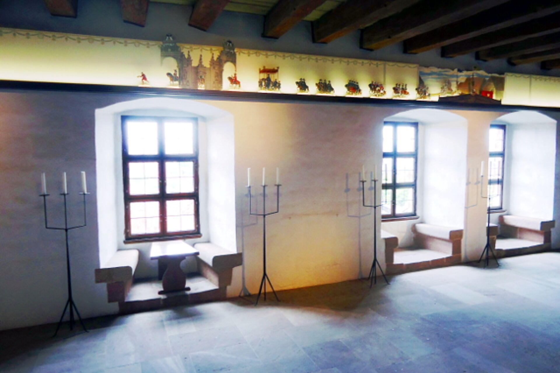 How it might look like when the emperor and his entourage arrived in Nuremberg one can now contemplate while visiting the Knights' Hall within the Imperial Castle: An object theatre mounted above the window frames, designed according to historical figures, shows such an entry accompanied by bell-ringing and festive music, moving from the Spittler Gate through the brightly decorated town up to the Imperial Castle.