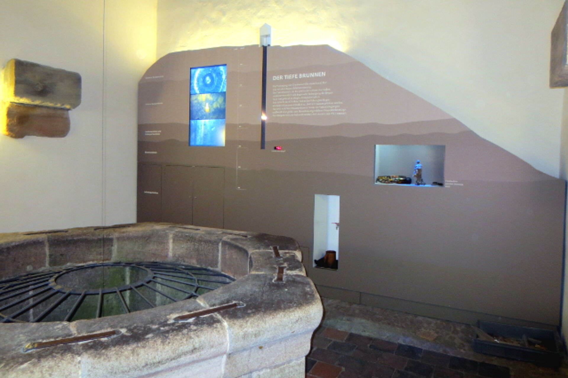 The Deep Well at the centre of the outer bailey was very probably created in its earliest building period to provide an independent water supply for the Castle. The shaft goes down nearly 50 metres deep into the castle rock. A film showing a descent into it, and a vivid guided tour, enable visitors to appreciate its depth.