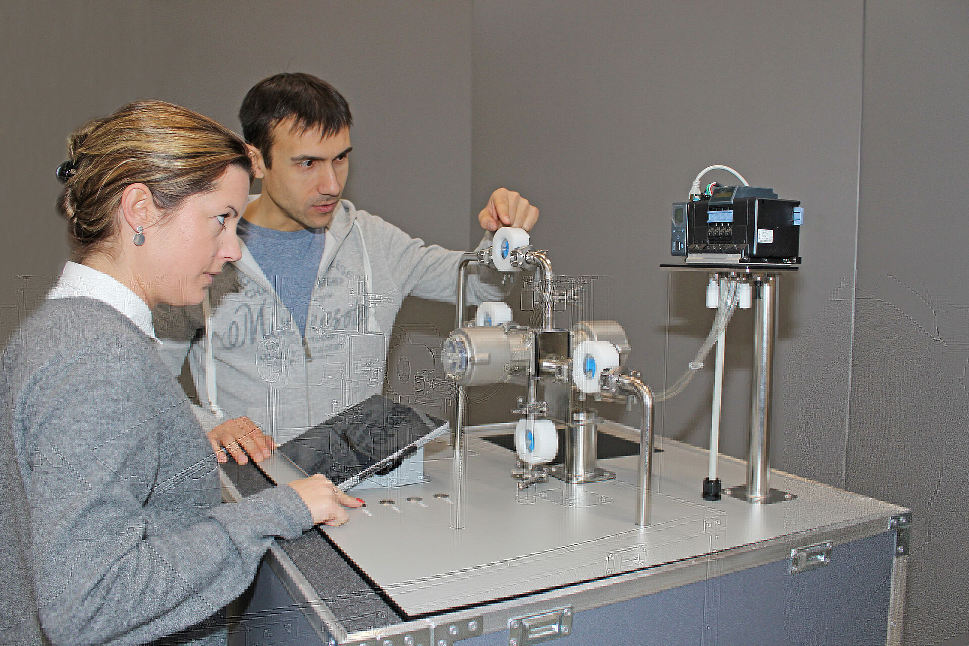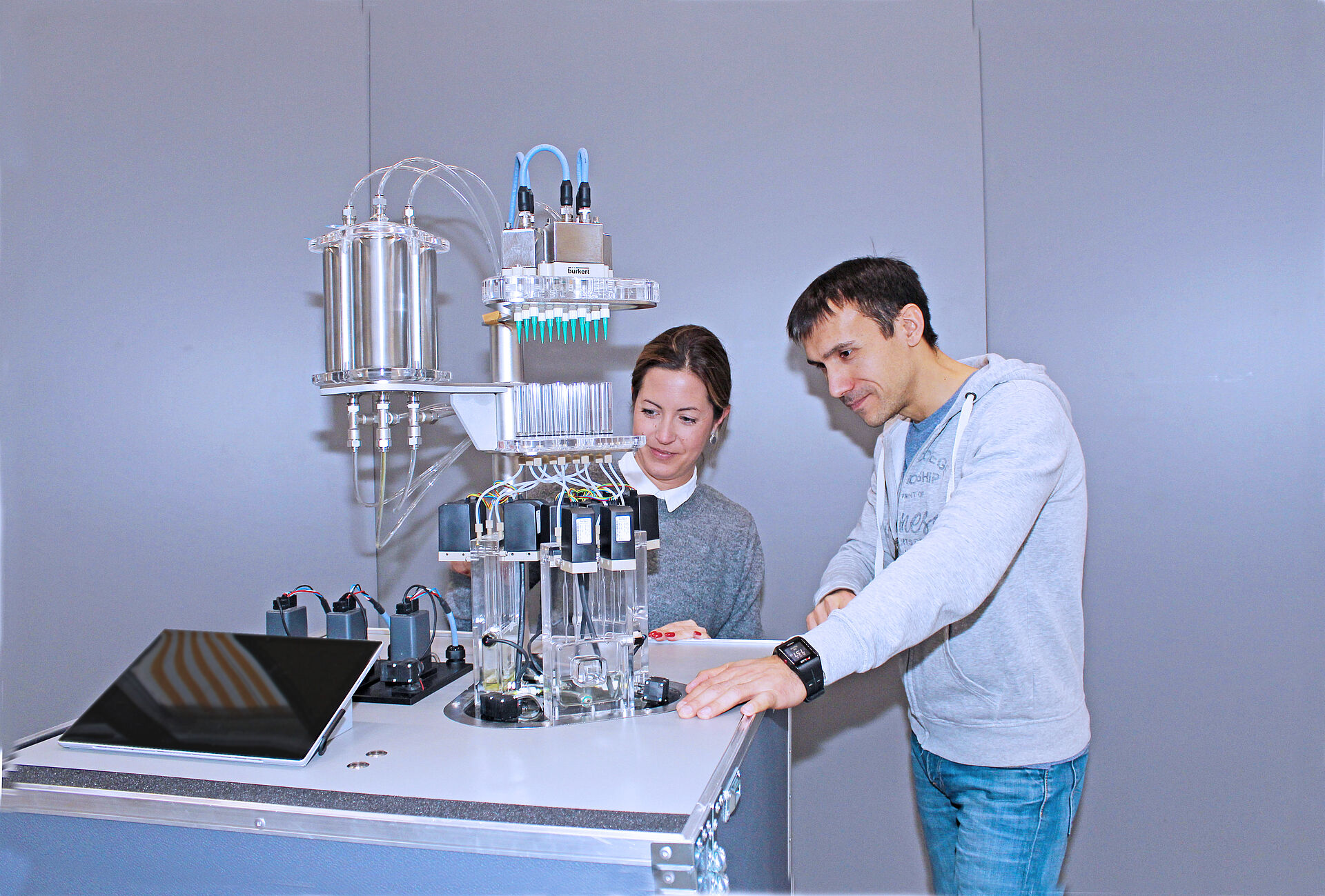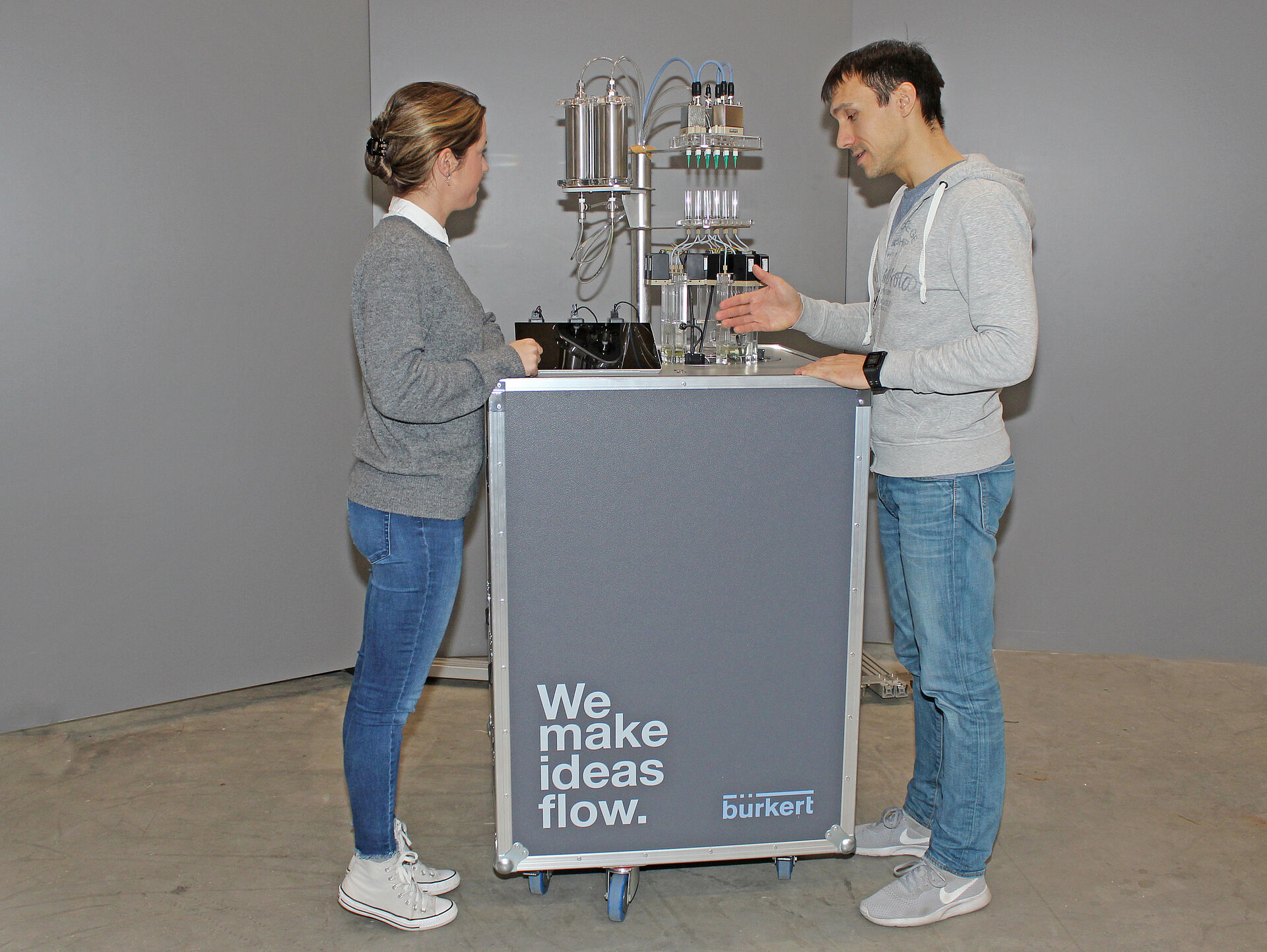 Development, design and fabrication of Application Machines, Blanketing System (Fermentation), Hands on FLOWave, Dosing Factory, Bioreactor, Turbidity System (Water 8905) and Robolux in motion, to showcase Bürkert's high-precision pressure controls for fluids, air mixtures and very small quantities of liquids - additional information is made available via accompanying touchpads.