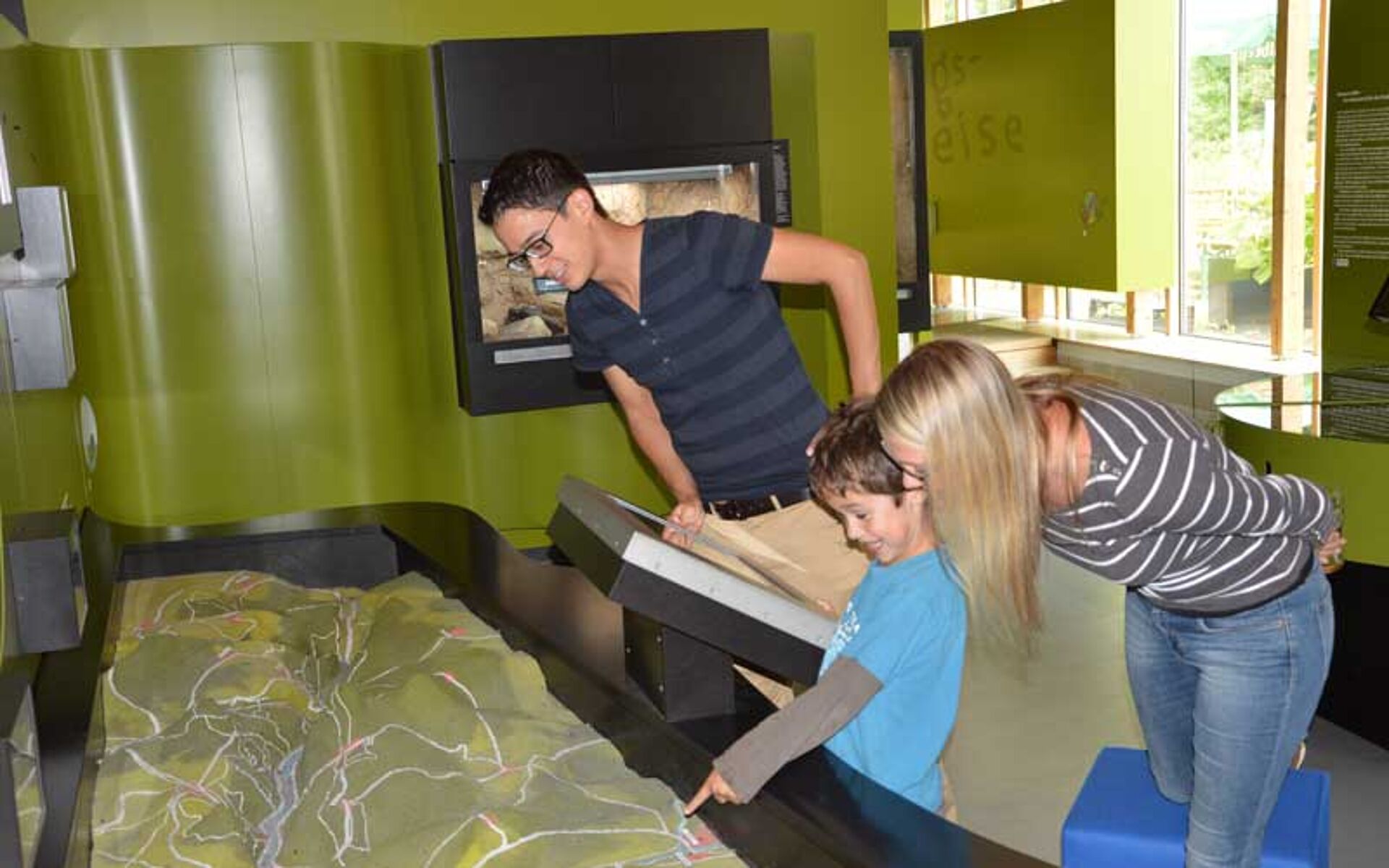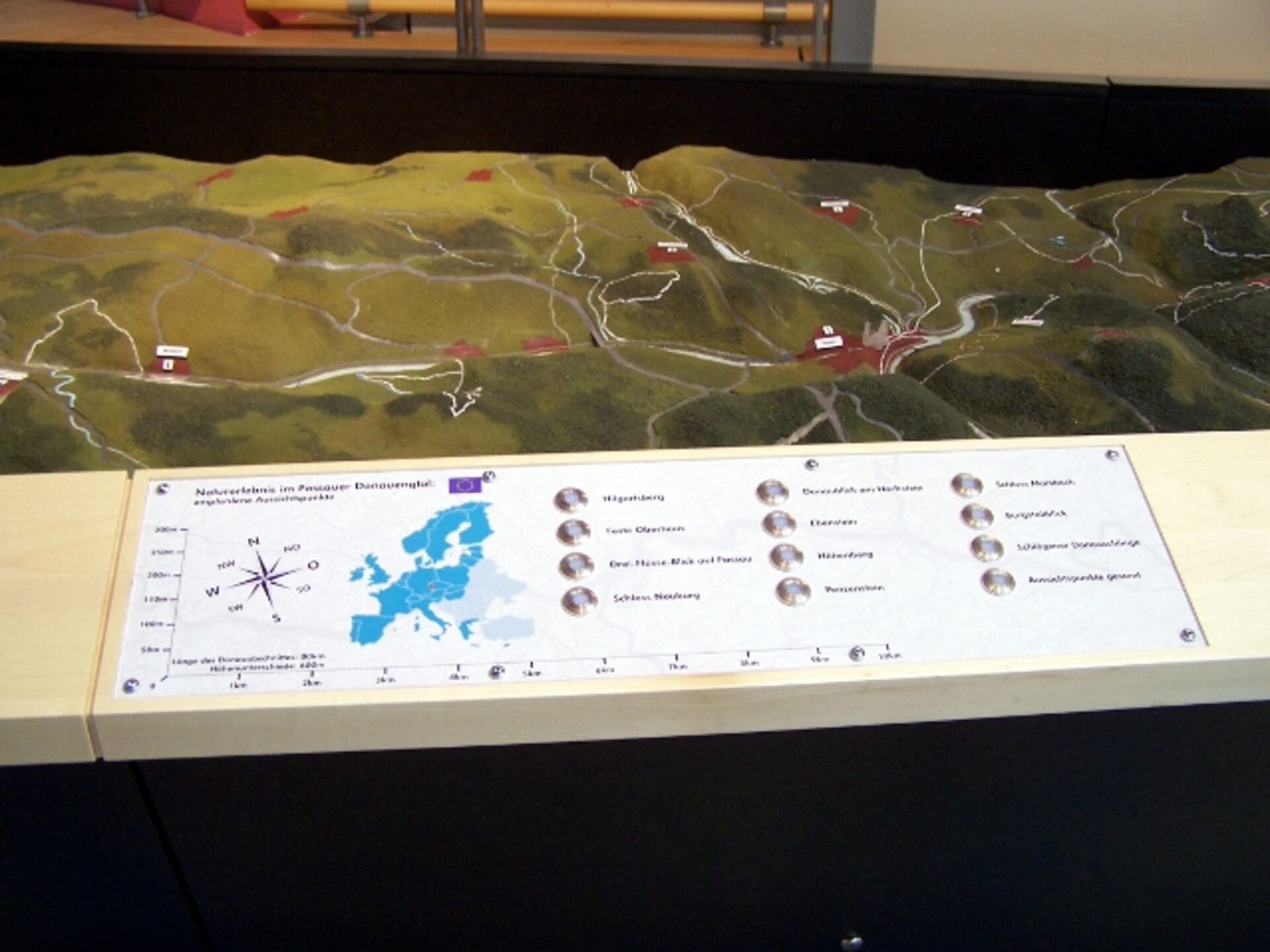 In December 2006 Hüttinger was commissioned to develop and fabricate a true-to-scale landscape model to be presented at the Haus am Strom (lit. House on the Great River) near Passau. The topographically shaped relief model on a scale of 1:35,000 shows the geographical characteristics of the Passau Danube Valley from Hofkirchen in Bavaria to Aschach an der Donau in Upper Austria. Tourist attractions such as vantage points, ship landing stages or hiking car parks are marked with light points and can be selected via a control panel. Individual natural highlights are made visible with fibre optic technology and can also be controlled via the control panel.