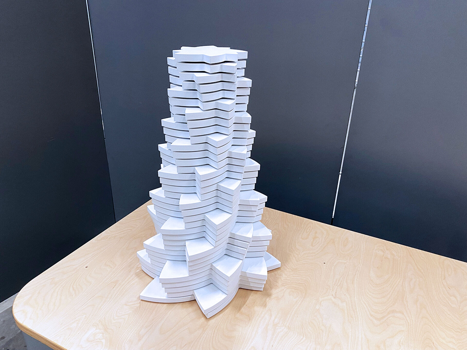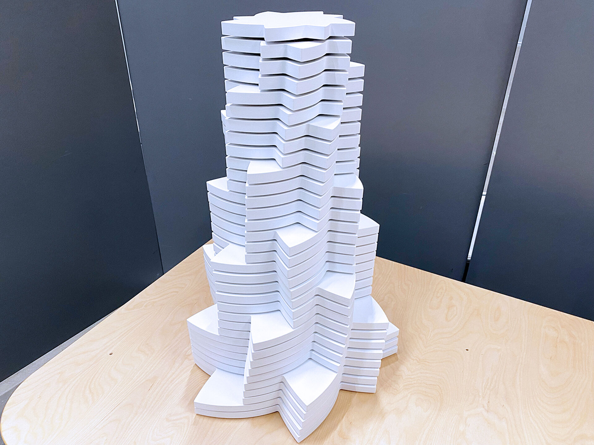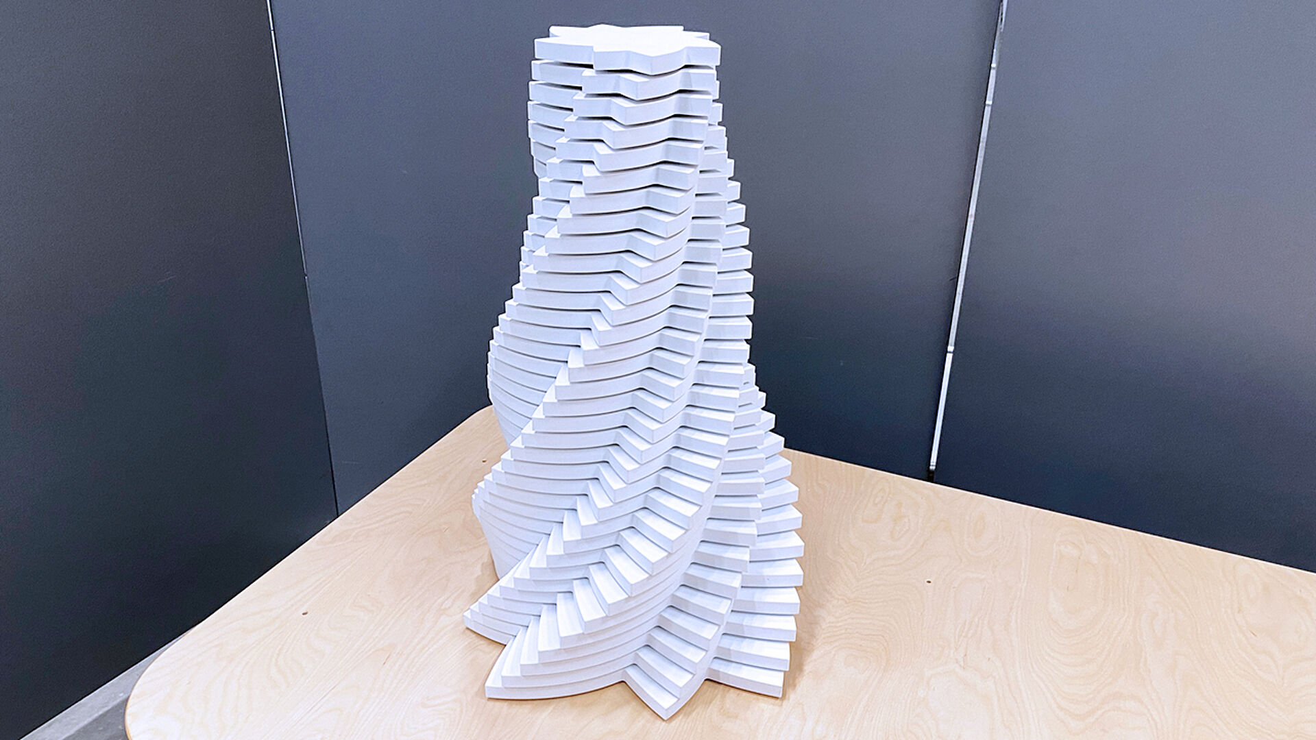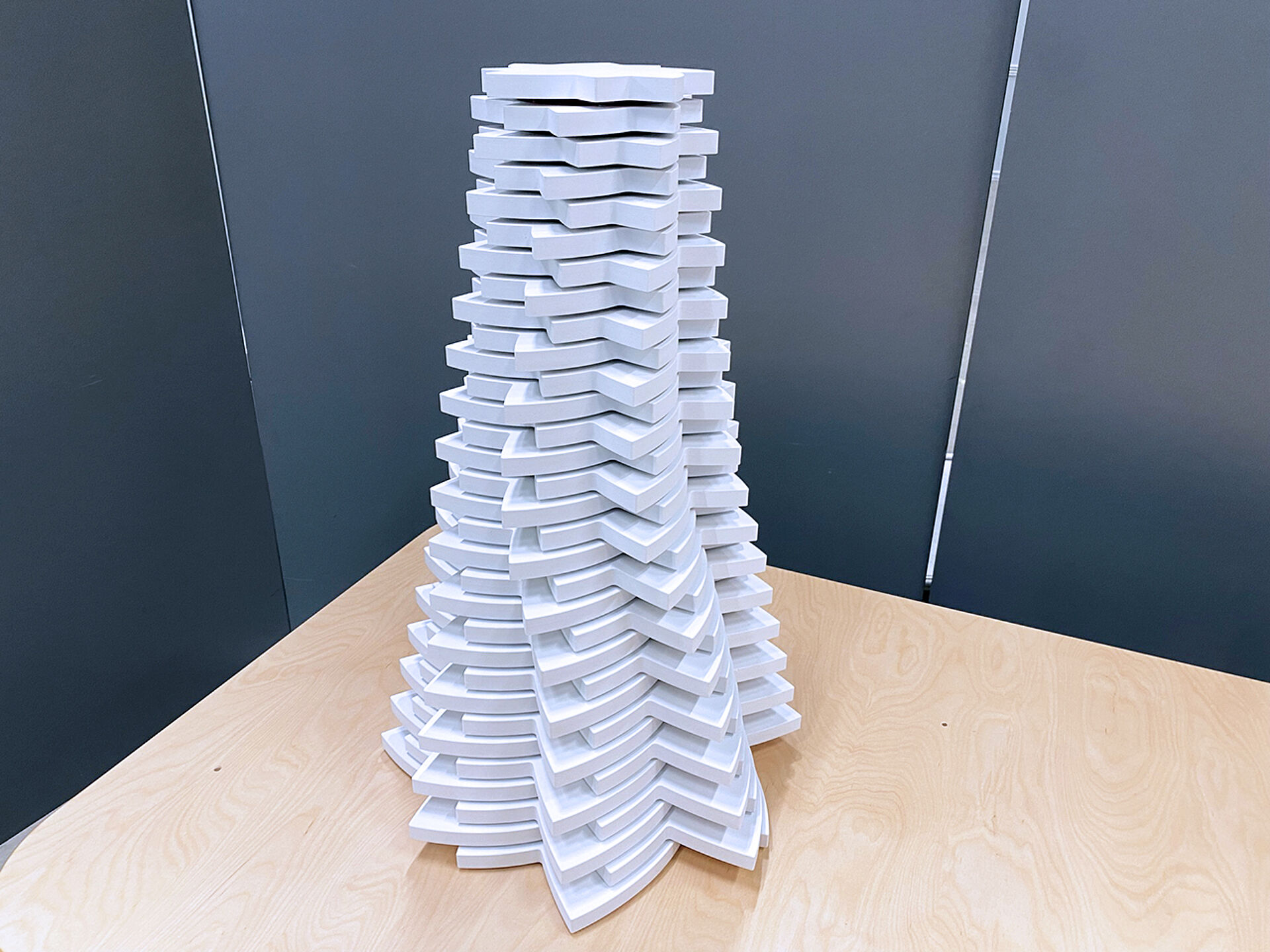 Turn the crank and watch the beauty of math as the tower starts spinning. The transformations in this tower result from incremental drift, wherein each layer rotates slightly faster than the layer beneath it. There are 32 layers, so the top layer must make 32 complete revolutions before the tower returns to the same state.