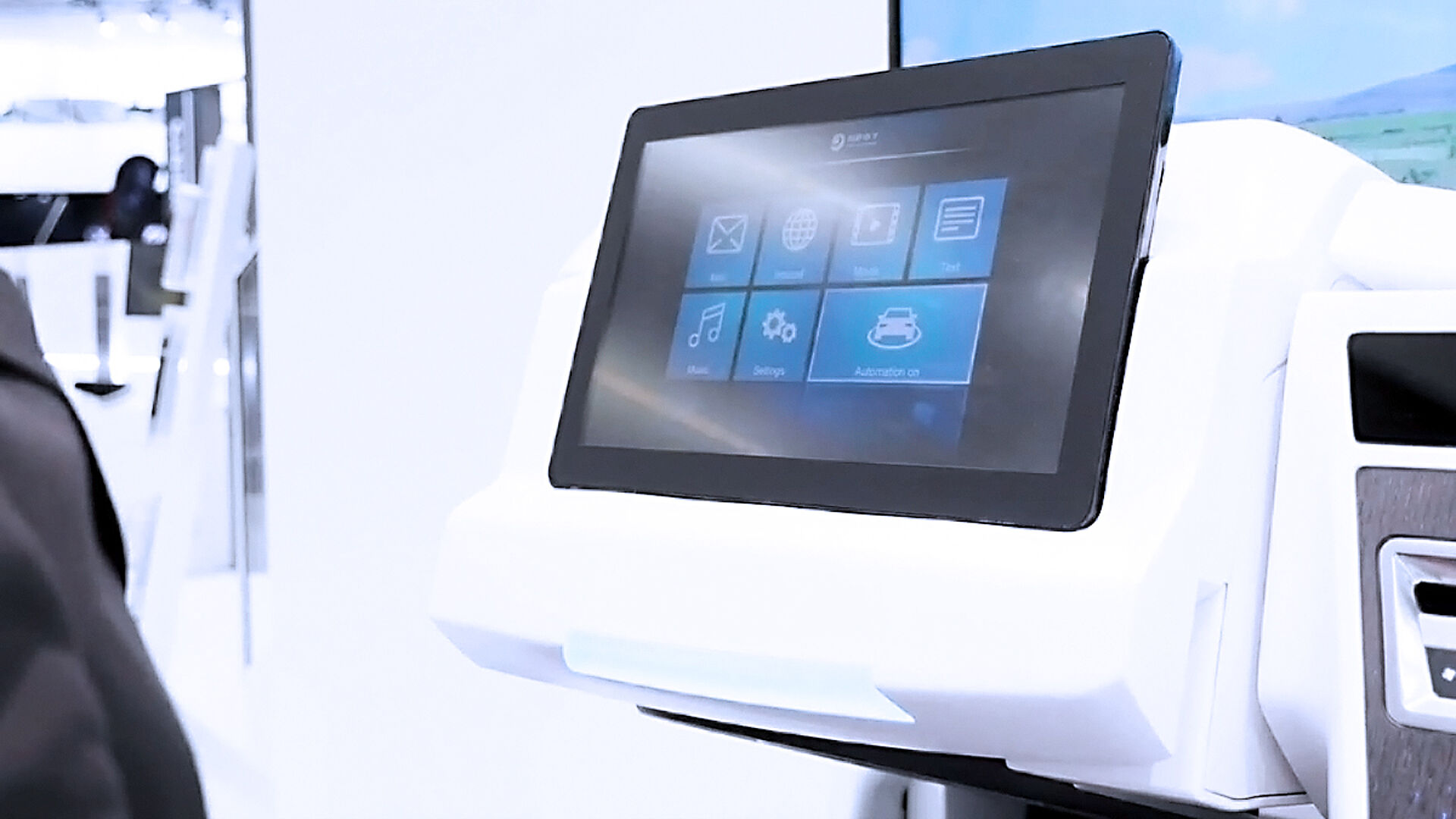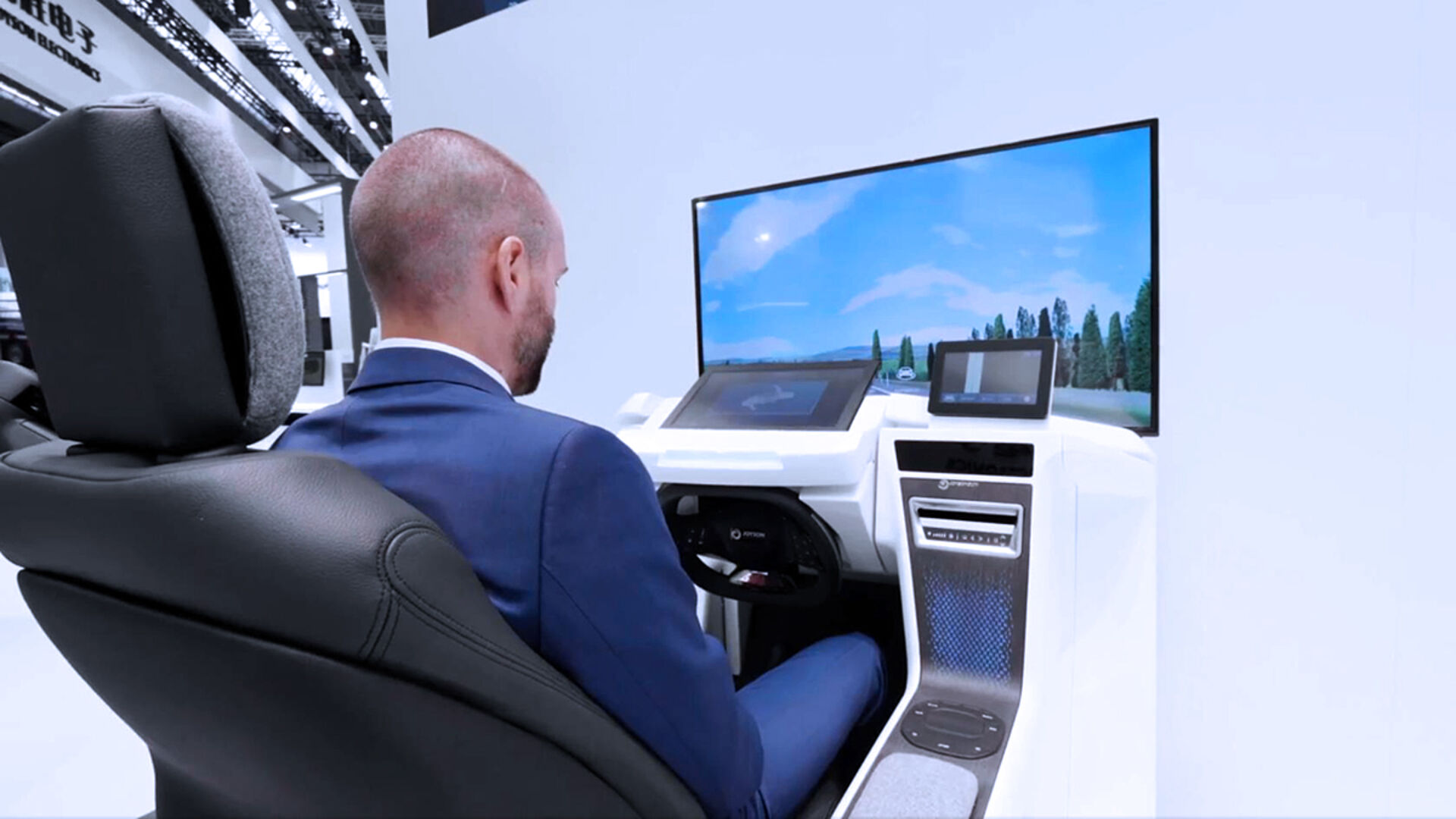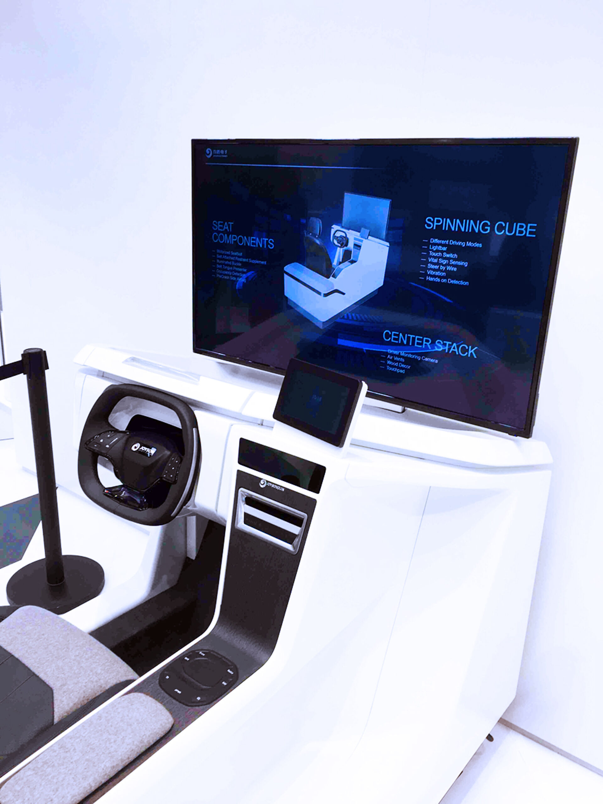 The driving simulator Spinning Cube shows the latest technologies for autonomous driving and driving comfort in passenger cars. Sitting in a real driving seat you are surrounded by a multisupplier dashboard environment for autonomous driving. When in autonomous driving mode the steering wheel is replaced by a multimendia touch screen via rotating swivel axis.