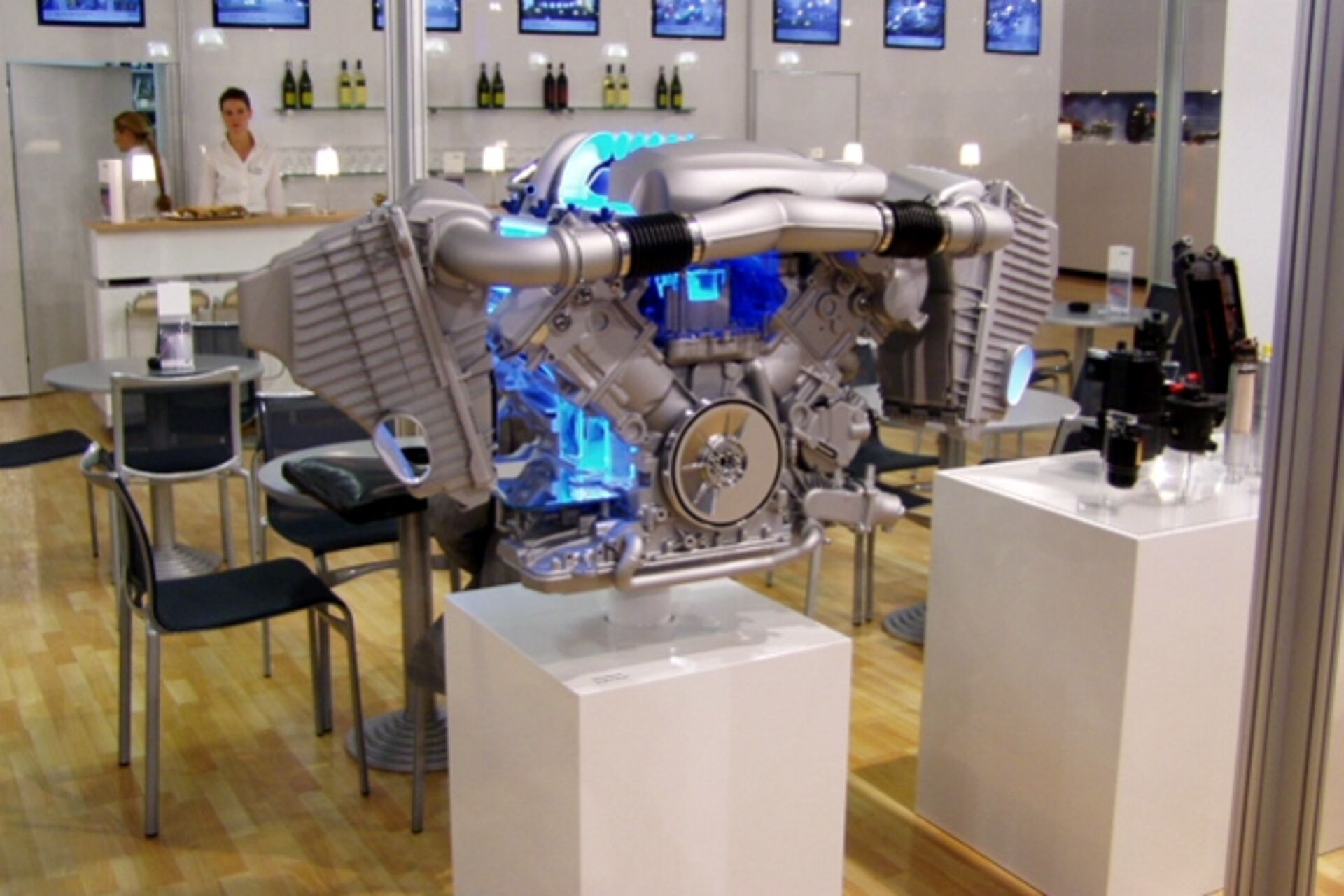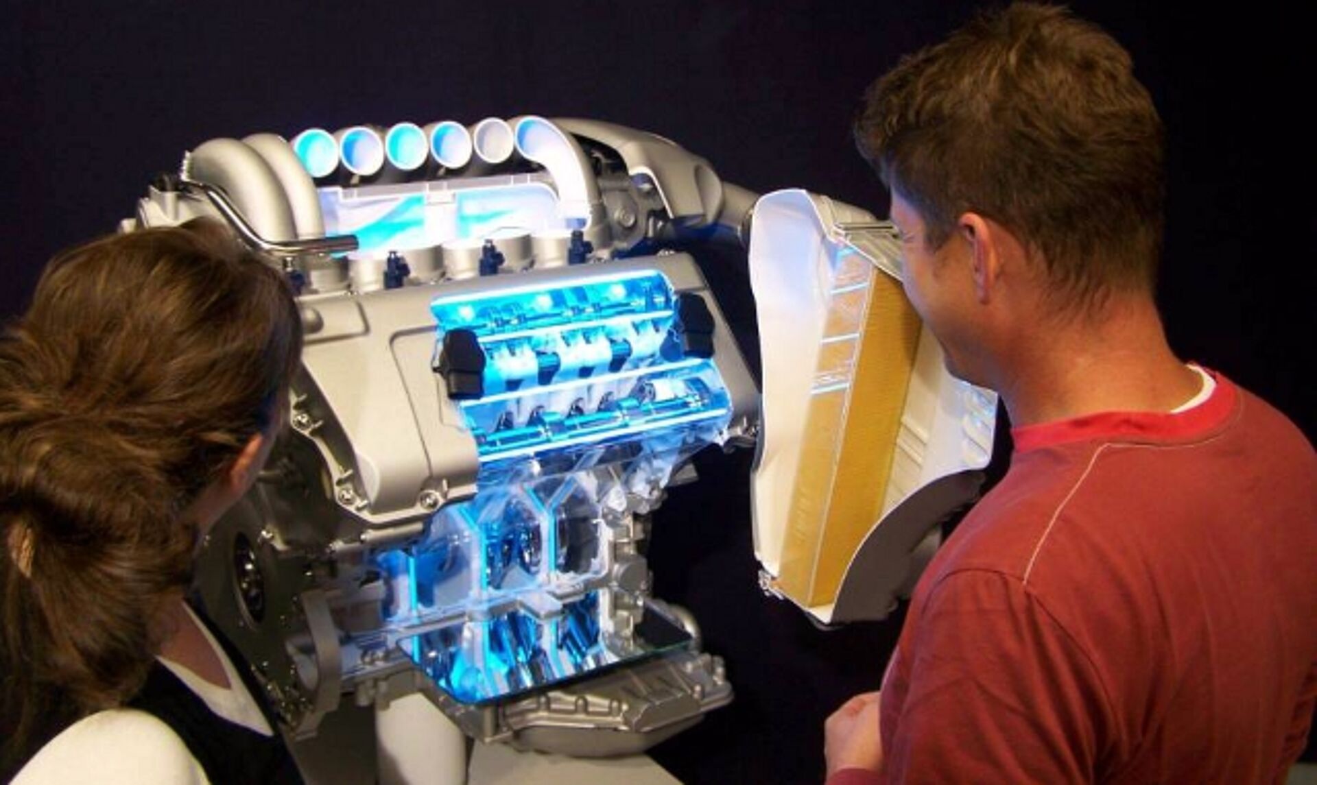 Fabrication of a V8 4.2l engine cutaway for free presentation. The components which were delivered by Mahle GmbH as e.g. the cam shaft, plunger, connecting rod and crankshaft were highlighted by blue LED`s.