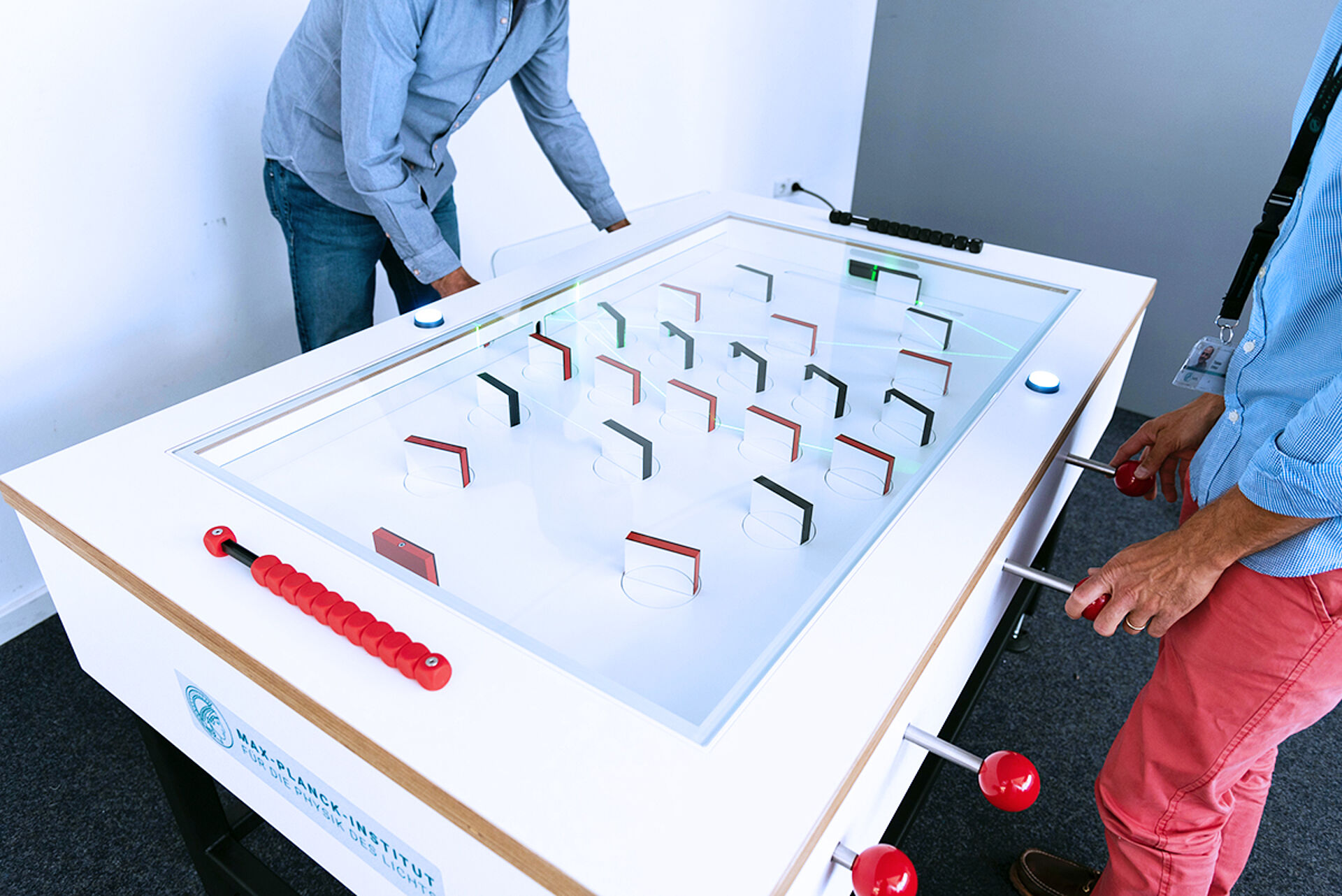 We were commissioned to manufacture a Light Island, Flexibly Connected Mirrors and a Laser Table Football for the Max Planck Institute for the Science of Light. The exhibits enable to explore and to play with the refraction and reflection of light.