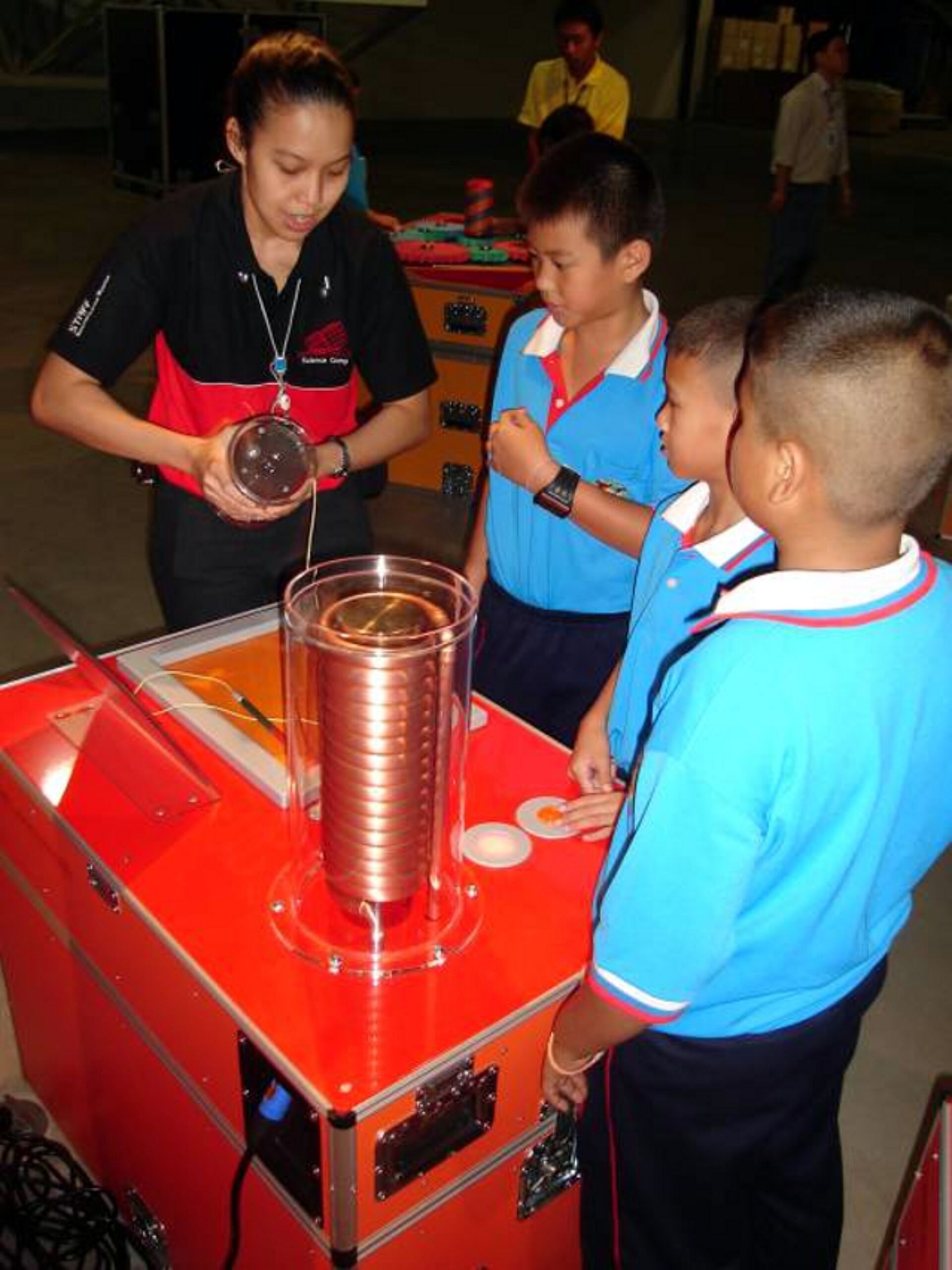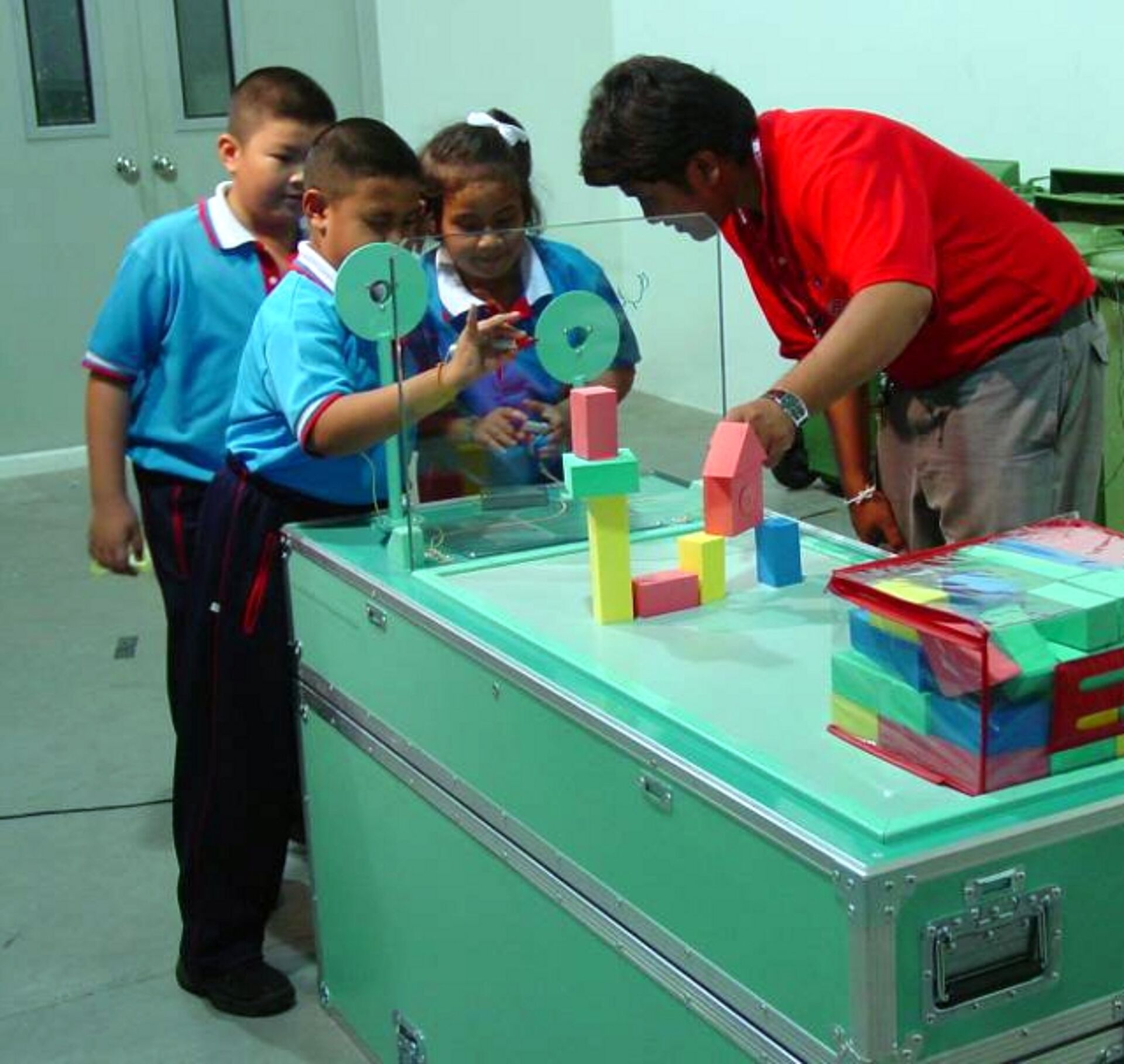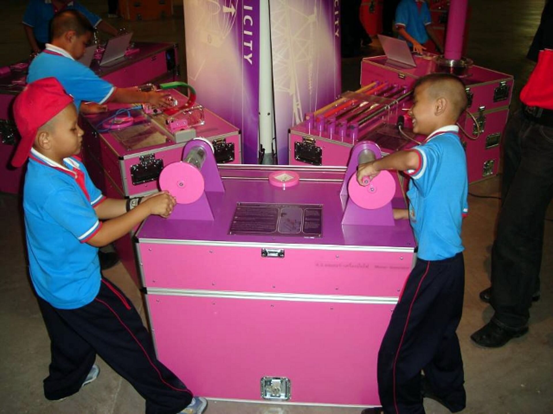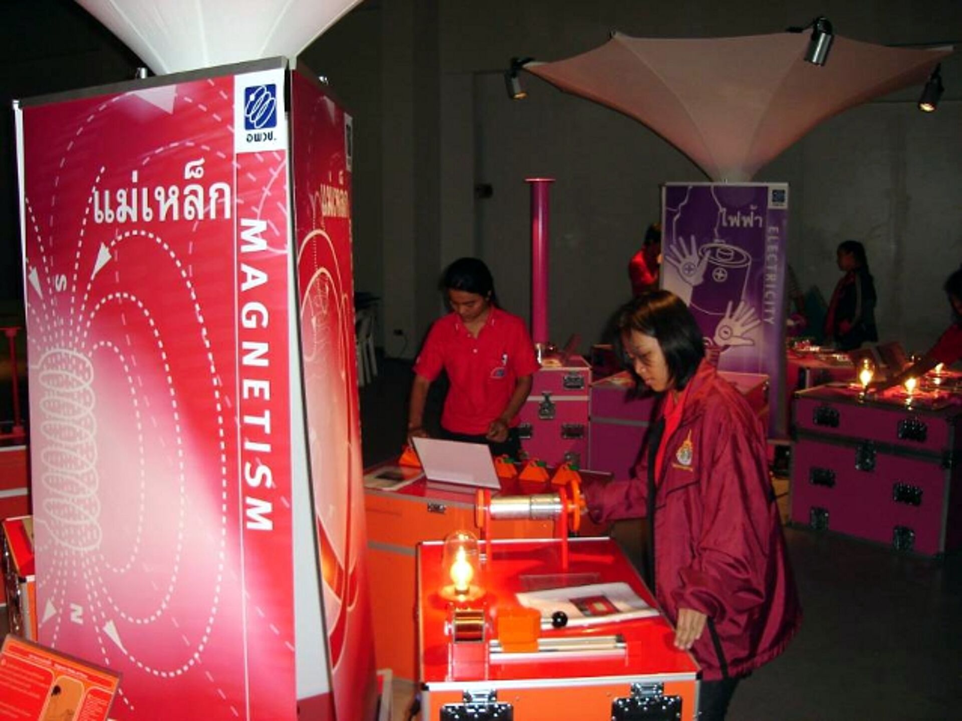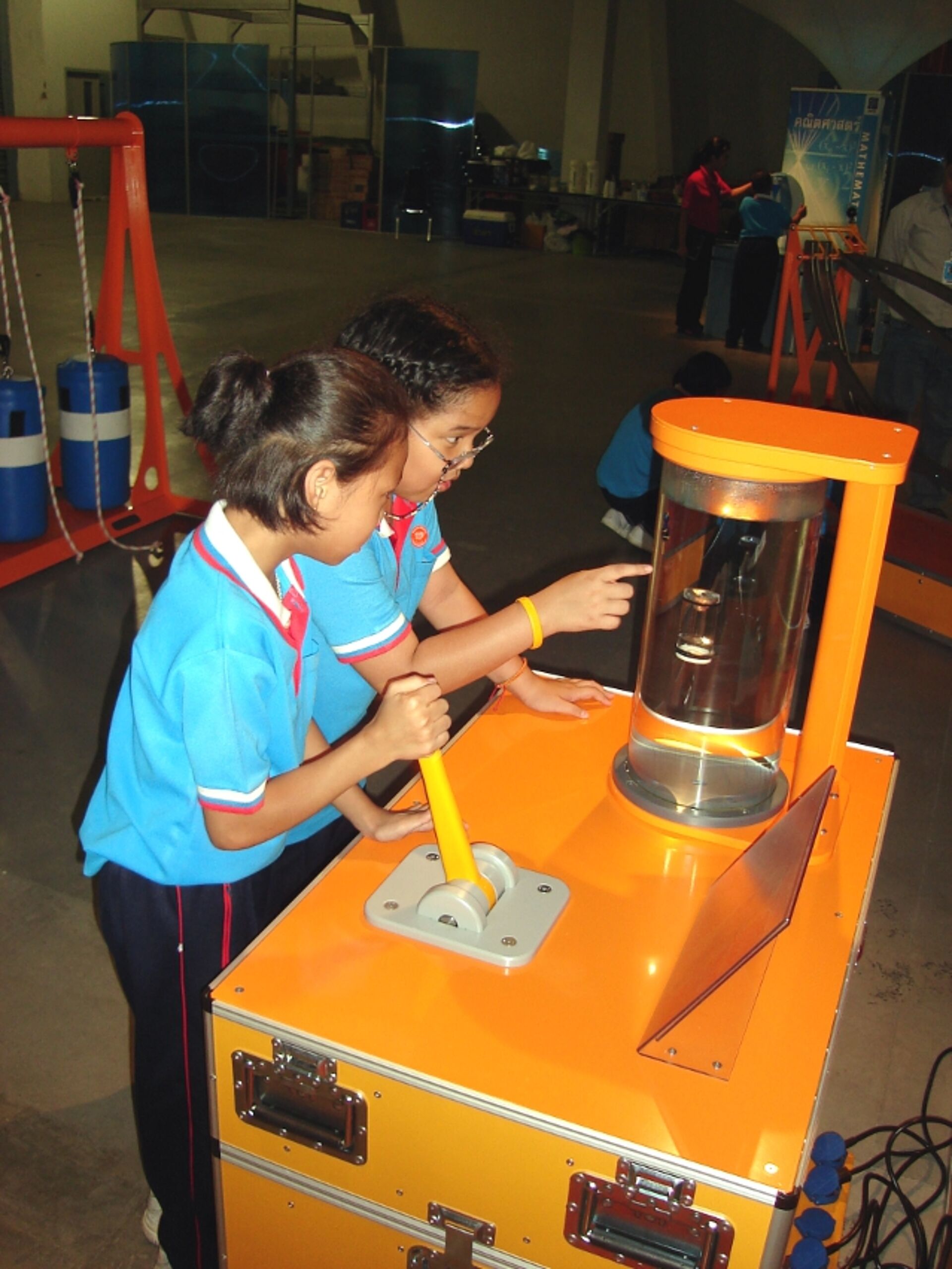 In September 2006 we were approached by the National Science Center of Thailand, to develop a system for a traveling exhibition. The objective of this concept is to reach out to institutions across the country and convey exciting principles and processes from the field of science and technology. The prime targets are children and young adults who are presented with scientific content during their formal education, which is to be complemented by this traveling exhibition. The intention is to involve the students in scientific experiments, to capture their attention and stimulate their learning. The message to be conveyed through multiple media is supposed to support an appreciation of science and technology, but also to draw attention to the social and ecological consequences of new developments. We designed and built a traveling exhibition consisting of 35 interactive hands-on exhibits referring to mathematics, mechanics, magnetism, electricity, optics & light and perception.