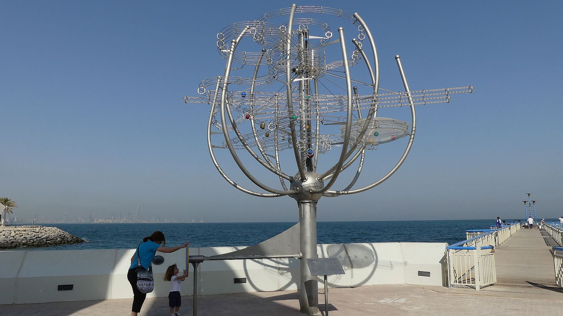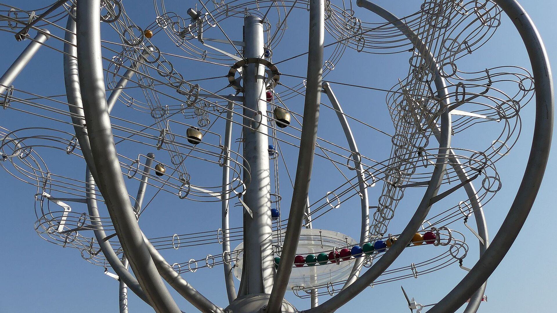 As part of our work for the New Discovery Place at the Scientific Center in Kuwait, we were entrusted with the development, design and construction of the kinetic sculpture Energy Machine. Balls are transported to the top of the 6-metre high sculpture by means of cranks and from there they roll downwards continuously.