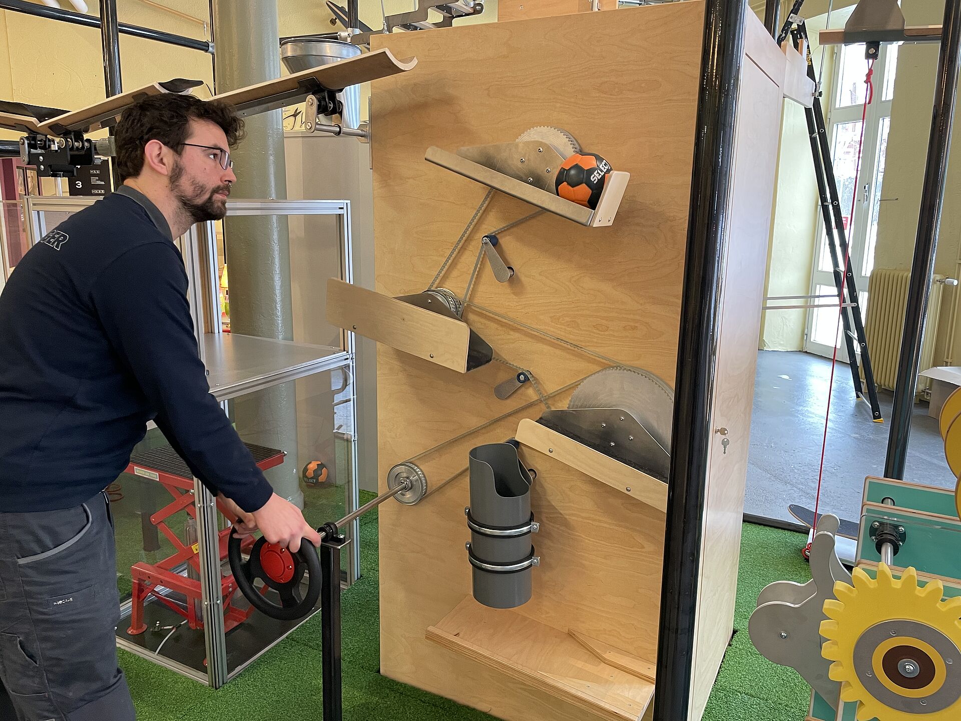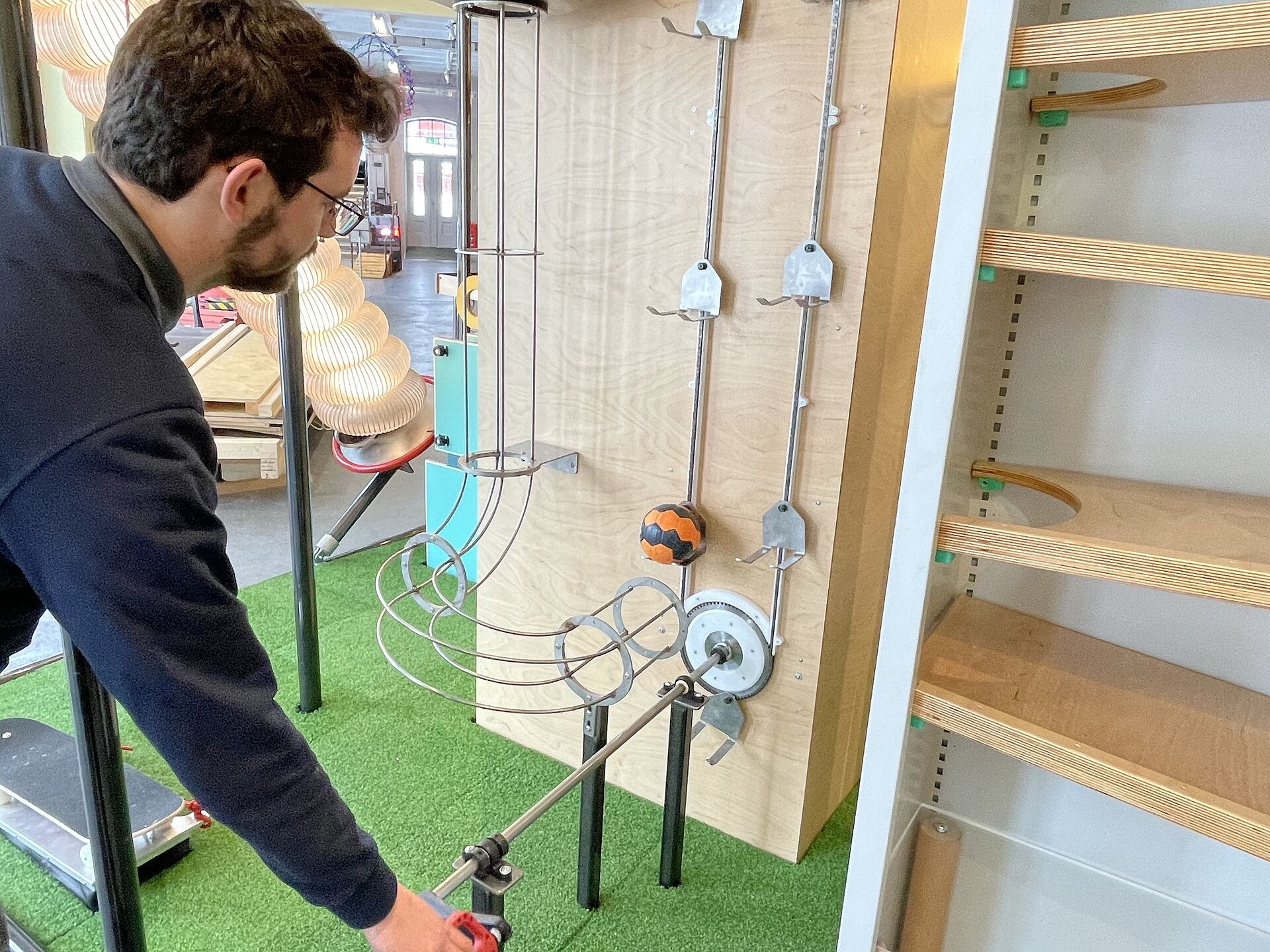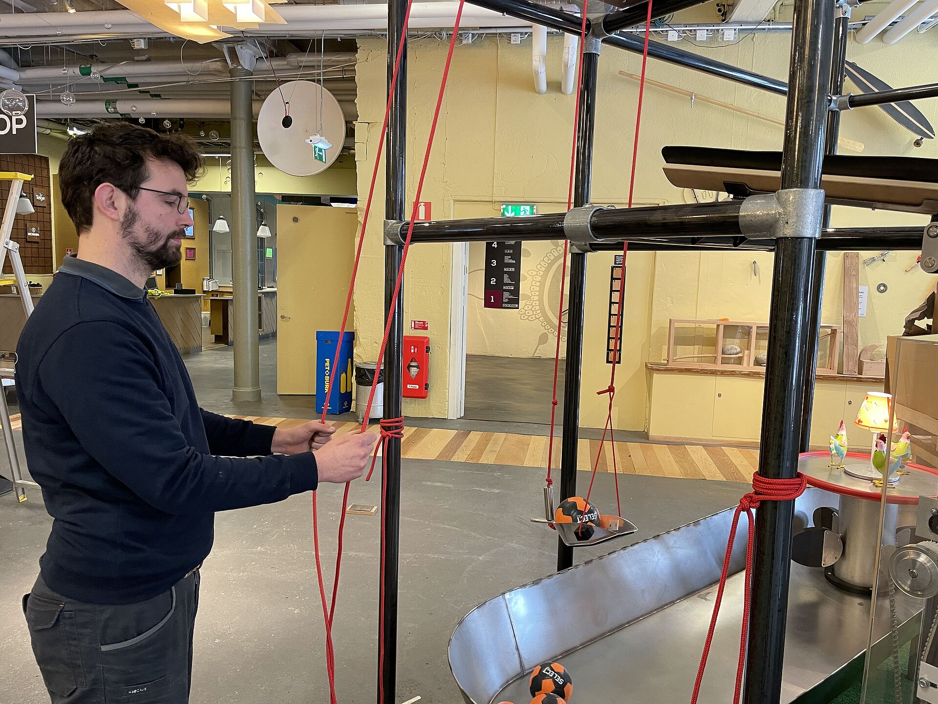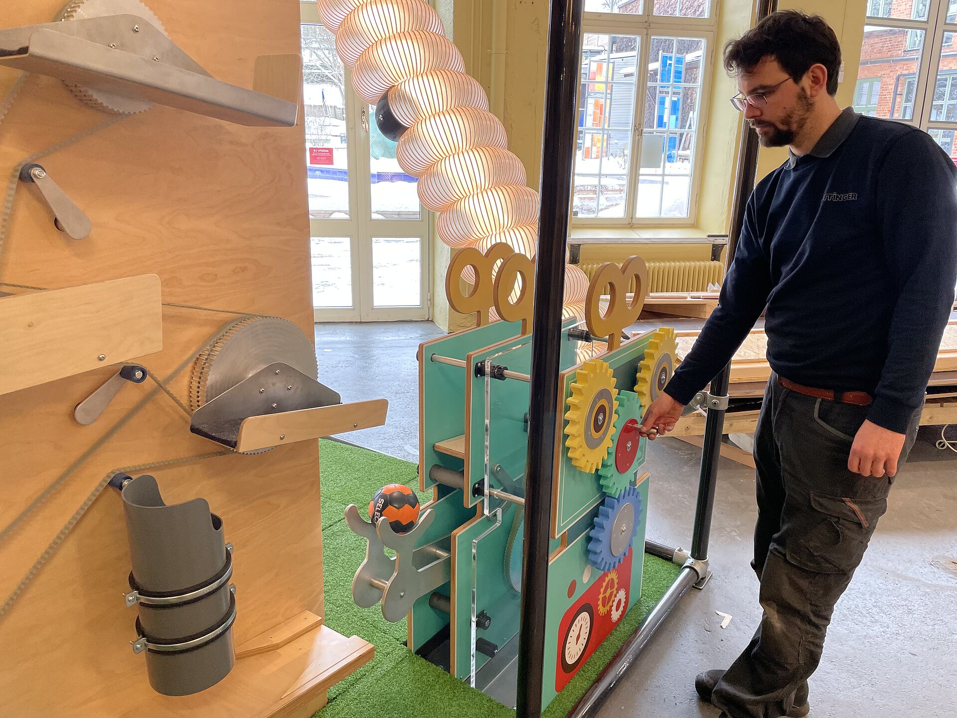 KraftVerket (lit. Power Plant) is a several meters large thingamajig. It goes on and on and on – as long as you keep the ball moving. Work together at different stations and follow the ball's winding journey through the machine, up and down and here and there. At the same time, you explore the mechanisms of five simple machines and how they work together in a technical system in a clever and exciting way. Can you get the ball to make its way all around the KraftVerket? The golden rule of mechanics "whatever is lost in force, it is gained in displacement, and vice versa" plays a central part when the KraftVerket gets going, just like in several other places in the exhibition Forces & Movement at Tom Tits Experiment. We had the pleasure to conzeptualize, develop and manufacture the KraftVerket.