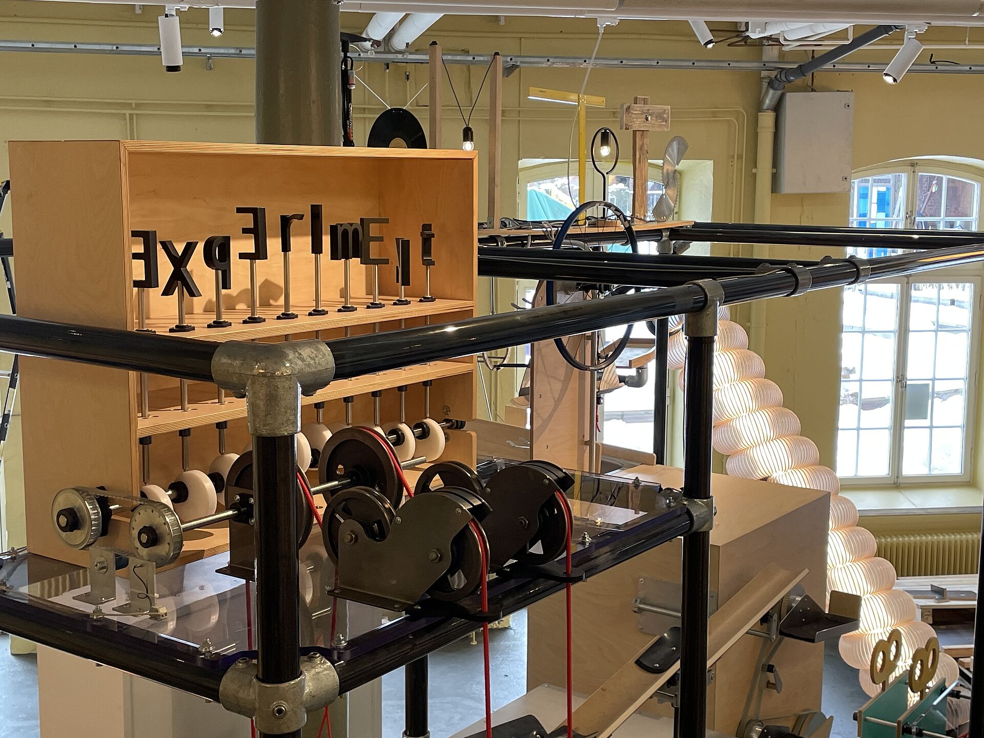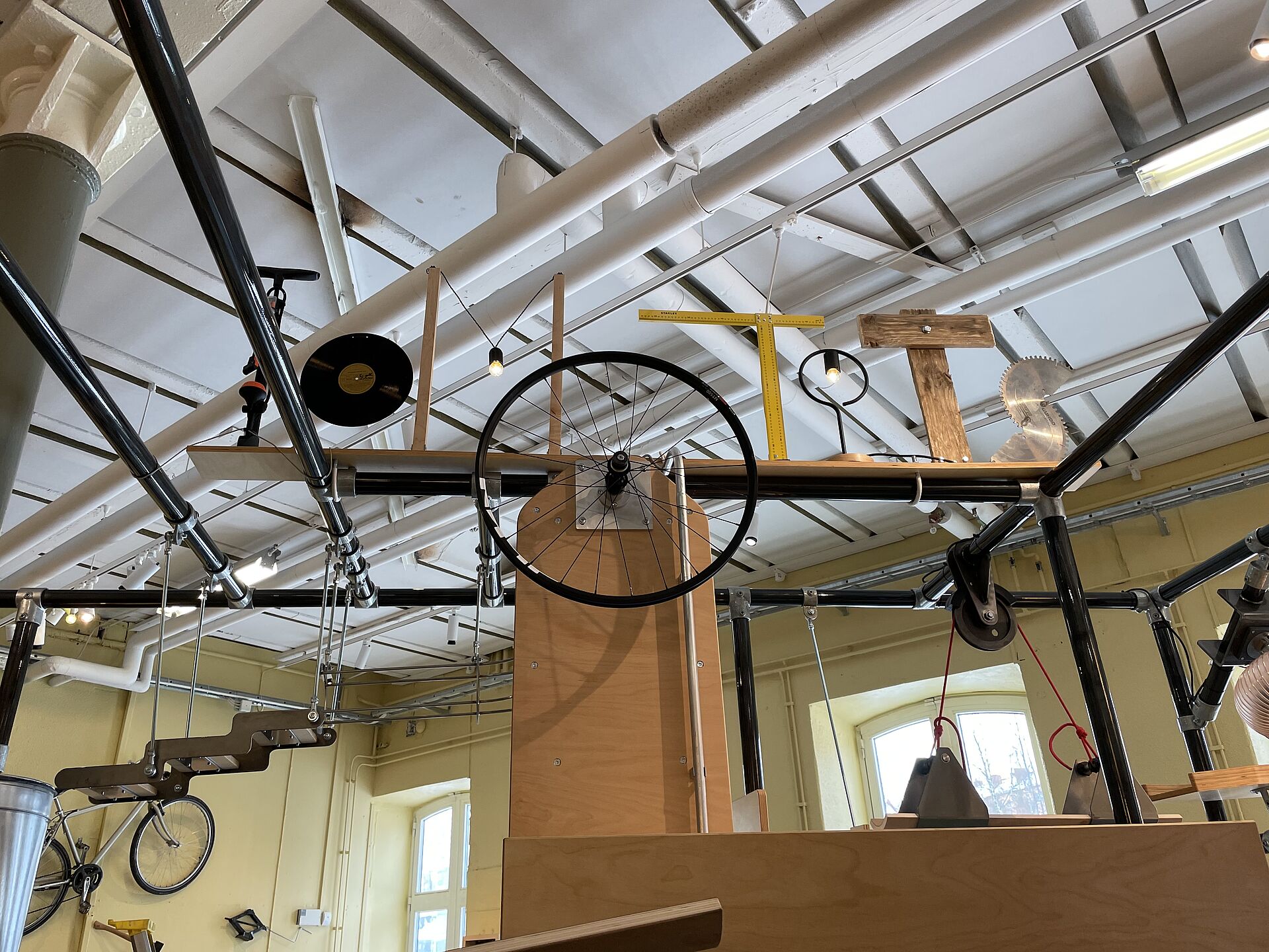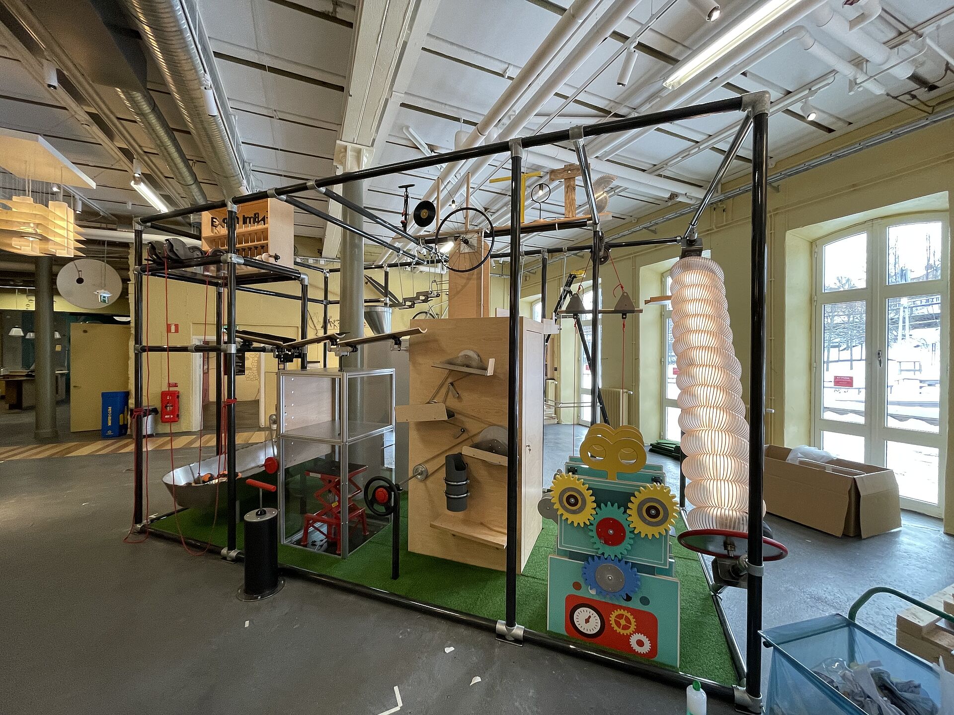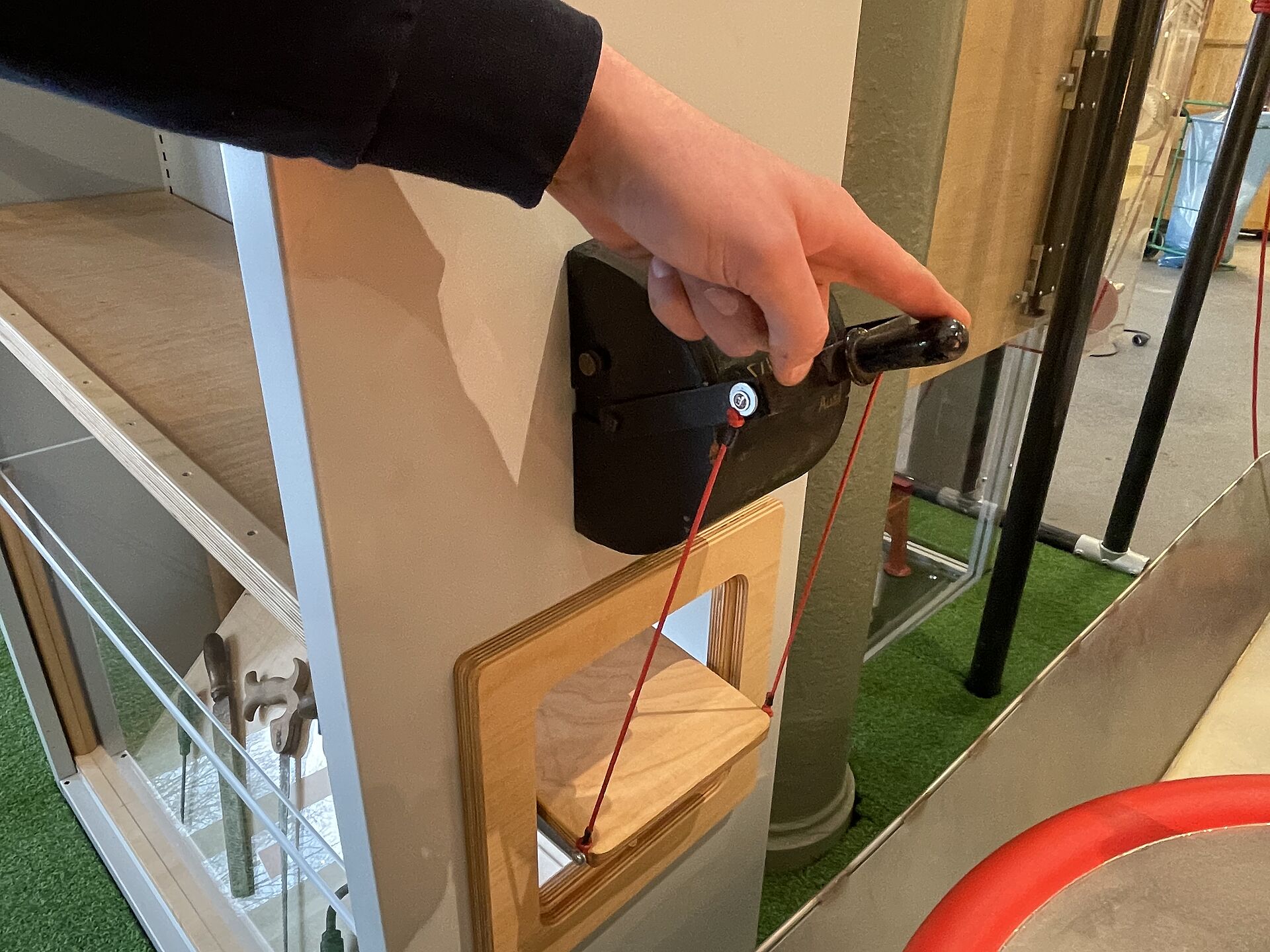 KraftVerket (lit. Power Plant) is a several meters large thingamajig. It goes on and on and on – as long as you keep the ball moving. Work together at different stations and follow the ball's winding journey through the machine, up and down and here and there. At the same time, you explore the mechanisms of five simple machines and how they work together in a technical system in a clever and exciting way. Can you get the ball to make its way all around the KraftVerket? The golden rule of mechanics "whatever is lost in force, it is gained in displacement, and vice versa" plays a central part when the KraftVerket gets going, just like in several other places in the exhibition Forces & Movement at Tom Tits Experiment. We had the pleasure to conzeptualize, develop and manufacture the KraftVerket.