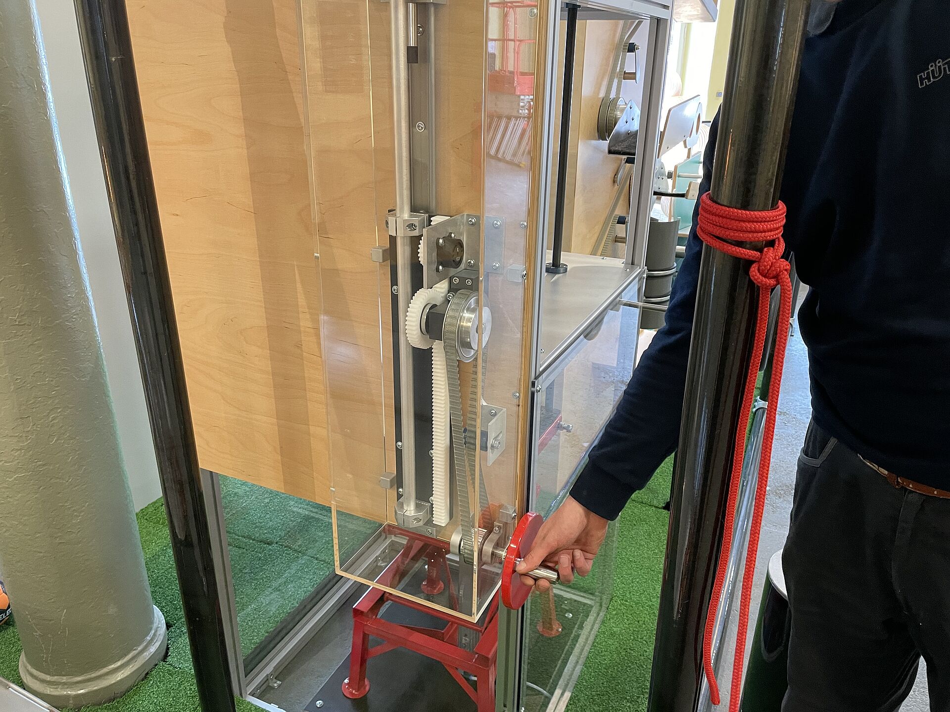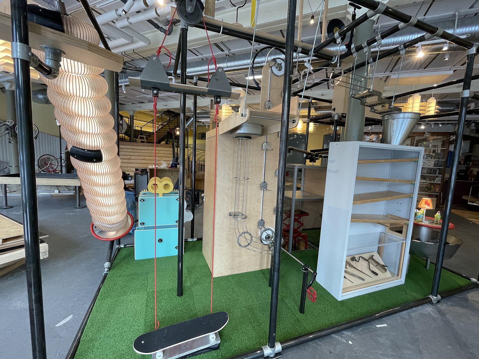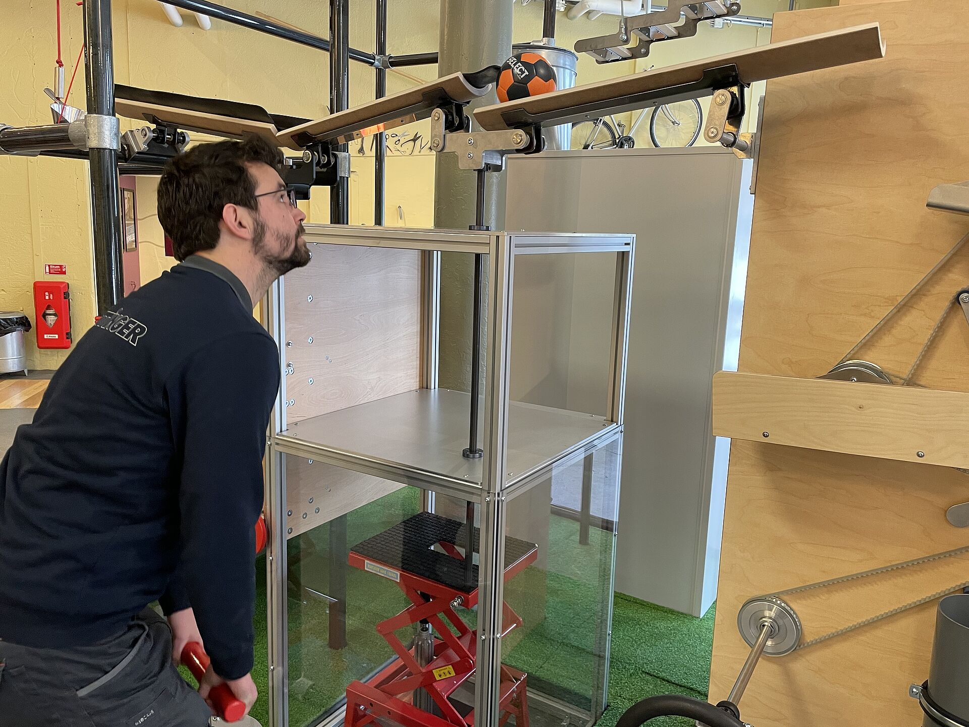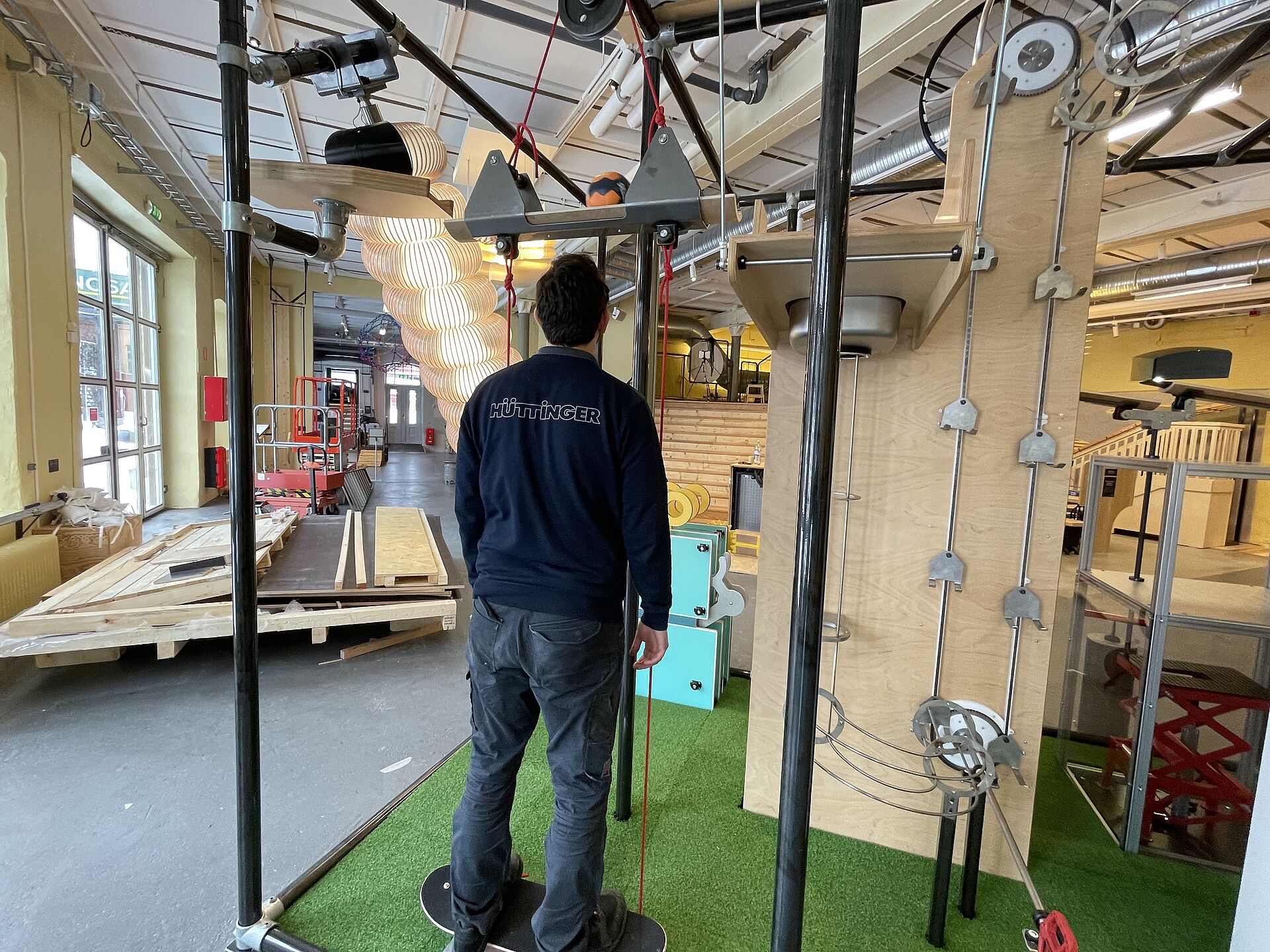 KraftVerket (lit. Power Plant) is a several meters large thingamajig. It goes on and on and on – as long as you keep the ball moving. Work together at different stations and follow the ball's winding journey through the machine, up and down and here and there. At the same time, you explore the mechanisms of five simple machines and how they work together in a technical system in a clever and exciting way. Can you get the ball to make its way all around the KraftVerket? The golden rule of mechanics "whatever is lost in force, it is gained in displacement, and vice versa" plays a central part when the KraftVerket gets going, just like in several other places in the exhibition Forces & Movement at Tom Tits Experiment. We had the pleasure to conzeptualize, develop and manufacture the KraftVerket.