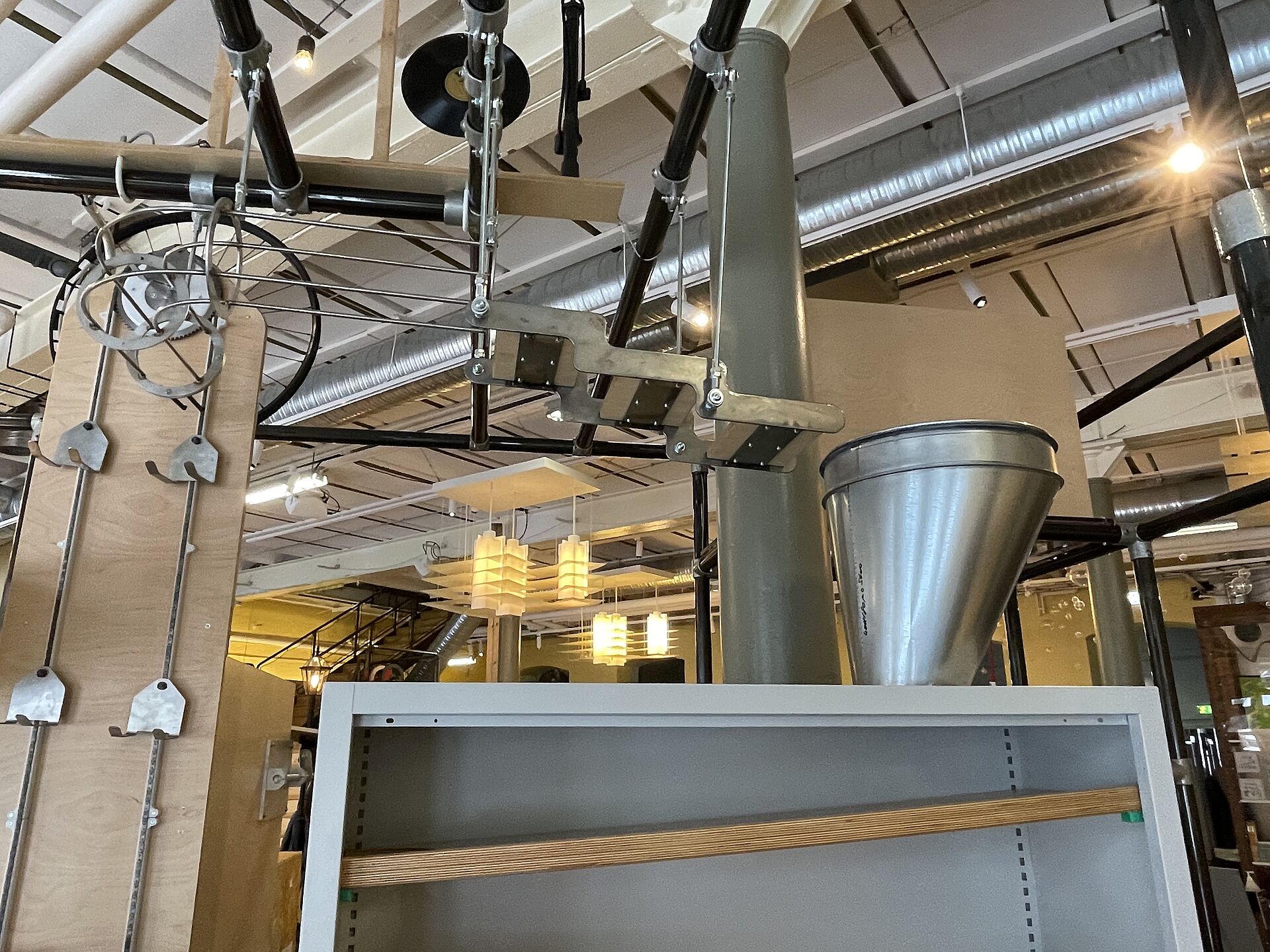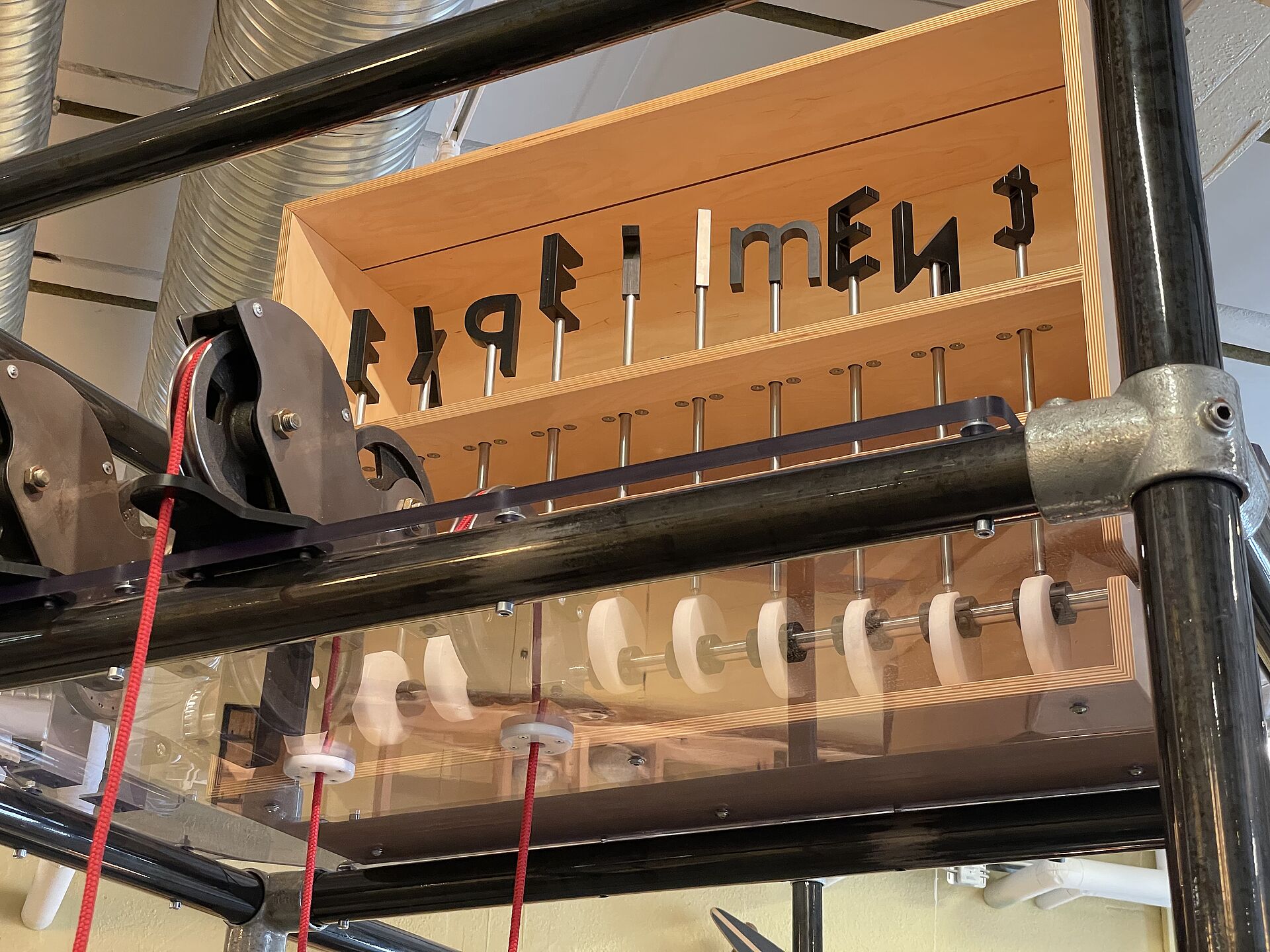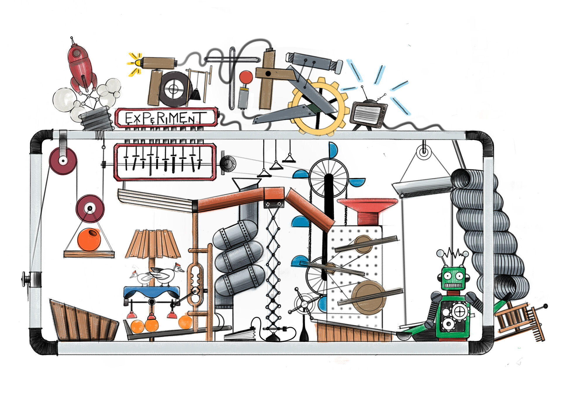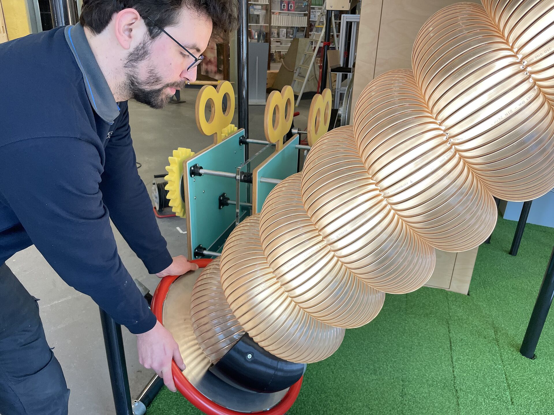 KraftVerket (lit. Power Plant) is a several meters large thingamajig. It goes on and on and on – as long as you keep the ball moving. Work together at different stations and follow the ball's winding journey through the machine, up and down and here and there. At the same time, you explore the mechanisms of five simple machines and how they work together in a technical system in a clever and exciting way. Can you get the ball to make its way all around the KraftVerket? The golden rule of mechanics "whatever is lost in force, it is gained in displacement, and vice versa" plays a central part when the KraftVerket gets going, just like in several other places in the exhibition Forces & Movement at Tom Tits Experiment. We had the pleasure to conzeptualize, develop and manufacture the KraftVerket.