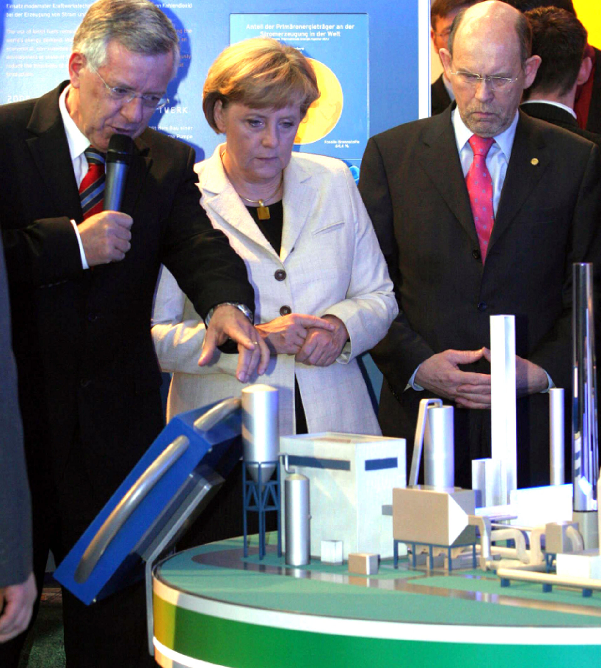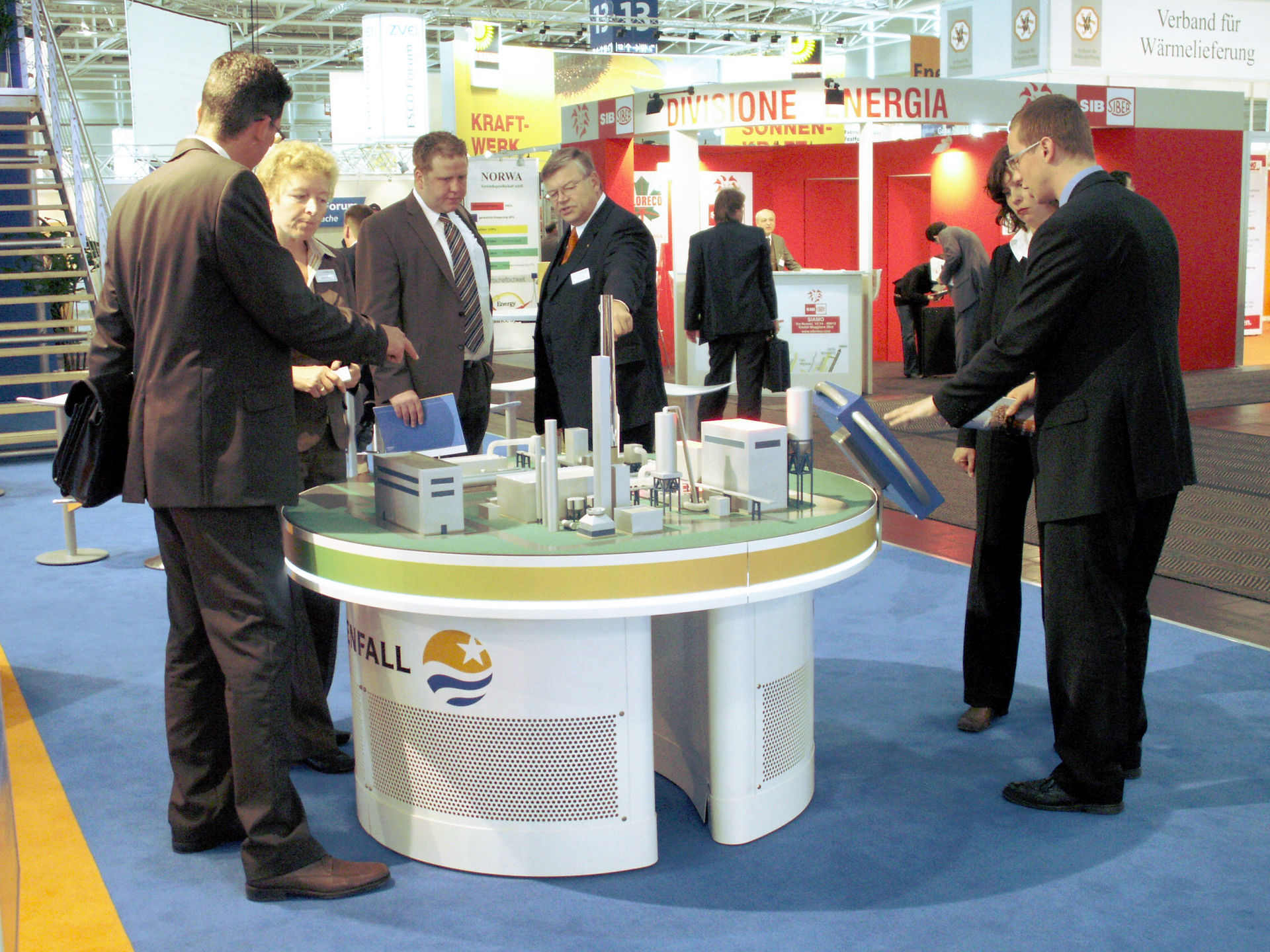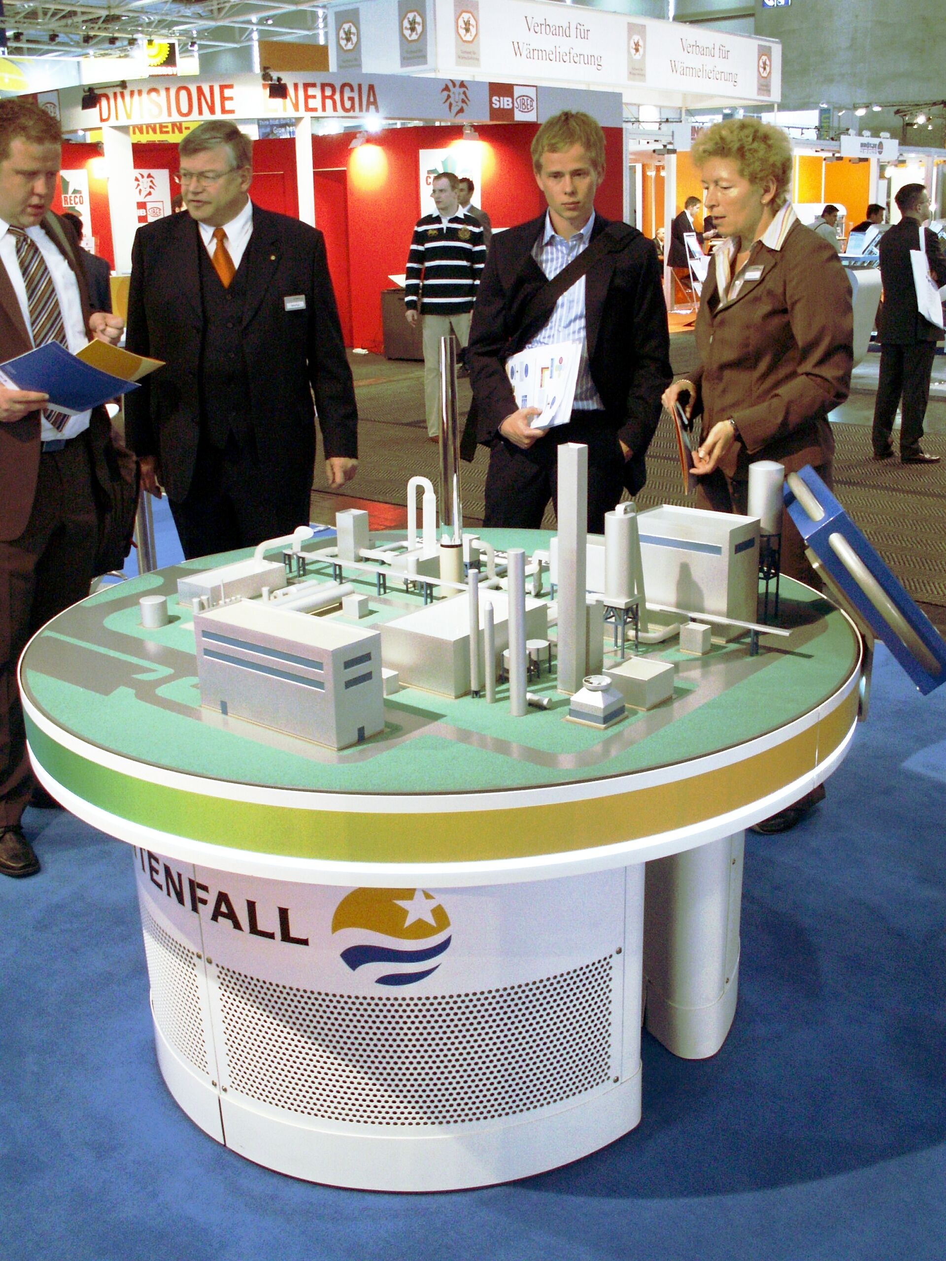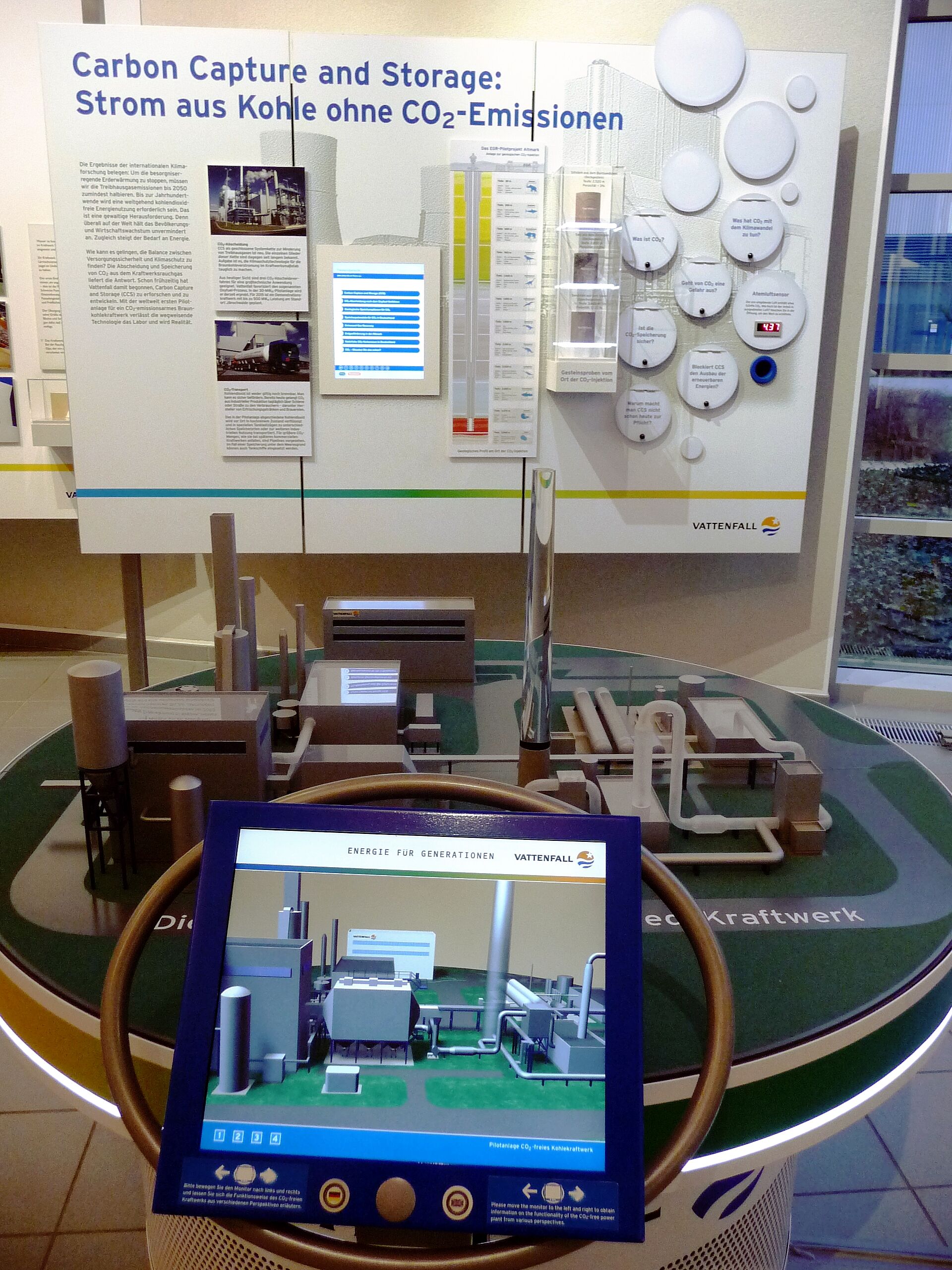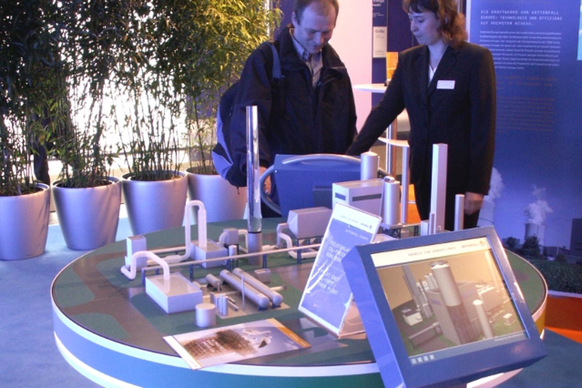 The exhibit of the Vattenfall pilot plant uses a 1:100-scale model to illustrate the CO2-free operating principle of the power plant using the oxy-fuel process. What it shows are the technical plant components as well as the buildings with façade design and structural details. These elements are made of glazed acrylic glass and light up individually depending on the position of the monitor on the model. Conveyor belt bridges and pipes are provided with directed running lights. The monitor scanner can be moved manually round the model in a 150° angle. The position of the monitor is scanned by sensors and, corresponding to its position on the model, causes animated process diagrams from the various plant sections to be displayed on the monitor screen. Used in combination with the exhibition wall, this model provides a complete presentation of the comprehensive climate protection strategy and the development of innovative oxy-fuel technology, including its storage for a future-oriented energy supply.