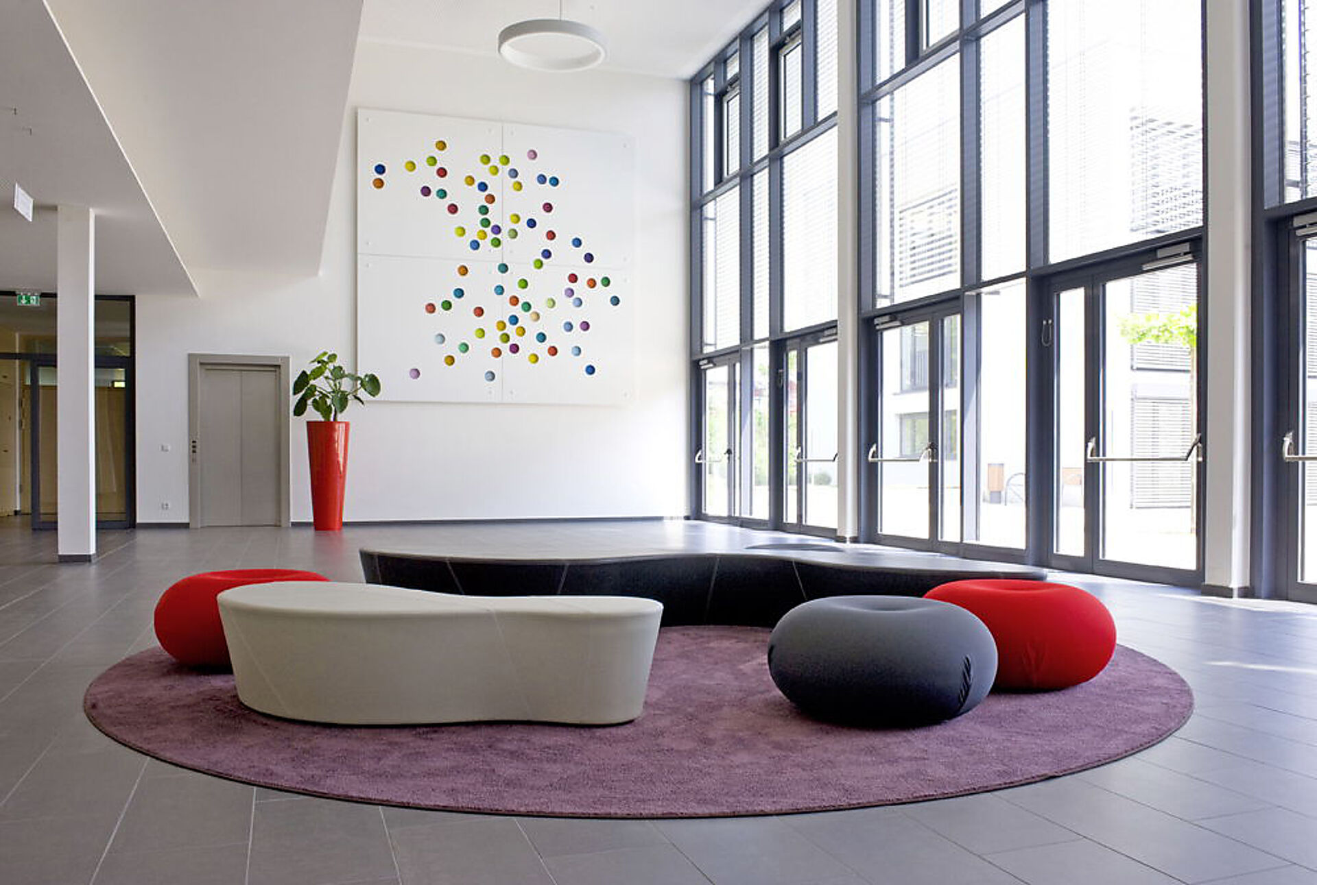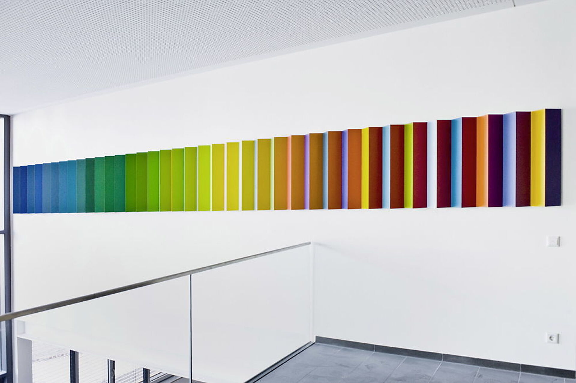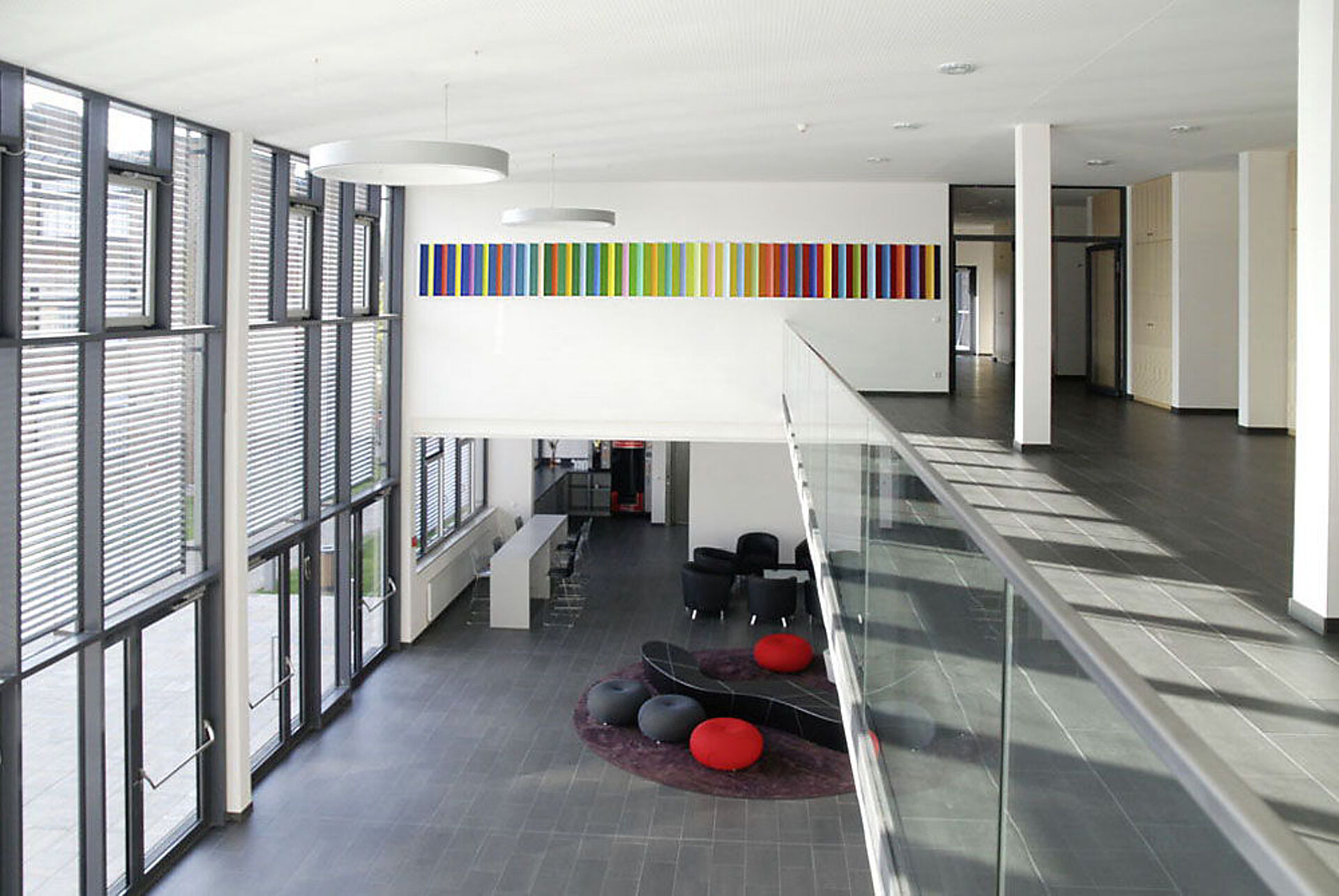 In July 2010, we were contracted to fabricate the works of art Standort / Standpunkt (lit. Location / Position) and Bewegung / Veränderung (lit. Movement / Change) by Waldemar Bachmeier. Within an art in construction competition, organized by the Ansbach State Building Department, these two works were created for the foyer of the Rolf-Grabower-House at the Bavarian State Finance School in Ansbach.