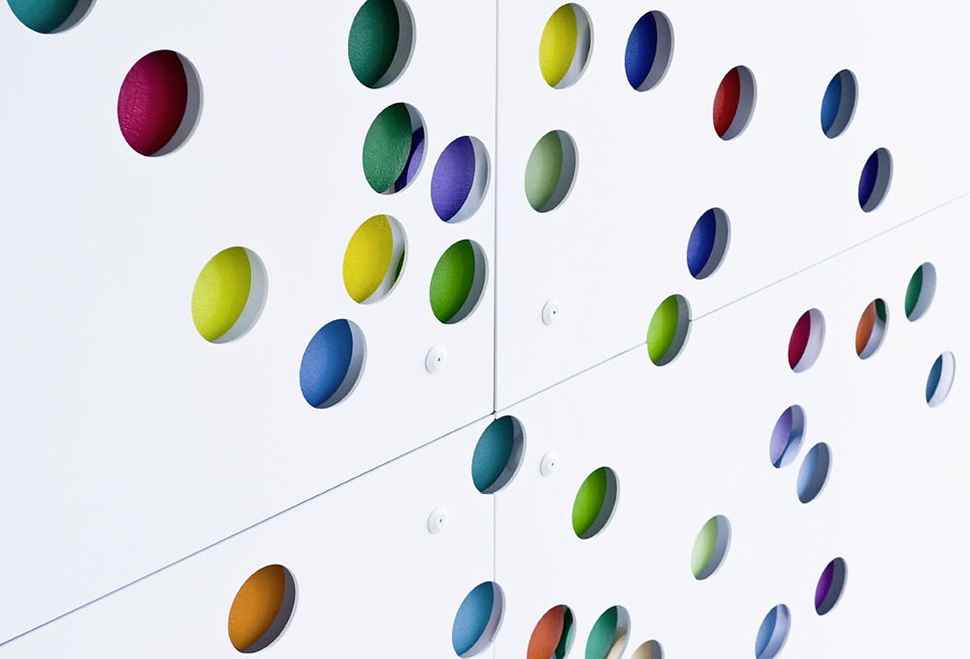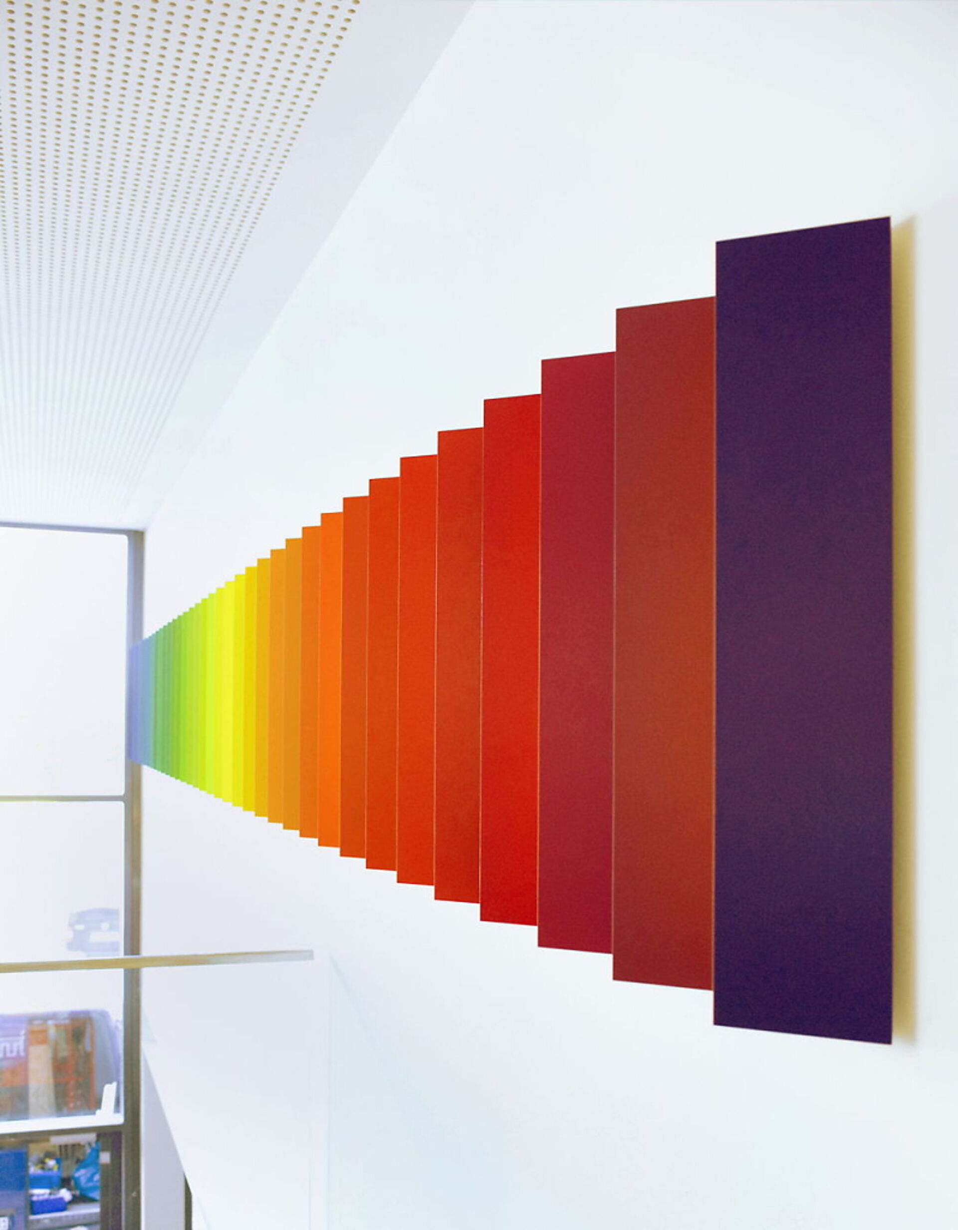 Bewegung / Veränderung (lit. Movement / Change) shows the colour coding of the 73 Bavarian tax offices in alphabetical order on an overall space of 0.75 x 7.4 m.