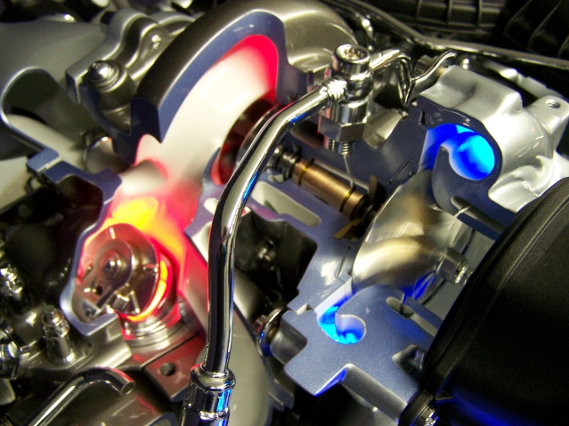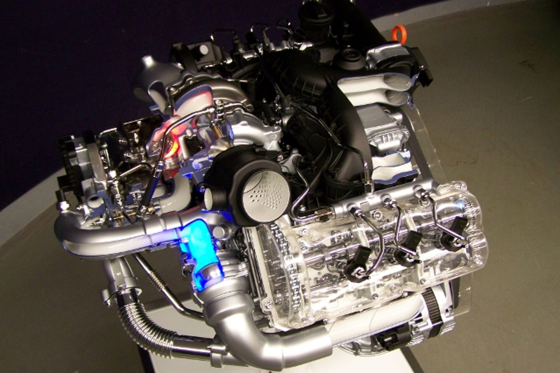 V6 3,0l TDI Aggregat: Die Komponenten Kettentrieb, der Einblick zu den Kolben sowie die Hochdruckpumpe wurden geschnitten und sind in Funktion. Ebenso wurden beide Turbos geschnitten. Der Turbolader und die Luft- und Abgaswege wurden mittels LED´s und Stellmotoren in drei Zyklen animiert.