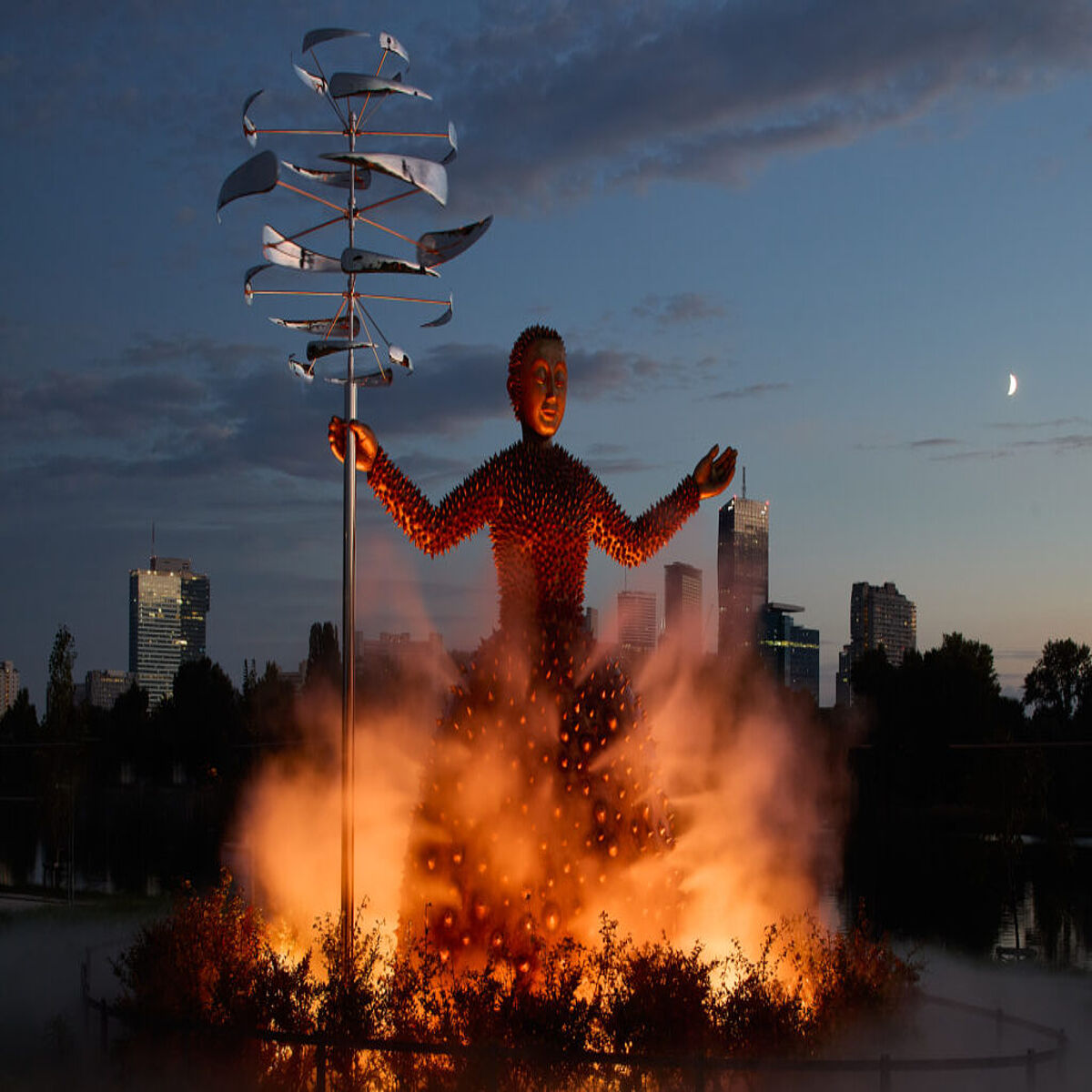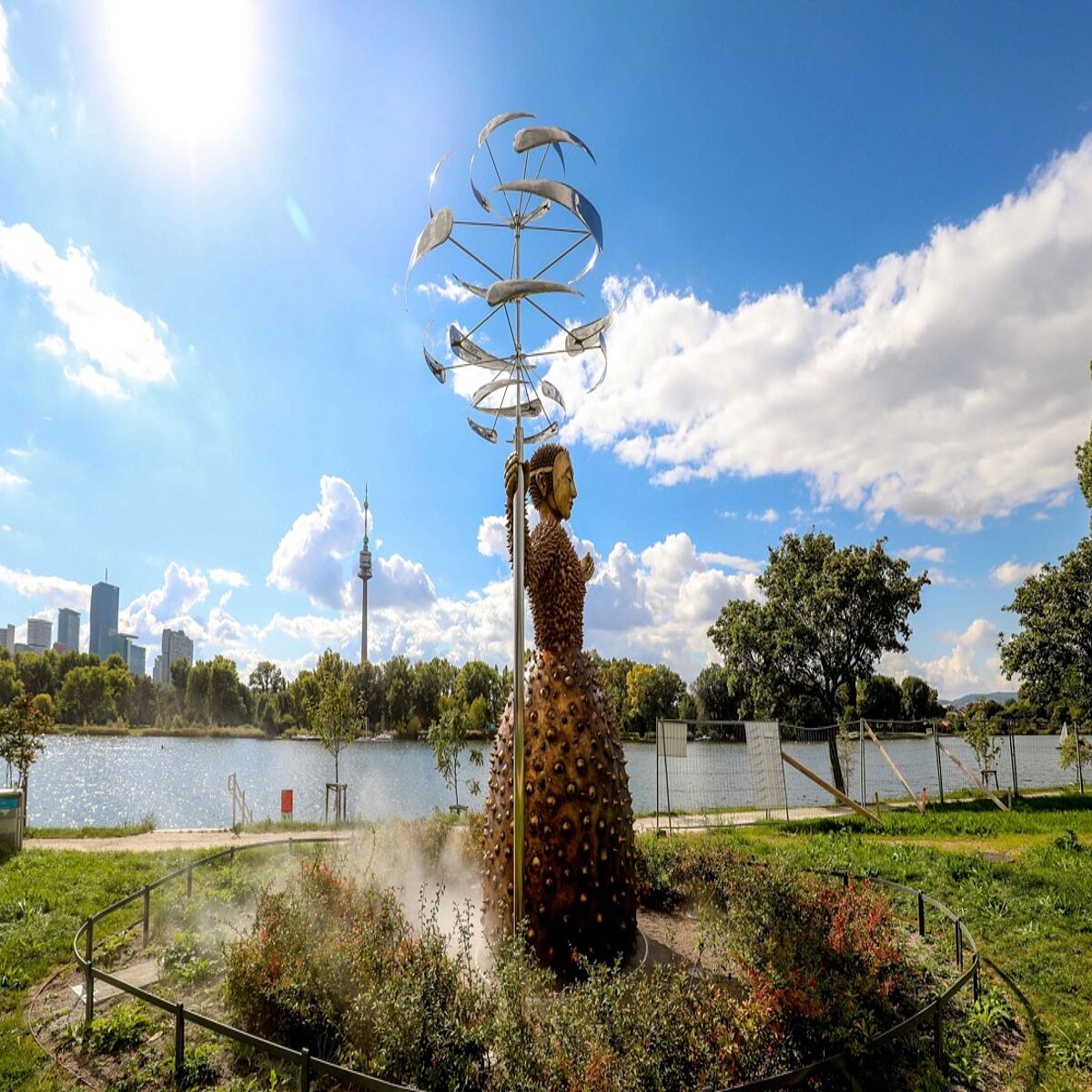 Die Wasserwächterin, eine Skulptur von vier Metern Höhe mit einem über fünf Meter hohen Windrad in der Hand befindet sich direkt am Ufer der Alten Donau. Ihre Präsenz wird durch ein kunstvolles Wasserspiel und raffinierte Lichteffekte unterstrichen, wodurch sie sowohl vom Wasser aus als auch von der Parkseite in voller Schönheit erstrahlt.