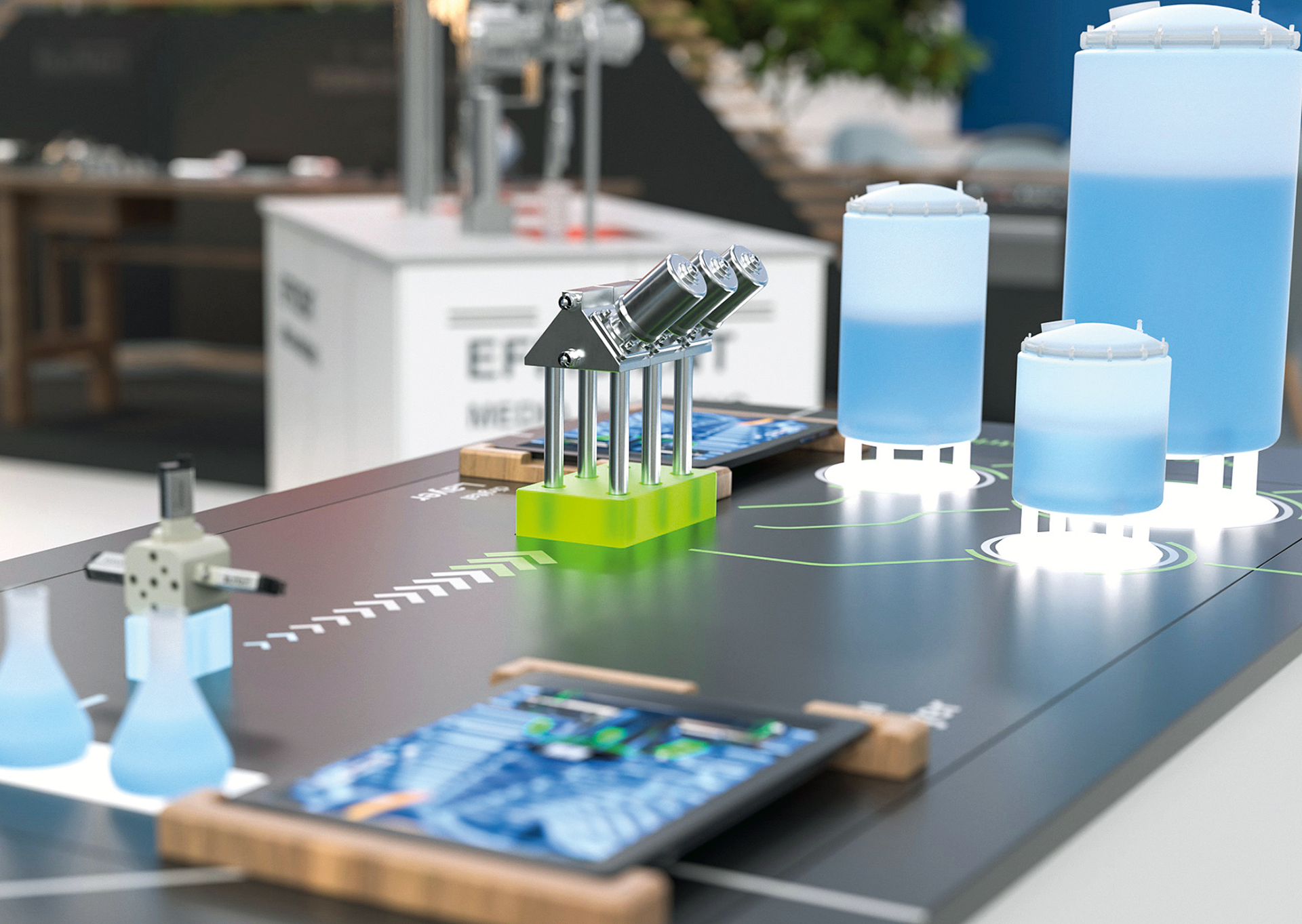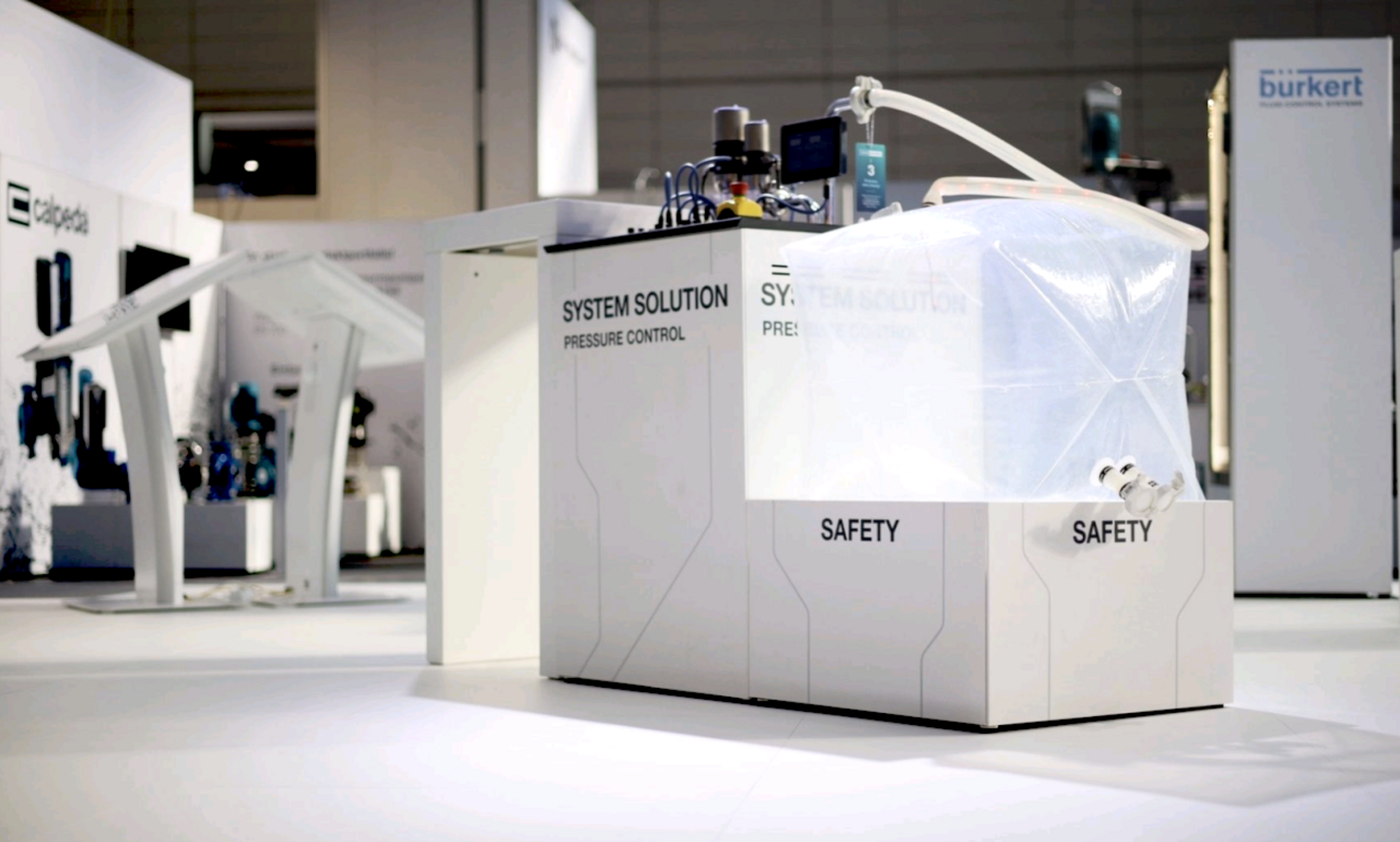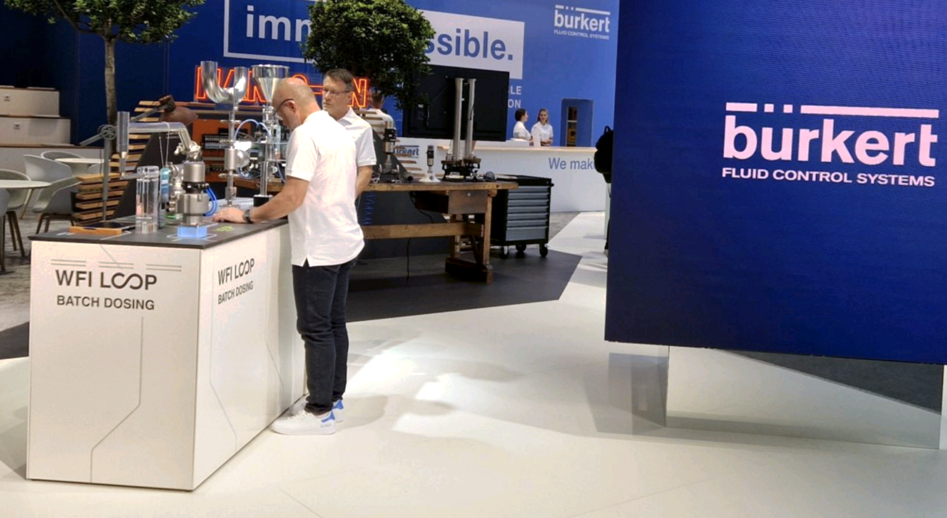 Wie innovative Fluidiklösungen dazu beitragen können, Pharma- und Biotech-Prozesse ökonomisch und ökologisch nachhaltiger zu gestalten, können Besucher des Bürkert Messestandes erleben. Präsentiert werden Themen wie z.B. Batch-Dosing für präzise, verlustfreie pharmazeutische Abfüllprozesse, die zudem eine moderne Benutzeroberfläche und eine automatische Nachlauf- bzw. Überlaufkorrektur bieten. Das Beispiel eines Chromatografie-Blocks zeigt, wie sich die gesamte Prozesskette vom Labor bis zur Fabrik skalieren lässt. Zudem gibt es die Möglichkeit, die Funktion fluidischer Komponenten selbst auszuprobieren. Wir durften für diese Messepräsentation die Expontate WFI Loop, Upscale und Bag Inflation entwickeln und fertigen, welche auf der Achema in Frankfurt erstmalig gezeigt wurden.