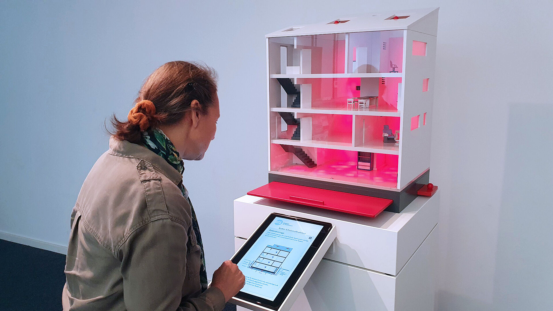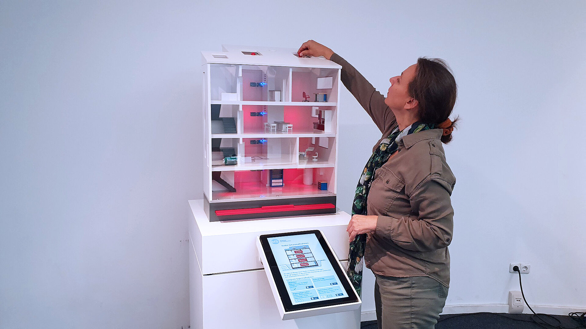 Das Modellhaus veranschaulicht den Eintritt des Edelgases Radon in ein Gebäude und die Verbreitung des Gases im Haus durch Lichteffekte. Durch Öffnen der Fenster, Einschalten der Lüftung sowie Einschieben einer Bodenplatte kann die Radonkonzentration verringert werden. Die reduzierten Radonmesswerte und weitere Informationen werden auf dem Display angezeigt.
