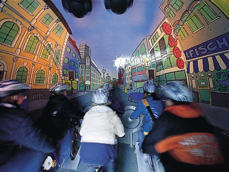 Auf einer rund 800 m2 großen Fläche macht Mercedes-Benz in verschiedenen Aktionsmodulen Verkehrssicherheit für Kinder erlebbar. Dabei wird Verkehrs-erziehung erstmals im Rahmen eines anspruchsvollen, sinnlich erfahrbaren „Themenparks“ mobil in Deutschland eingesetzt. In der Sinneskugel „Geschwindigkeit“ sind Kickboards installiert. Immer dann, wenn sich in dem auf die Innenwand der Kugel projizierten 3D-Film Gefahren-situationen aufbauen, sind die Kinder gefordert, zu bremsen. Über Kontakte an den Fußbremsen wird registriert, ob sich die Kinder korrekt verhalten haben. In der Sinneskugel „Umfeld“ sitzen die Kinder auf Tandems und achten auf nacheinander einfließende Gobos. Hat das Bild etwas mit dem Verkehrs-geschehen zu tun, müssen sie schnell den rechten oder linken Taster am Lenker drücken, je nachdem auf welcher Seite das Bild erschienen ist. Paarweise spielen die Kinder in der Sinneskugel „Zeichen“ gegen-einander. Hier müssen sie ähnlich wie beim Memory zusammenpassende Karten finden. Jedoch handelt es sich nicht um gleiche Abbildungen, sondern um Verkehrszeichen die den jeweiligen Situationen zuzuordnen sind. Eine drei Minuten dauernde, Hörreise ist in der Sinneskugel „Geräusche“ zu erleben. Dabei treten im Straßenverkehr vorkommende akustische Ereignisse auf, die den Motiv-Tastern zugeordnet werden müssen. Auf die Leinwand des Kugelkinos wird ein von einem Animateur gesteuerter „Fehlerfilm“ projeziert. Ziel ist es, den Kindern die pädagogisch sehr wirksame Chance zu geben, fehlerhaftes Verhalten anderer zu erkennen. Die erzielten Punkte werden bei allen Spielstationen auf Magnetkarten erfasst, die am Ausgang ausgewertet werden. Die Tagesbesten und die Städtesieger können im Internet abgerufen werden.