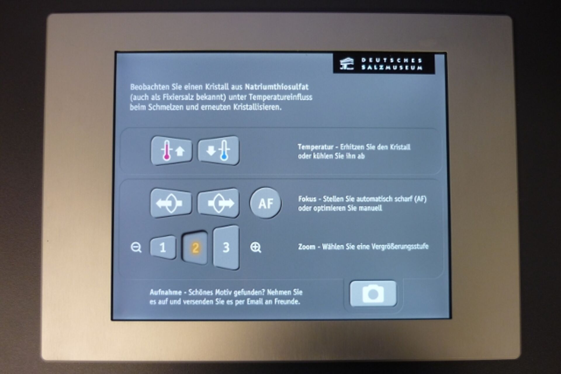 Die Besucher können Salzkristalle unter polarisiertem Licht und mit Hilfe eines Videomikroskops auf einem großen 32“ großen LCD Bildschirm wachsen und schmelzen sehen. Das Wachstum und das Schmelzen der Kristalle wird durch das polarisierte Licht in den schillernsten Farben sichtbar.