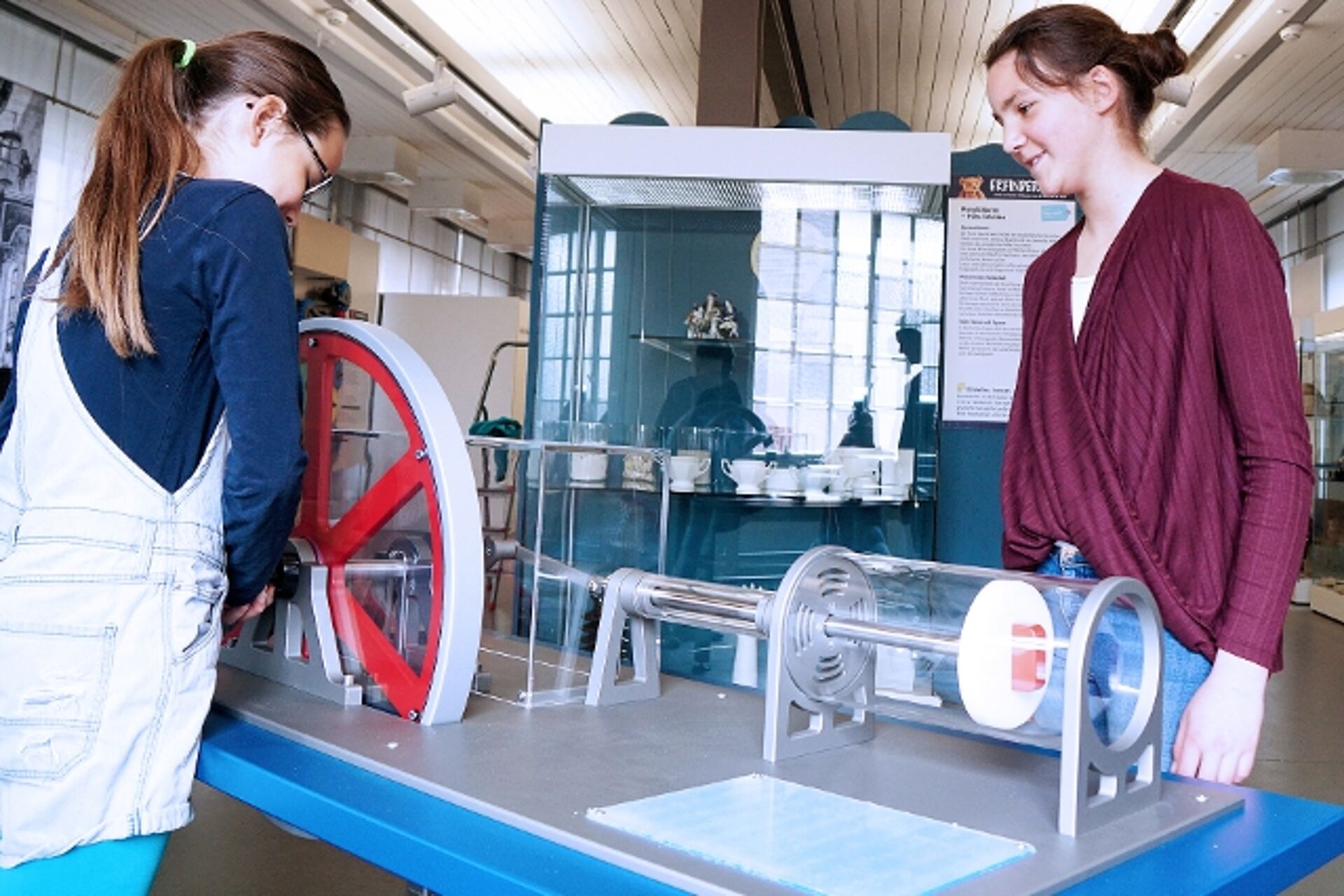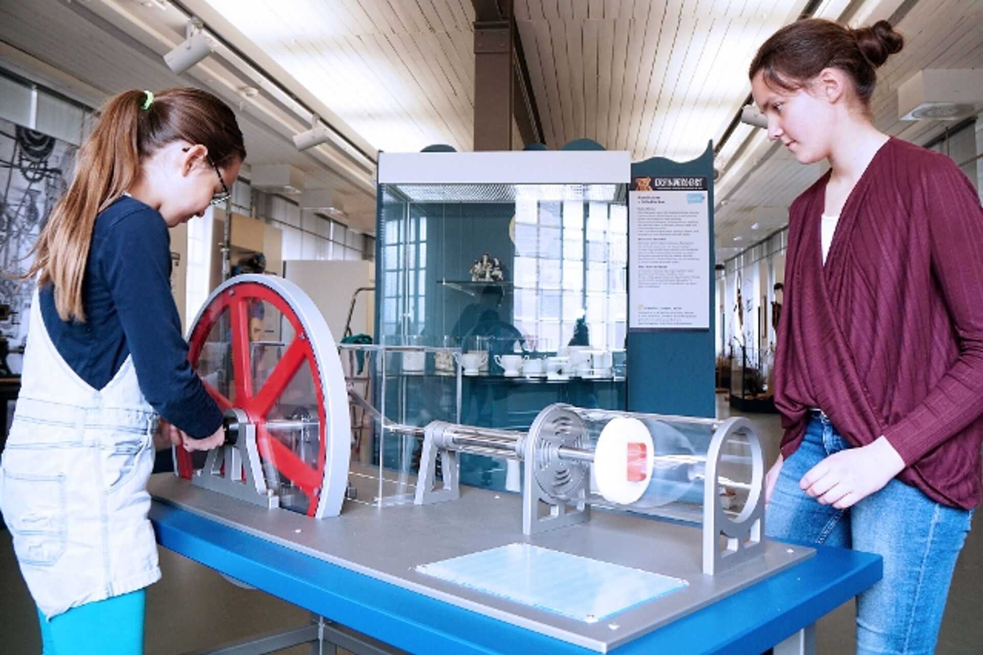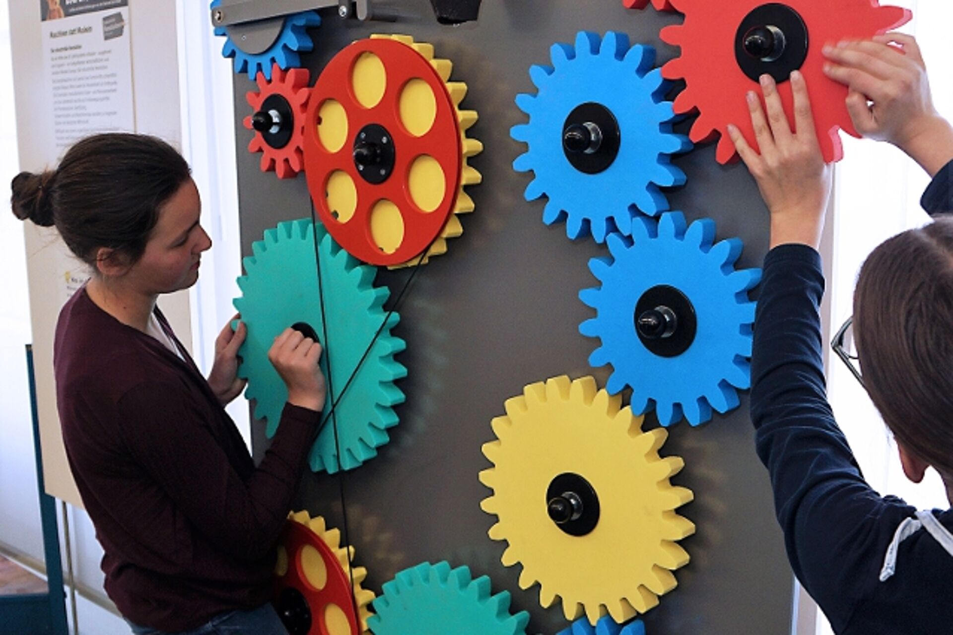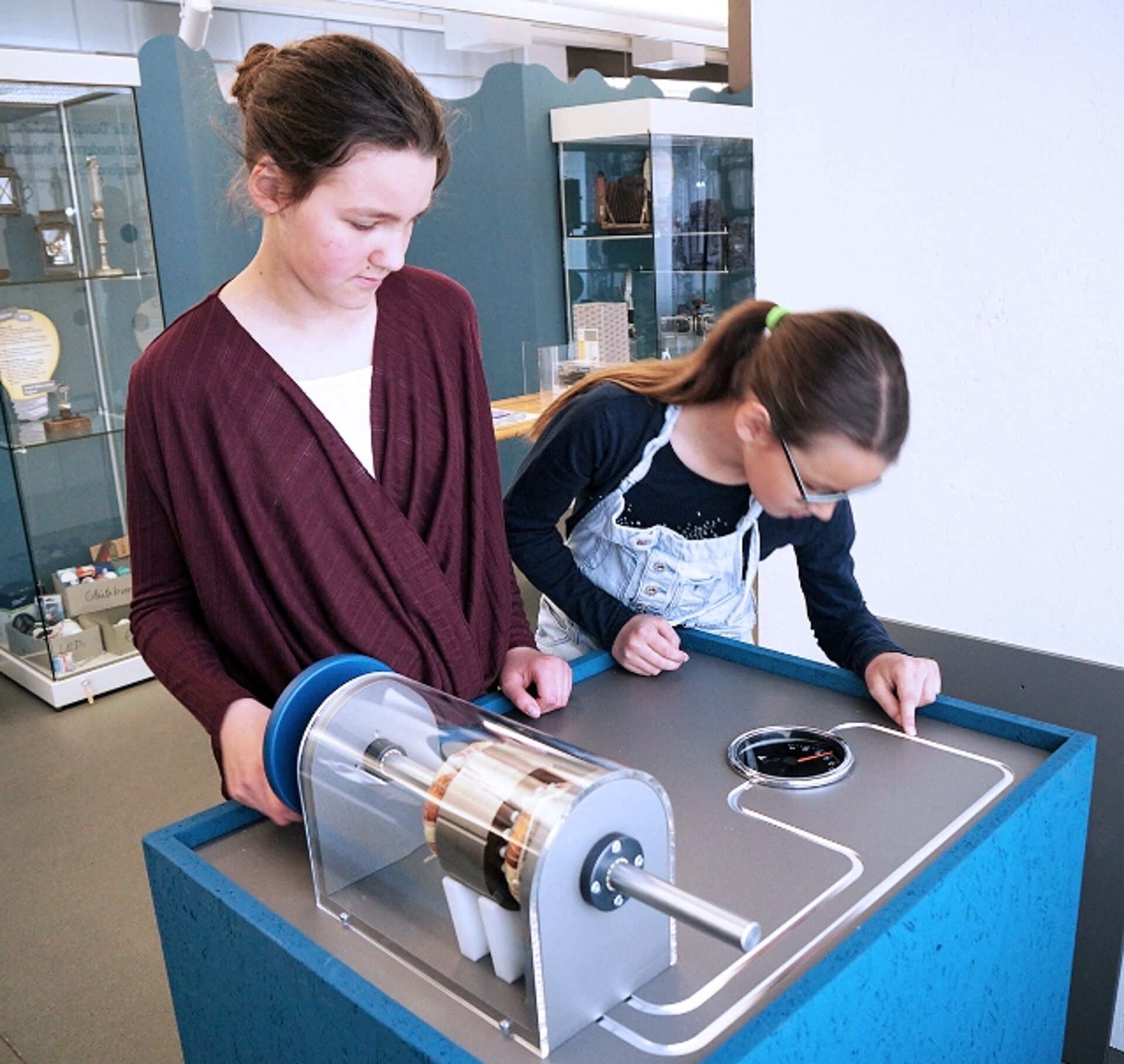 An spannenden Mitmachstationen darf nach Herzenslust ausprobiert, gekurbelt, gedreht und getüftelt werden. Neugierige Besucher setzen eine gläserne Dampfmaschinenmodell in Bewegung, erproben ihre Muskelkraft an einer Handmühle oder lernen an einer Binär-Uhr, wie sich Computer mit Nullen und Einsen verständigen. Hüttinger hat für Erfindergeist interaktive Exponate entwickelt und gebaut.