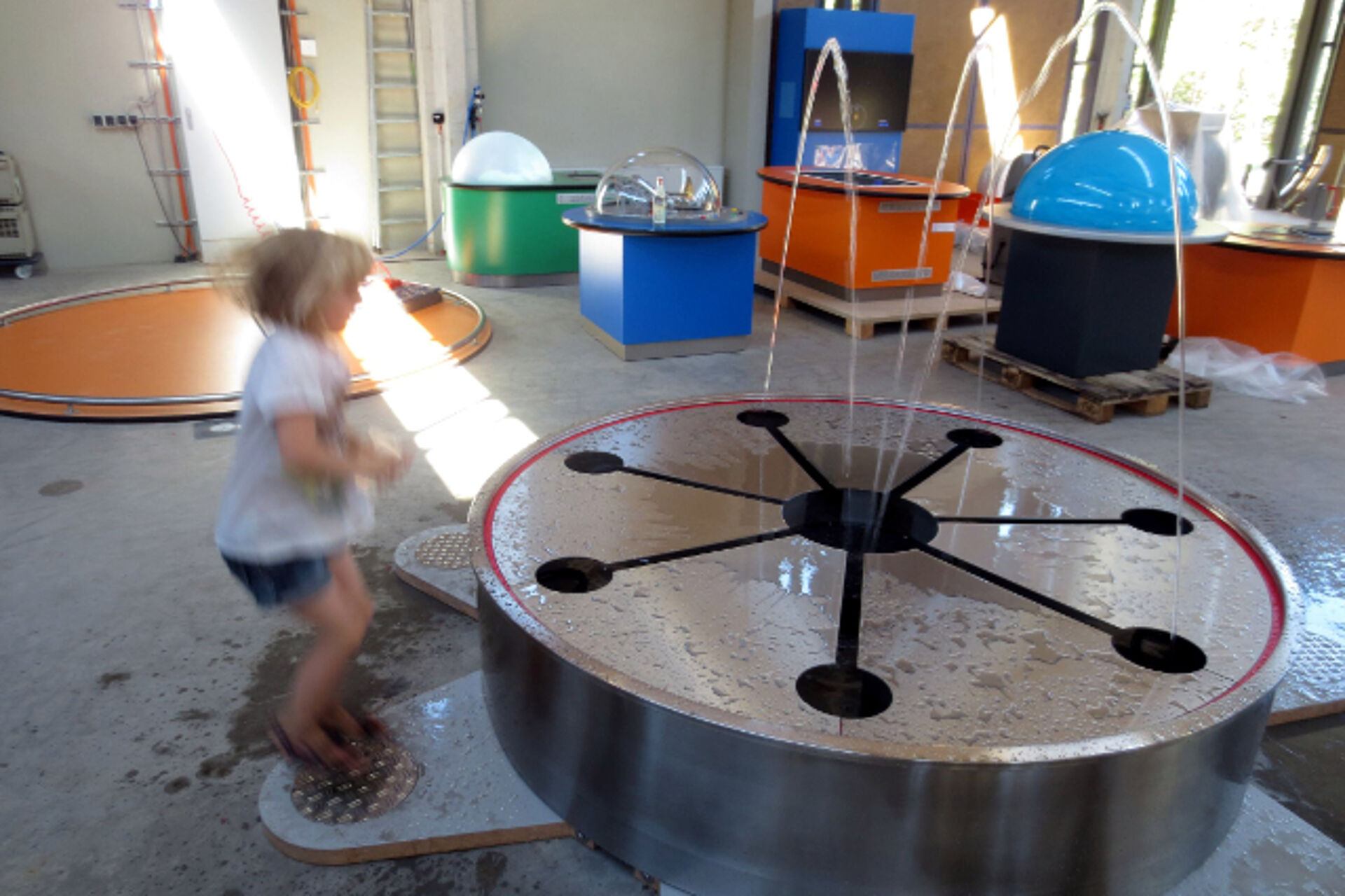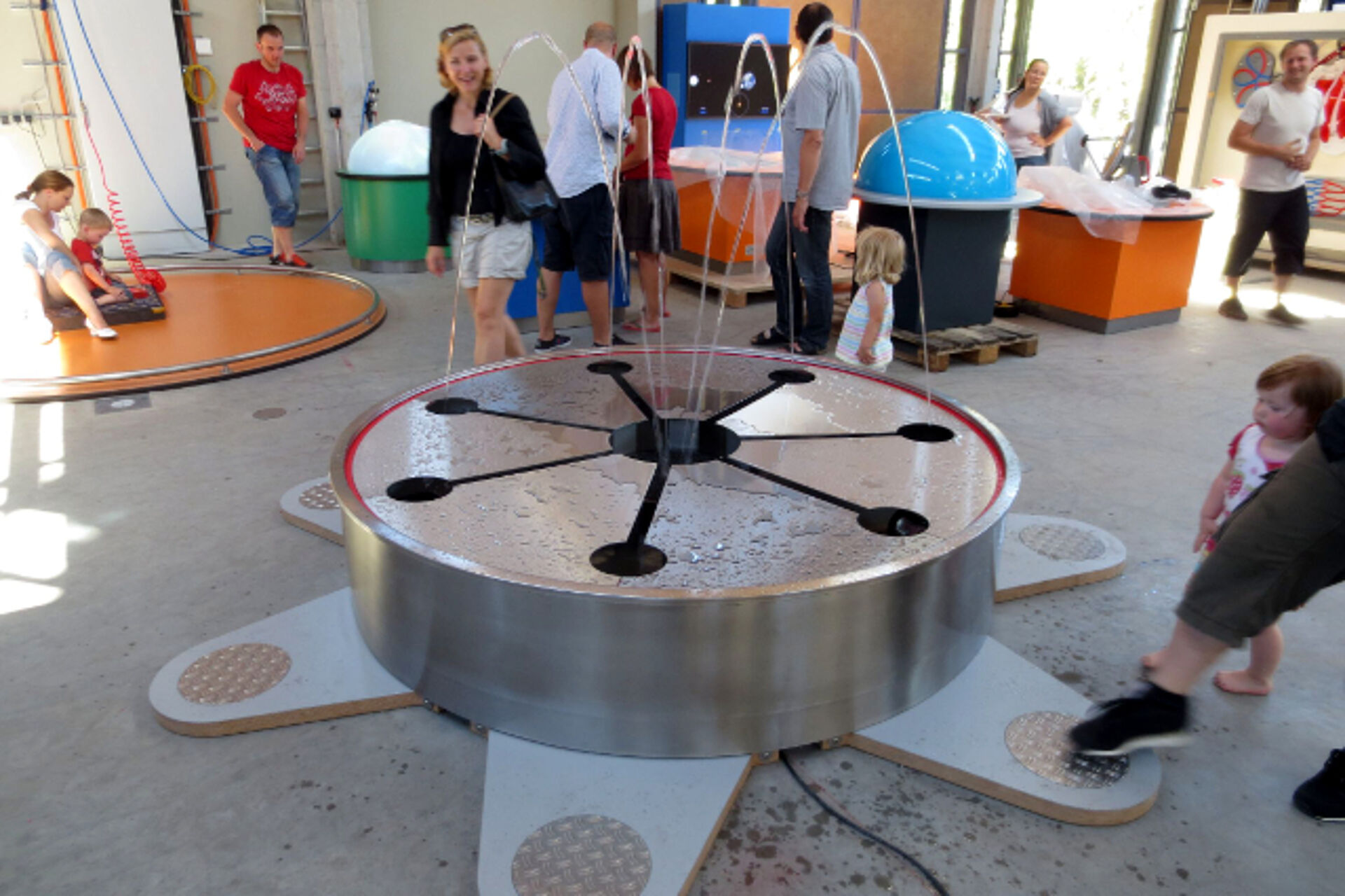 Betritt man eines der Trittelemente, schießen unvermittelt Wasserstrahlen in die Höhe. Wechselt man dann auf ein anderes, gehen einige Fontänen aus und stattdessen andere an. Es ist gar nicht so einfach, das Prinzip herauszubekommen, denn nun beginnt erst die eigentliche Aufgabe: Man soll es nämlich schaffen, dass alle sieben Fontänen gleichzeitig aktiviert sind.