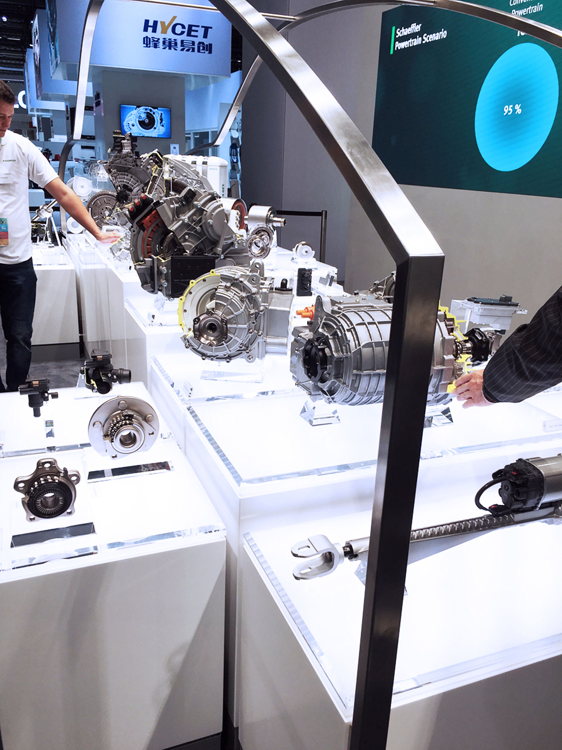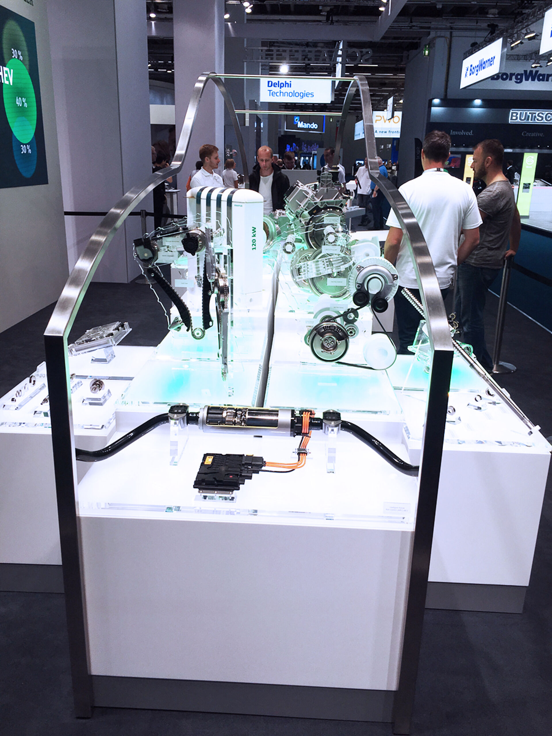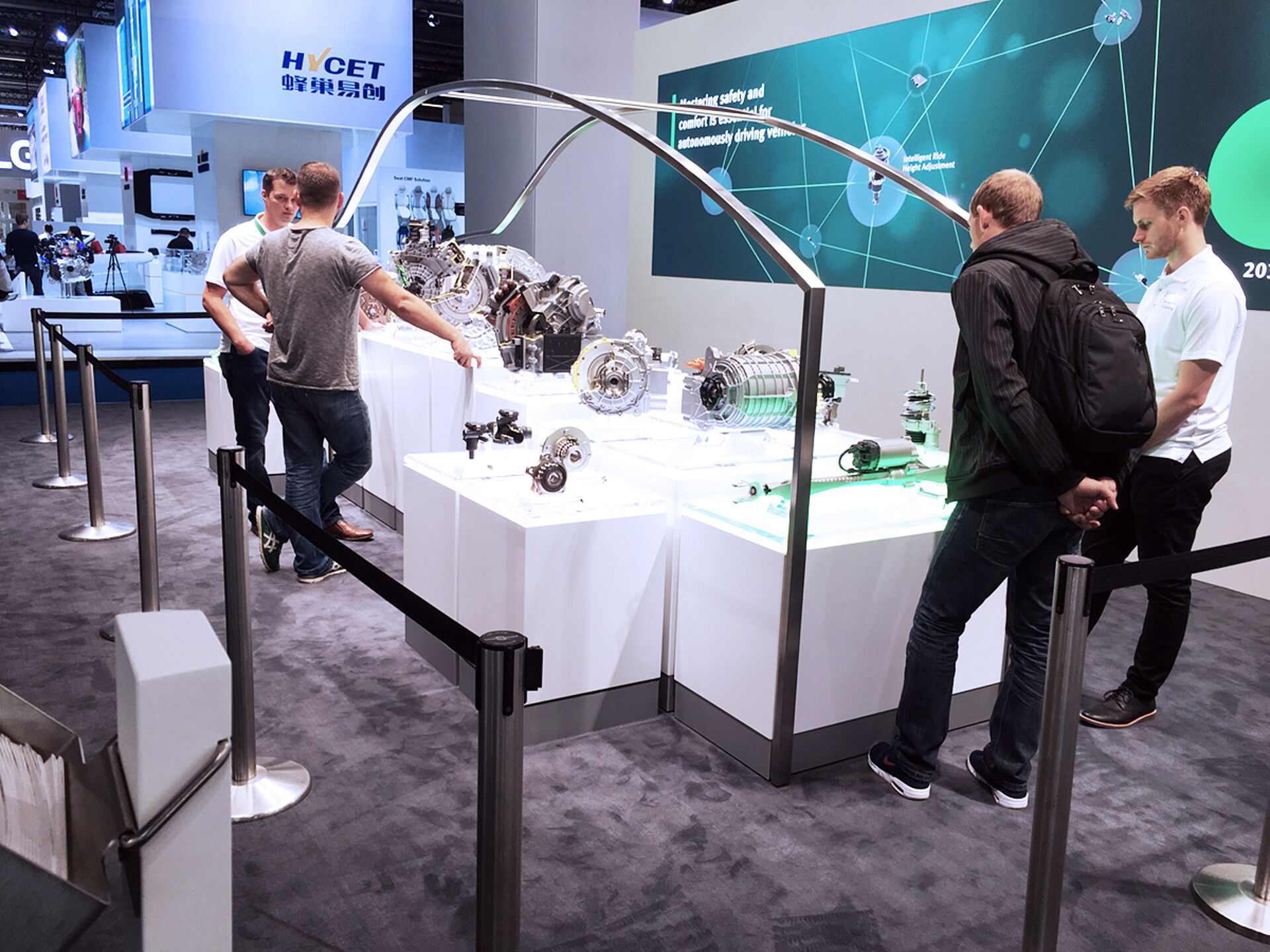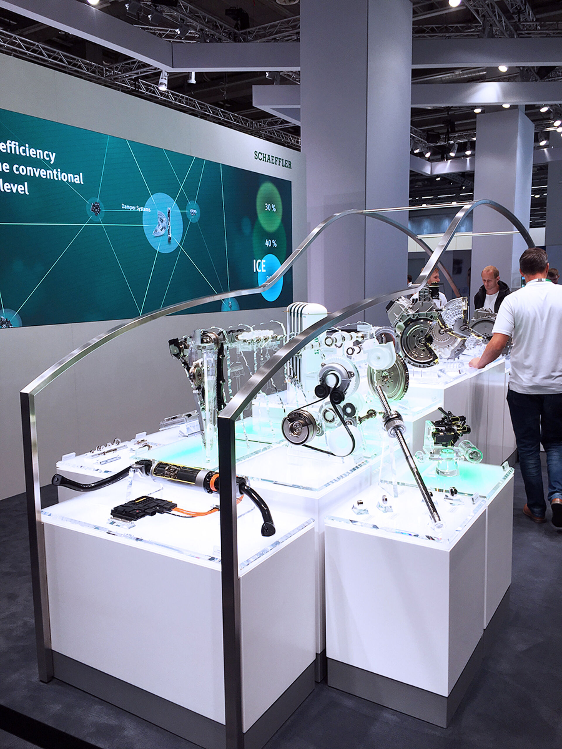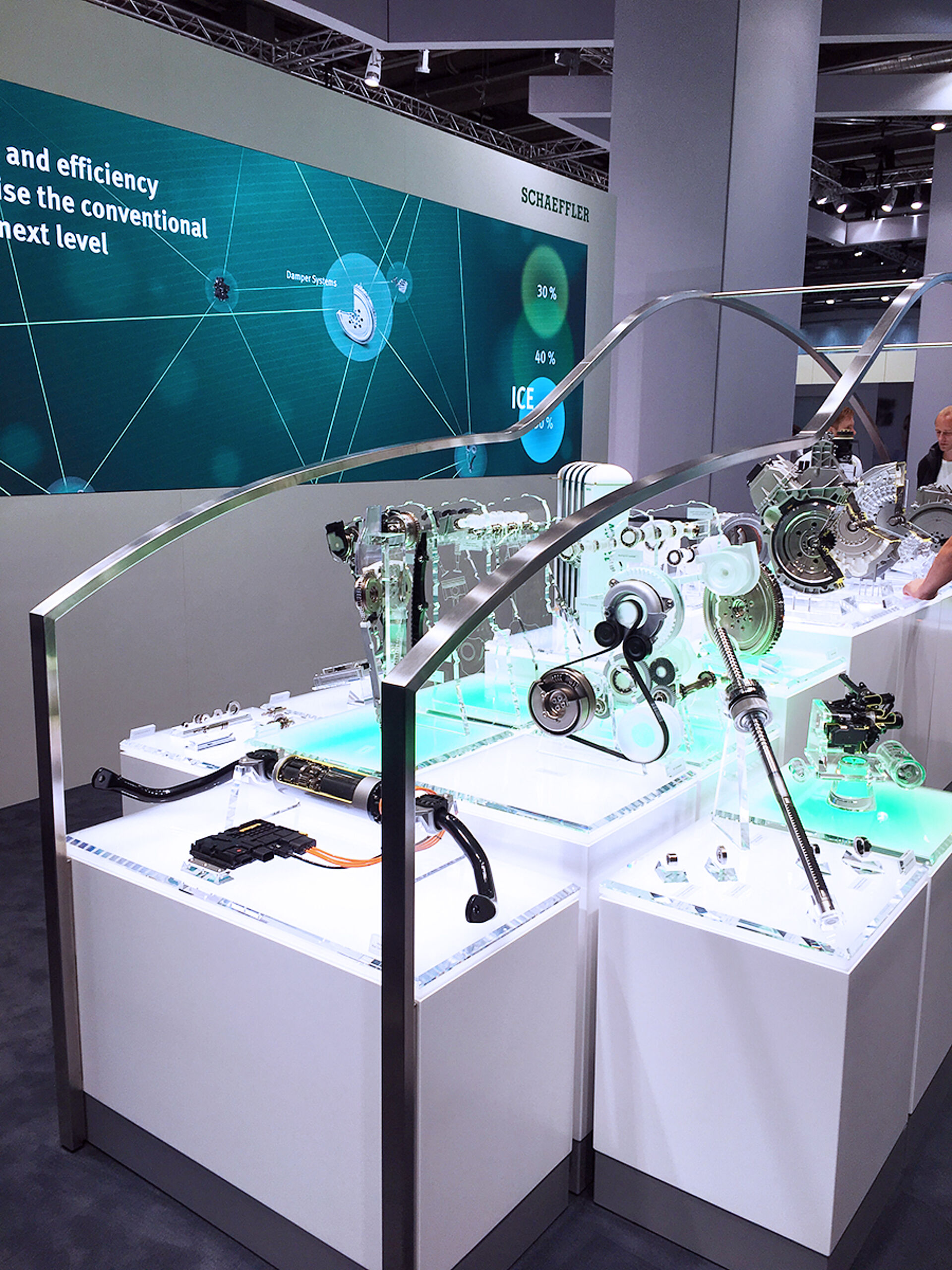 Das neue Automotive OEM Hauptexponat präsentiert das Produktportfolio aus den Bereichen Motor, Getriebe, E-Mobilität und Chassis, entlang eines virtuellen Antriebsstrangs und innerhalb einer Autosilhouette. An Multitouchtables können vertiefende Informationen abgerufenwerden. Die Unterleuchtung der jeweiligen Produkt Cubes wechselt korrespondierend der Inhalte an der Videowand dahinter von Weiss zu Grün.