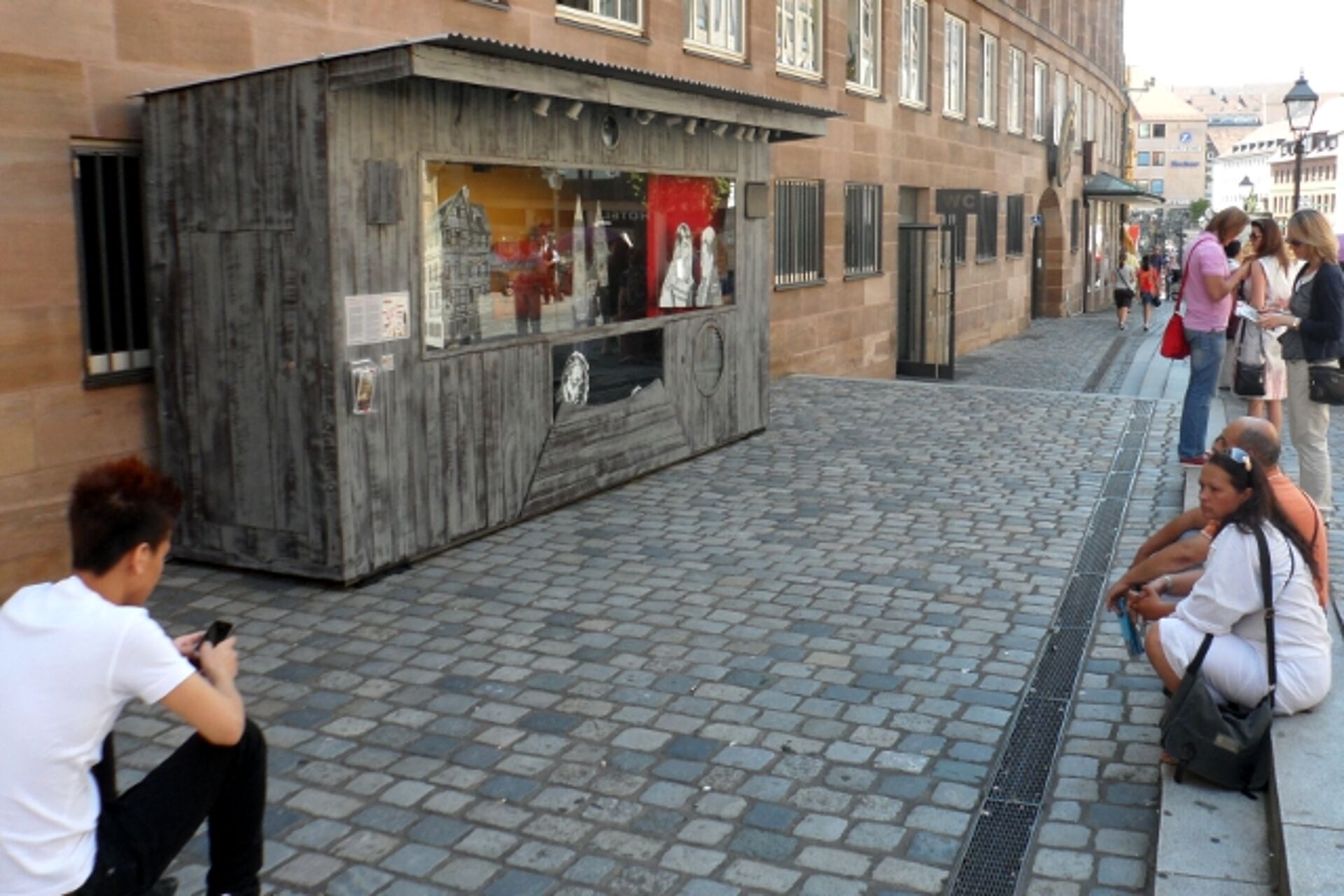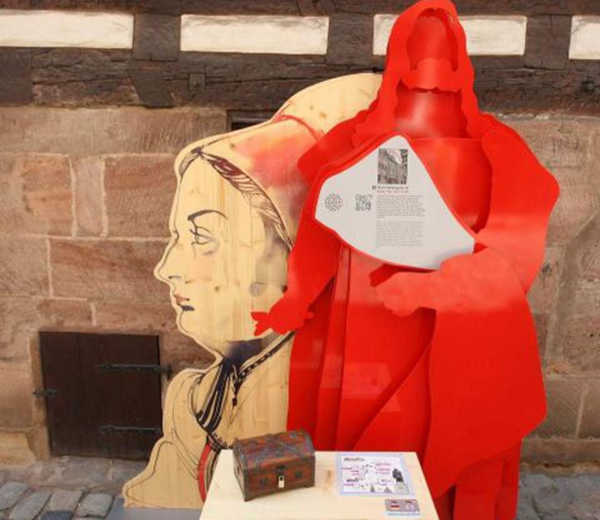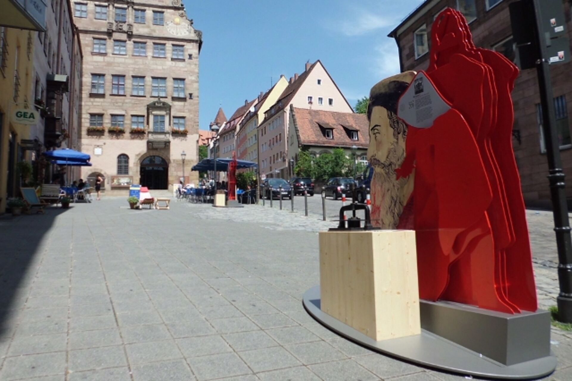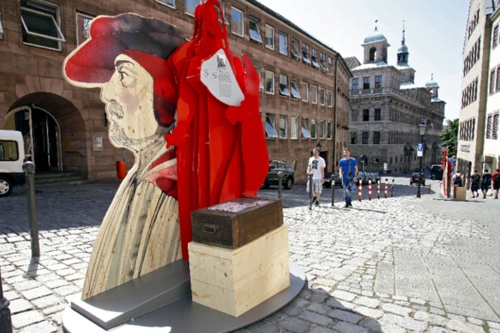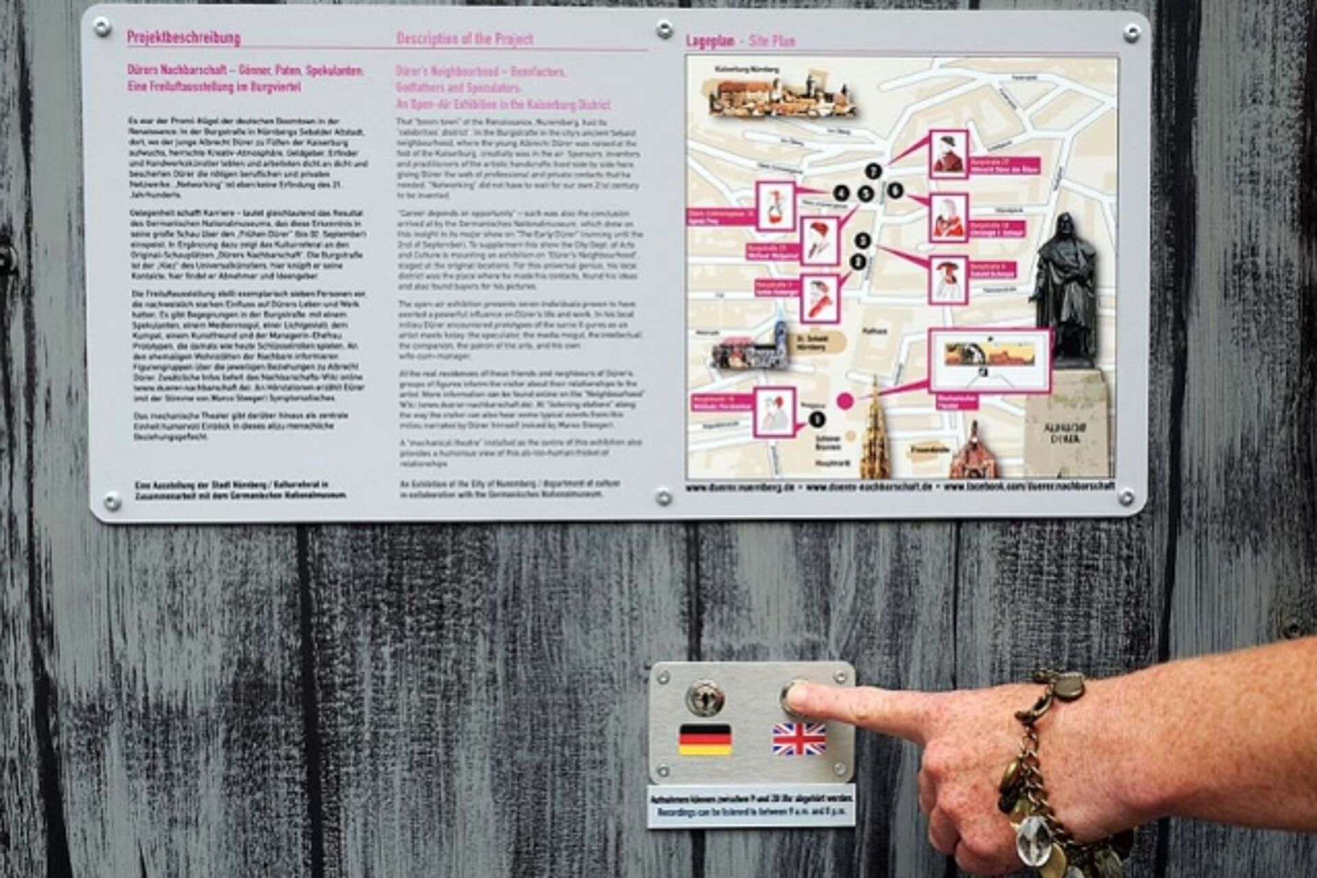 Für dieses Projekt wurden sieben Nachbarn Albrecht Dürers, stellvertretend für viele Bewohner des Nürnberger Burgviertels, ausgewählt. Sieben erzählende Skulpturen-Stationen sind als „Stadtgeflüster” gedacht und bieten Begegnungen entlang der Burgstraße: mit einem Spekulanten, einem Medienmogul, einer Lichtgestalt, dem Kumpel, einem Kunstfreund und der Managerin-Ehefrau. Die überlebensgroßen Dürer-Silhouetten weisen den Weg. Als zentrale Einheit gibt ein mechanisches Theater in einer achtminütigen Aufführung humorvoll Einblick in dieses allzu menschliche Beziehungsgeflecht. Dürers Nachbarschaft ist bis zum 2. September 2012 in Nürnbergs Burgviertel zu sehen.