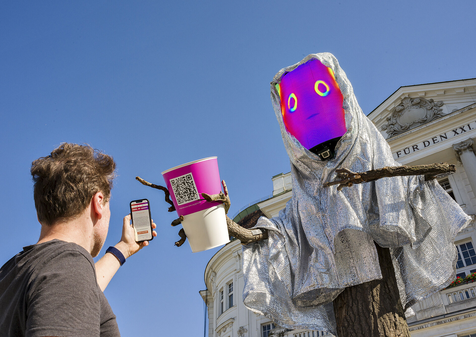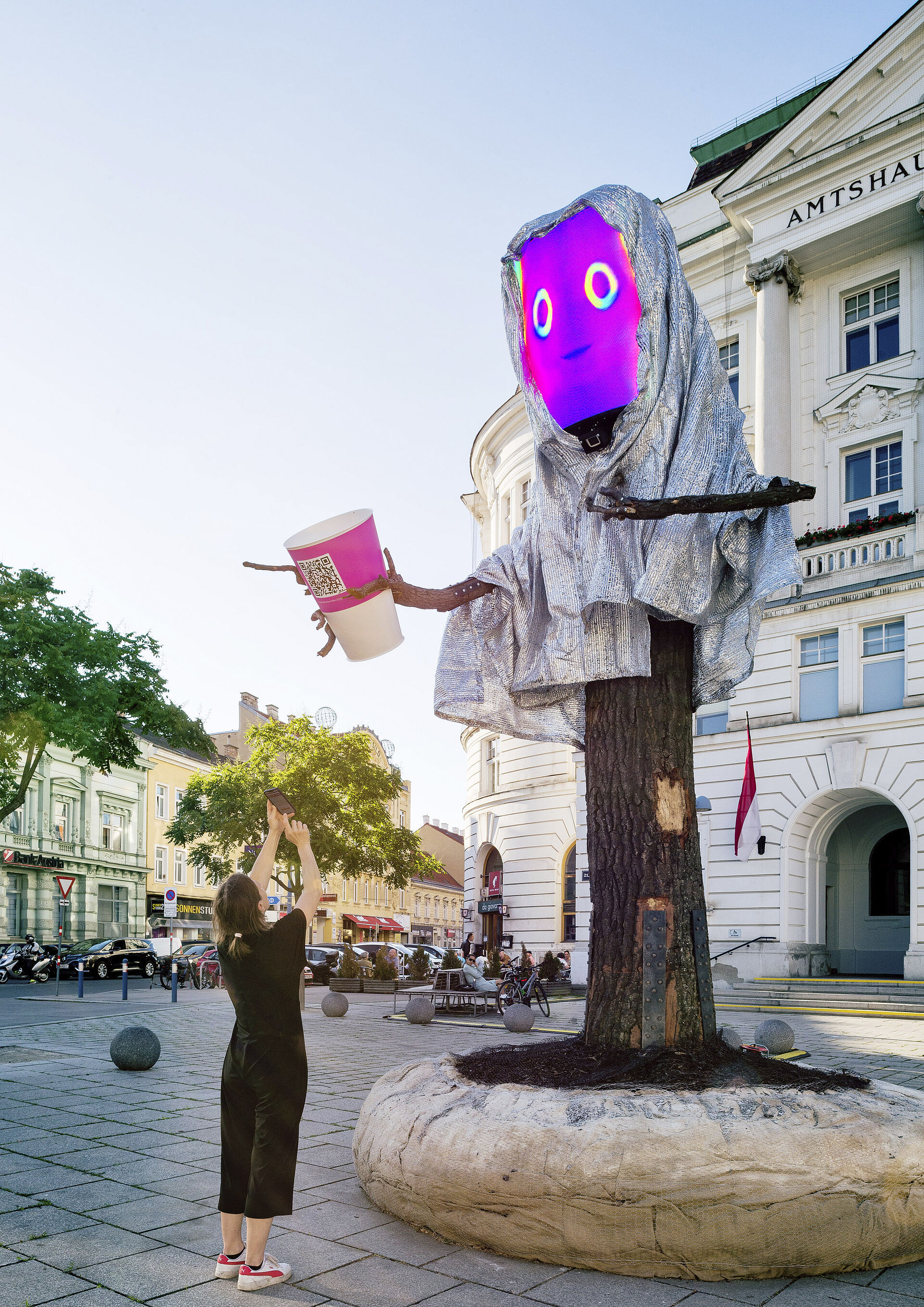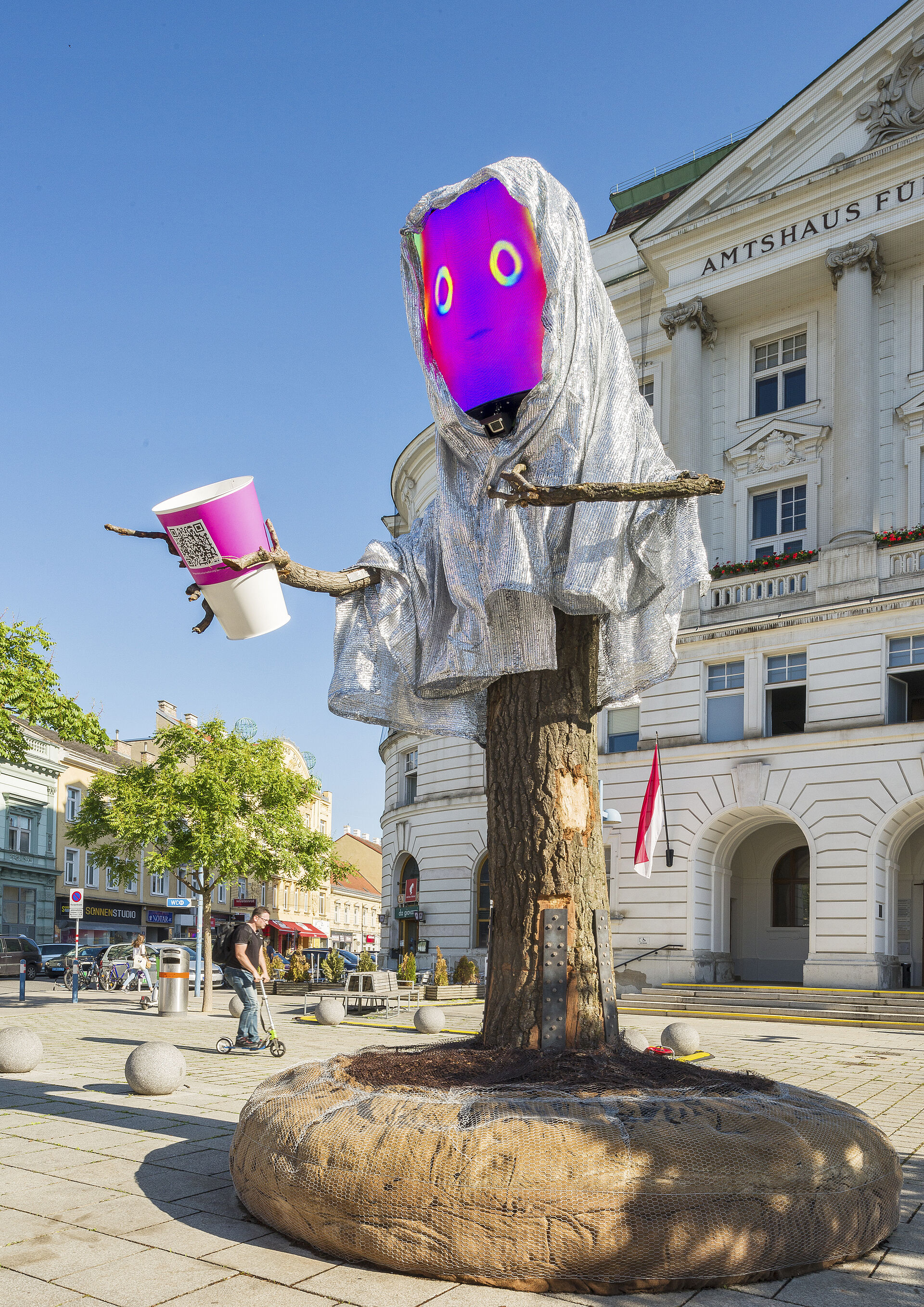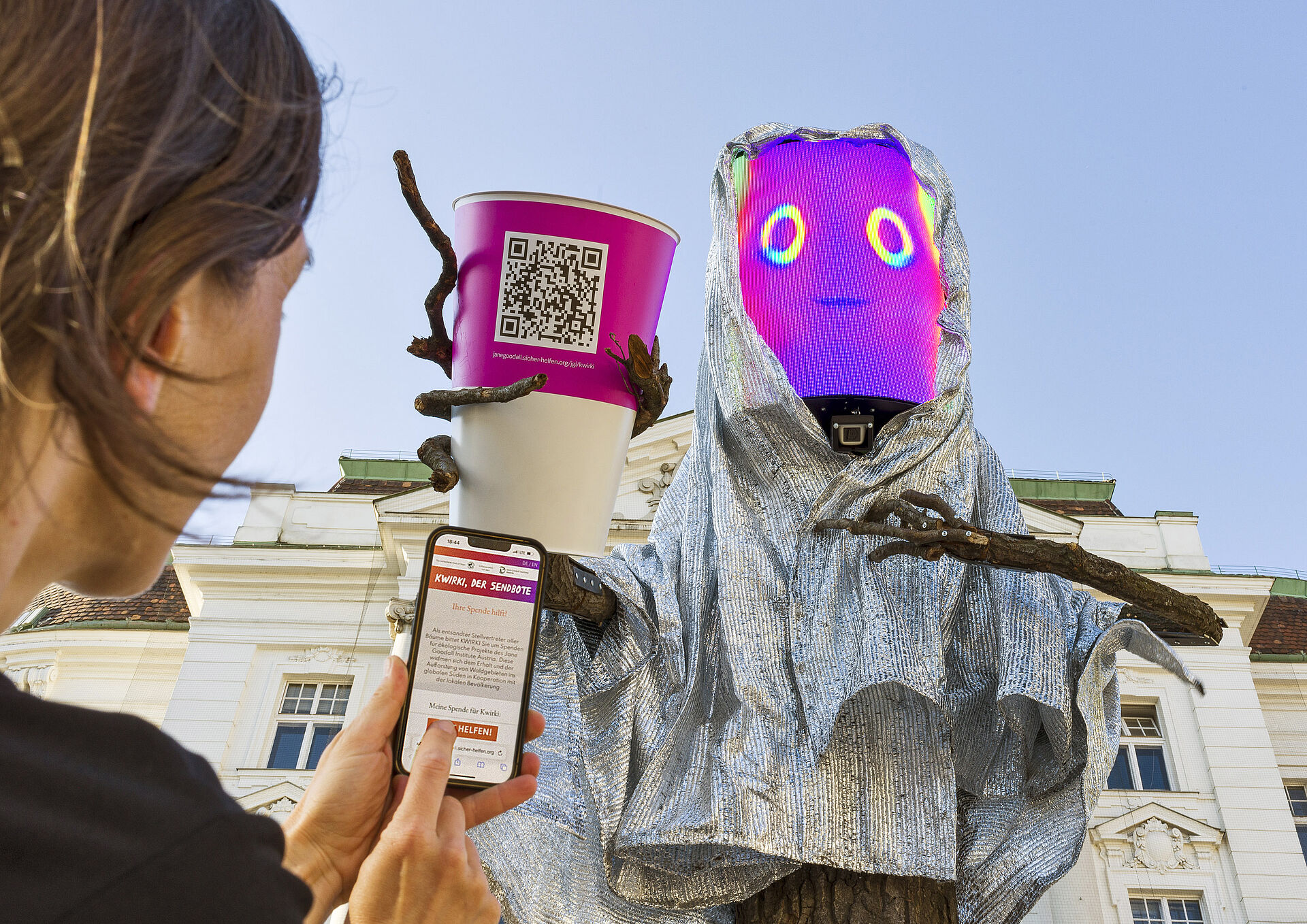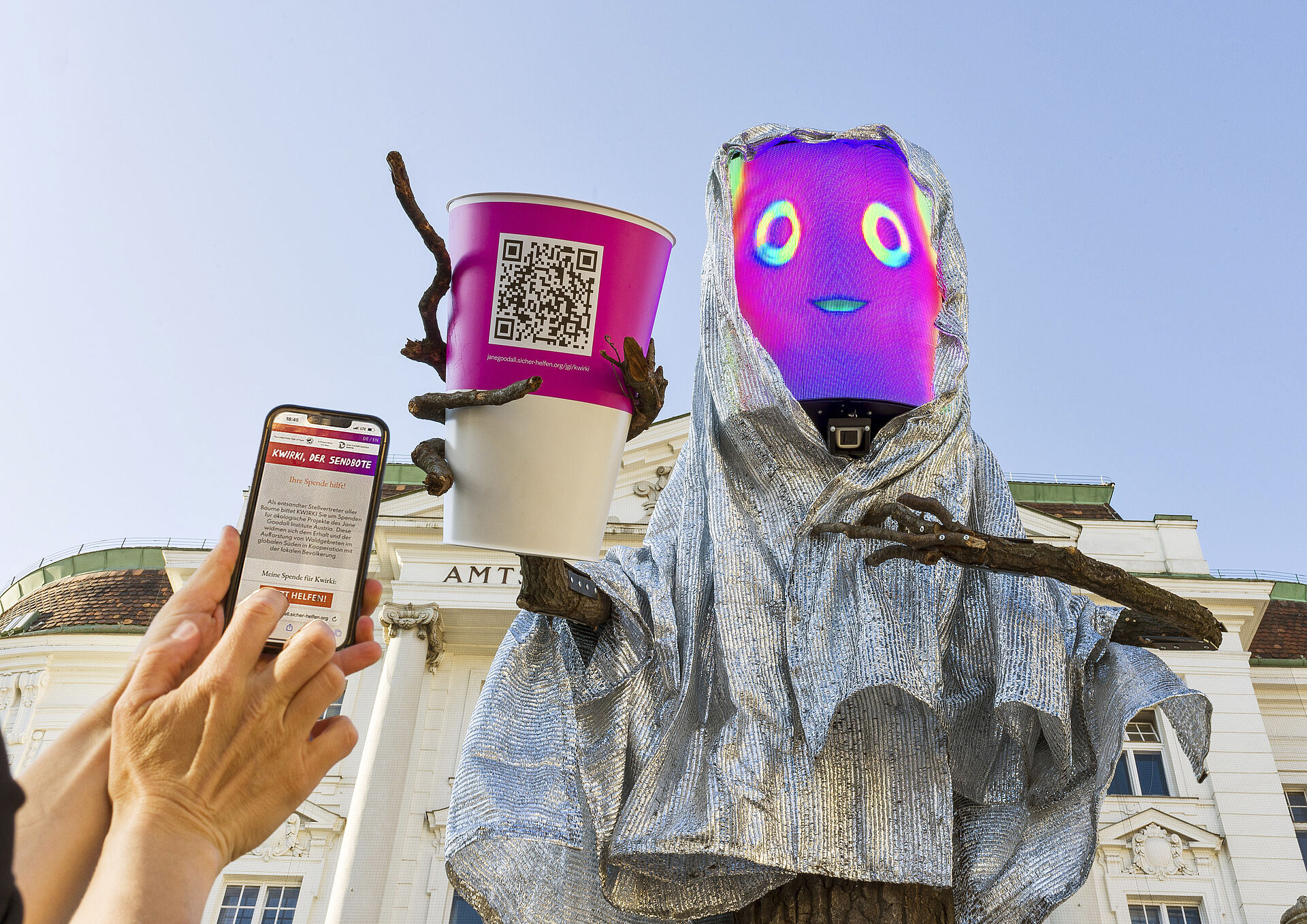 KWIRKI ist ein von der Weltgemeinschaft der Bäume entsandter Stellvertreter. Er ist gekommen, um die Bewohner Wiens um Hilfe zu bitten: Er und seine Mitbäume bitten die Menschen innig darum, ihr Handeln zu überdenken und aufzuhören Dinge zu tun, durch die Bäume Schaden erleiden. Direkt vor Ort können Passanten via QR Code ökologische Aufforstungsprojekte des Jane Goodall Institute Austria mit einer Spende unterstützen.