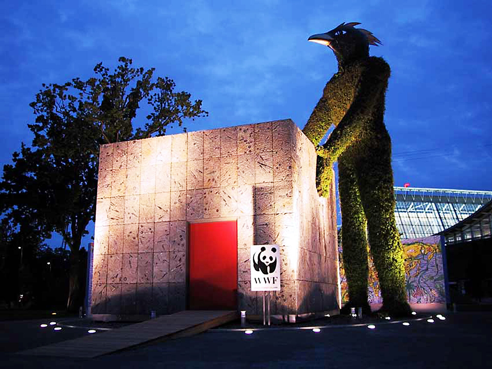 André Heller konzipierte gemeinsam mit Mathis Barz einen Pavillon, welcher von einem 14m hohen Erdgeist bewacht wird, der Flora und Faune symbolisiert. Die Verkleidung des Pavillons, mit Versteinerungen aus der marokkanischen Sahara, stellt vom Aussterben bedrohte Tierarten dar. Der WWF®-Pavillon wurde von den Besuchern zum Wahrzeichen dieser EXPO gekührt. Hüttinger hat den Pavillon und den Erdgeist gefertigt.